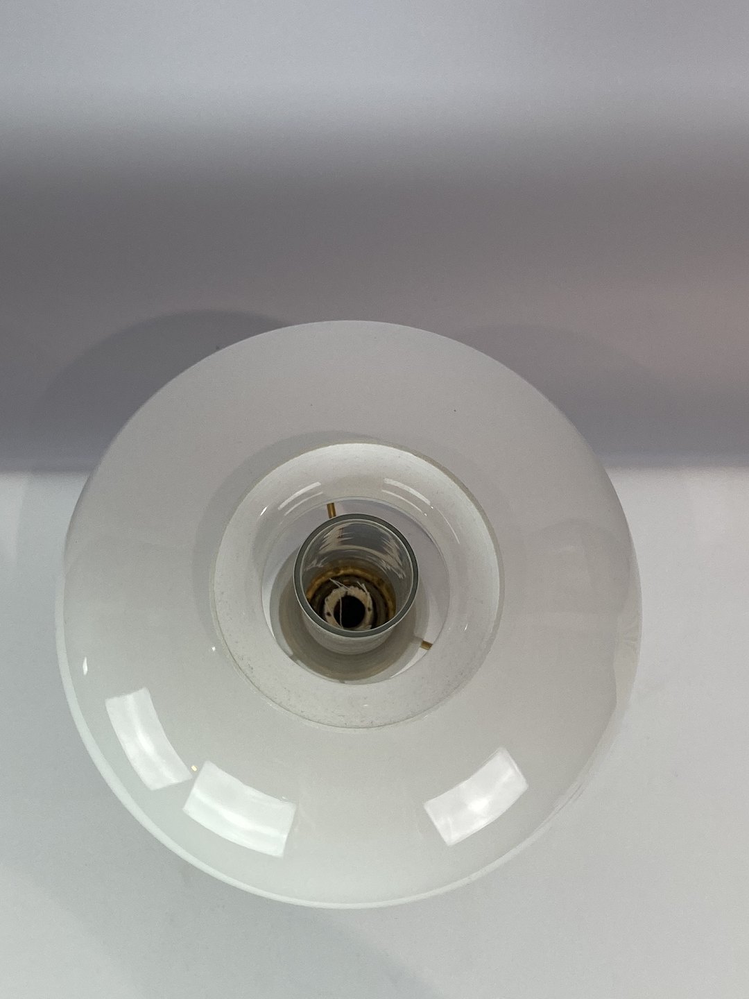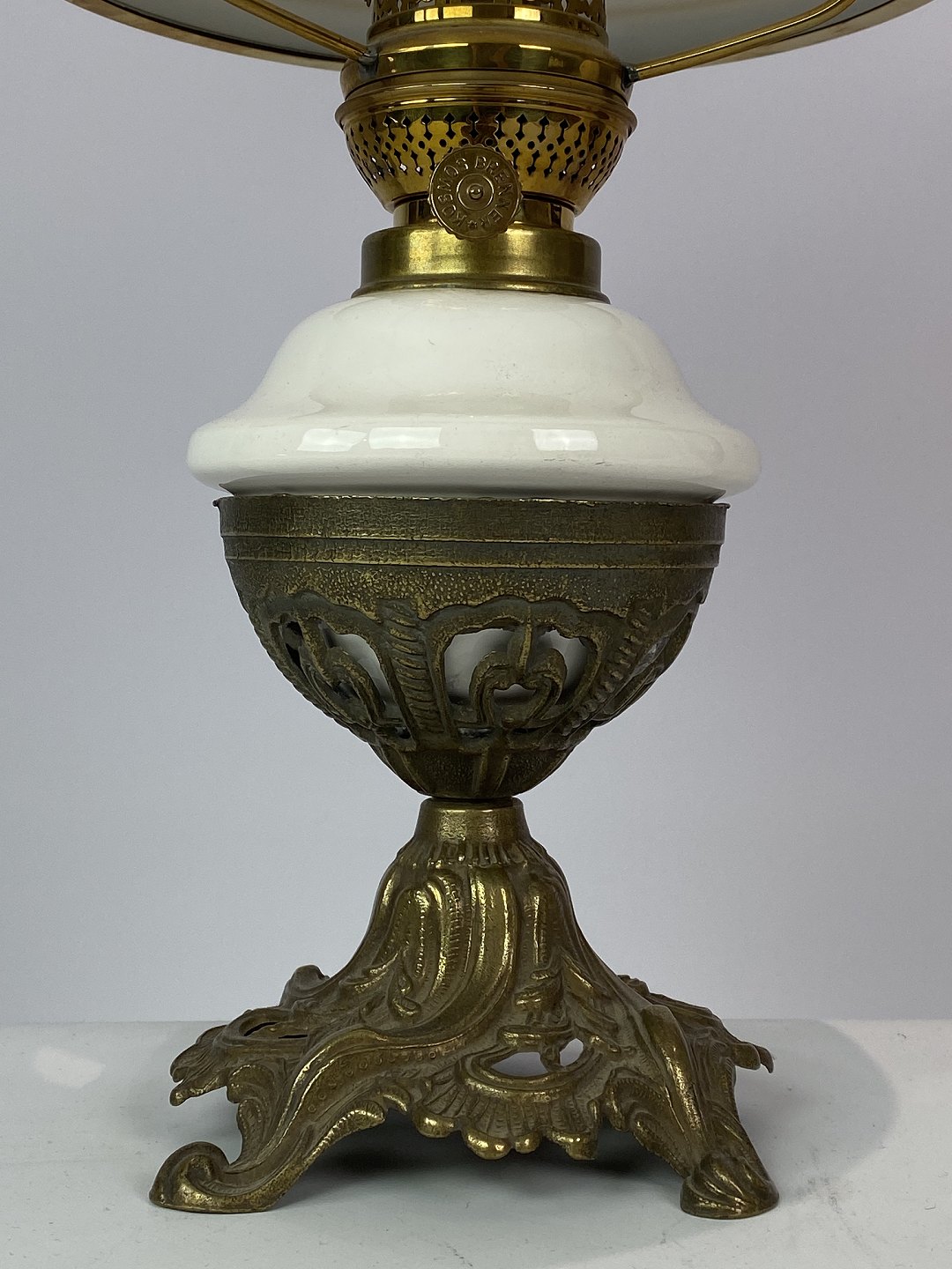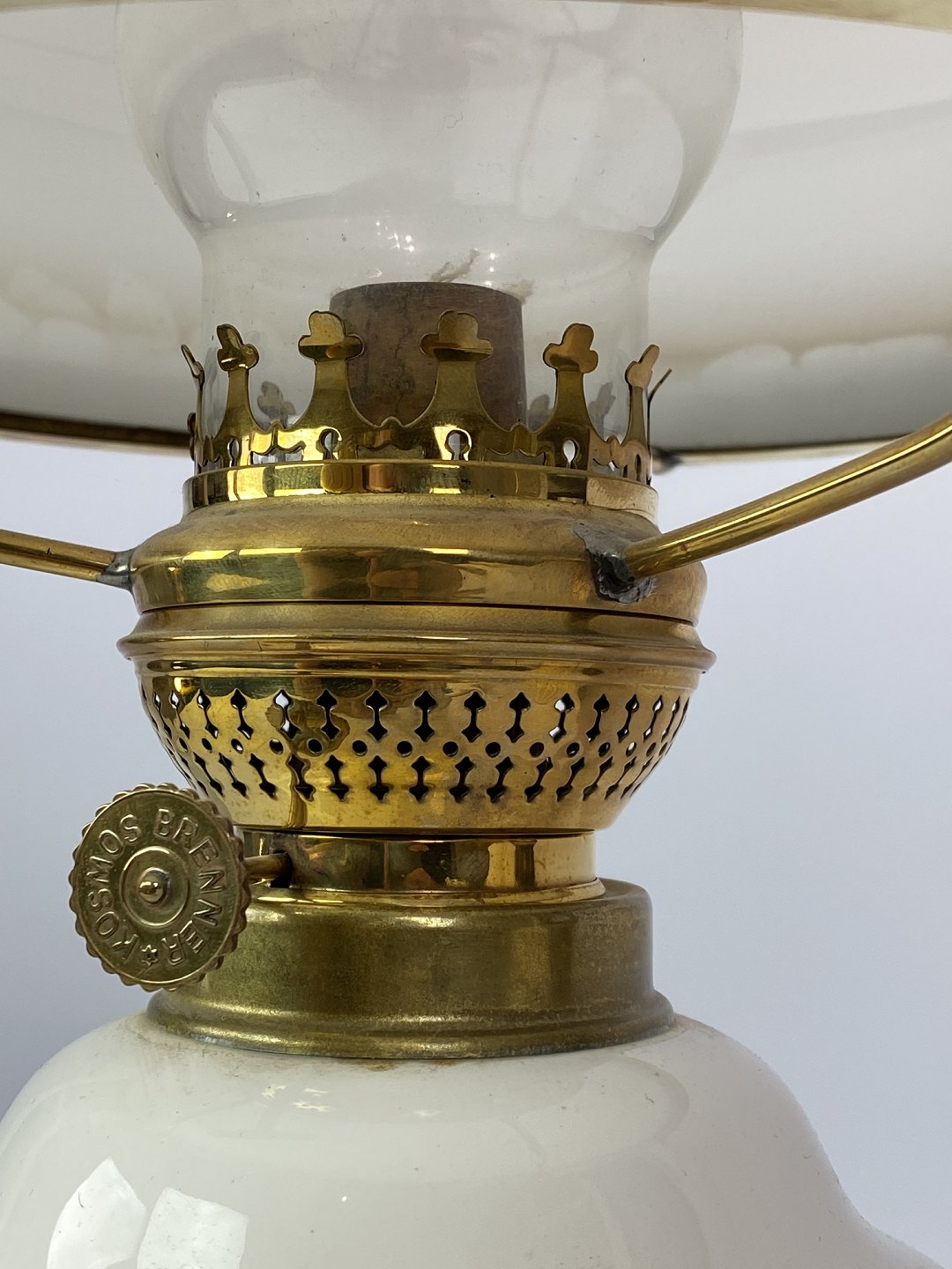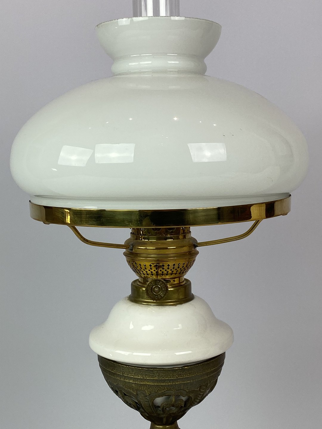 SolgtPetroleumslampe af patineret messing med skærm af hvid opal glas fra omkring 1860. Lampen er i flot antik stand.