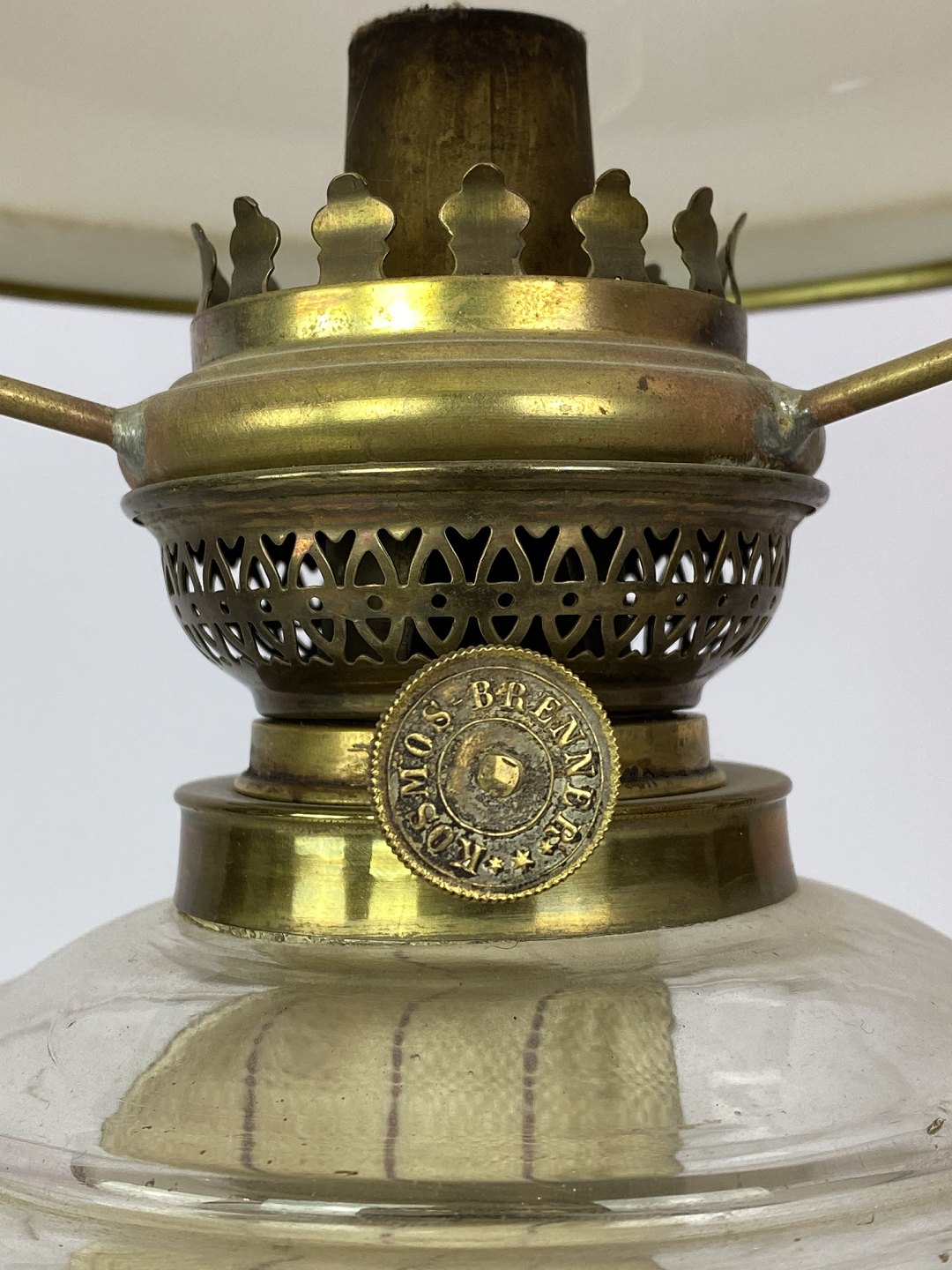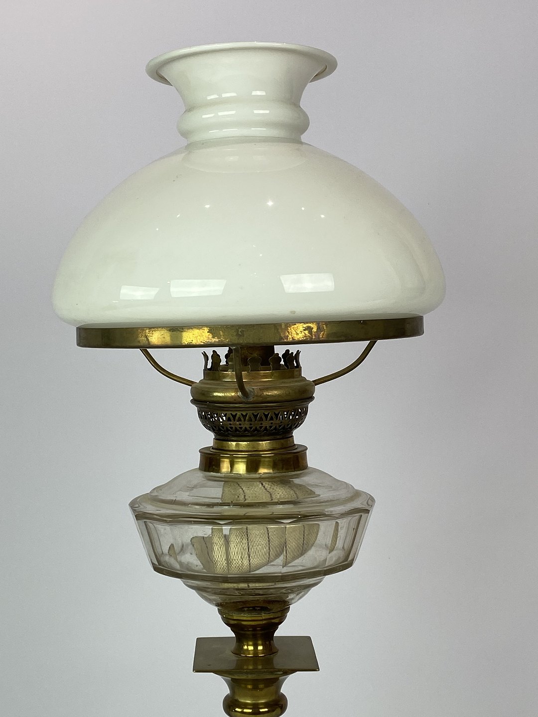 Petroleumslampe af messing med skærm af hvid opal skærm fra omkring 1860.