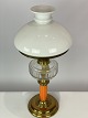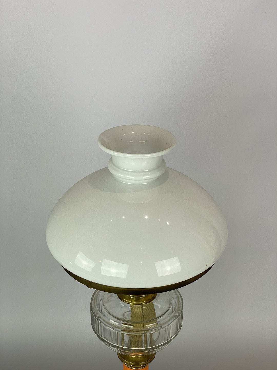 Petroleumslampe af messing med hvid opal glas skærm, samt med orange glas stamme, fra omkring 1860.