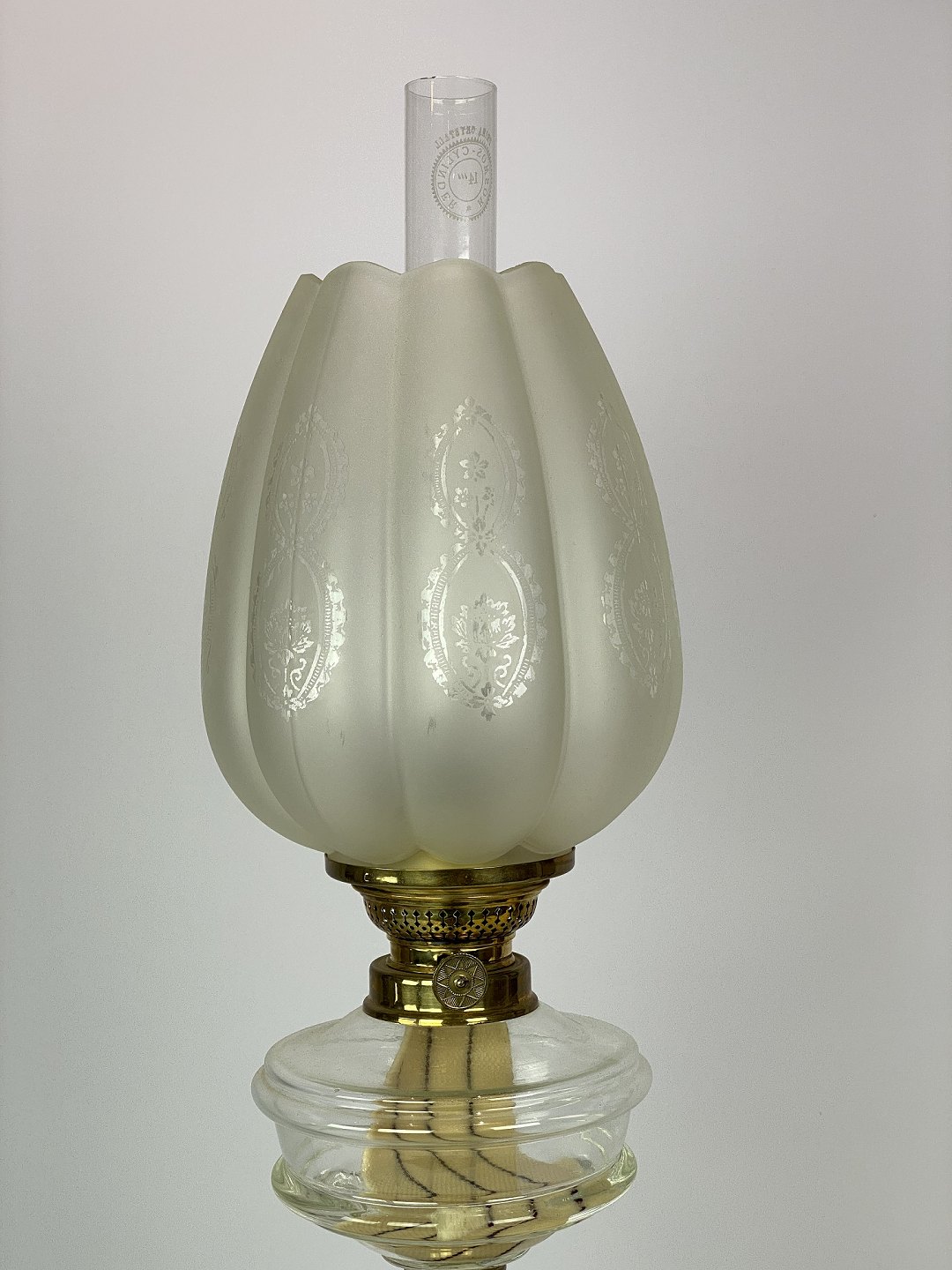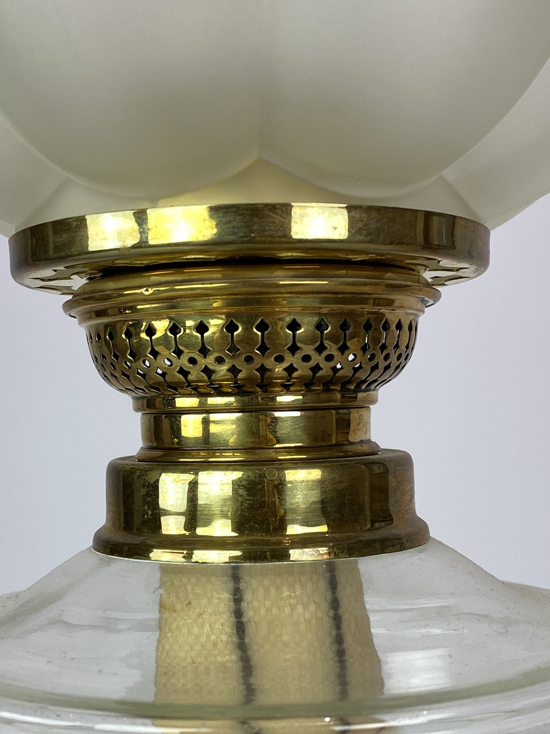 Petroleumslampe af messing med glasskærm fra omkring 1860. Lampen er i flot antik stand.