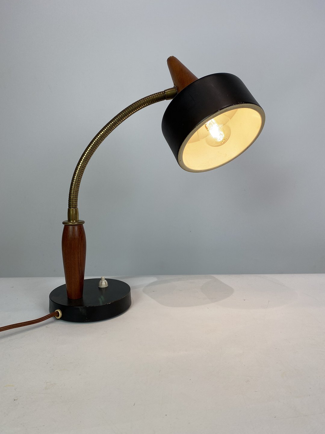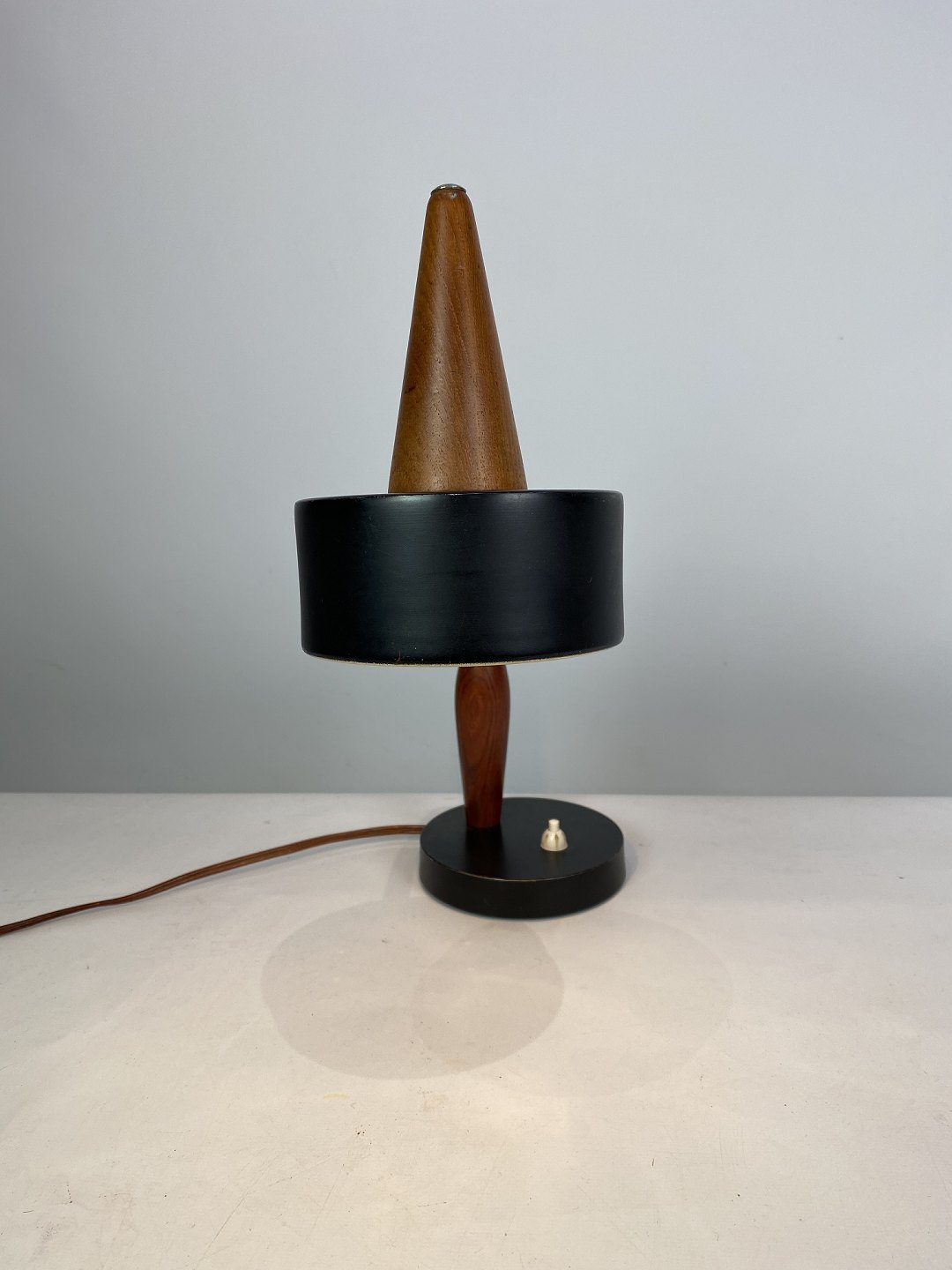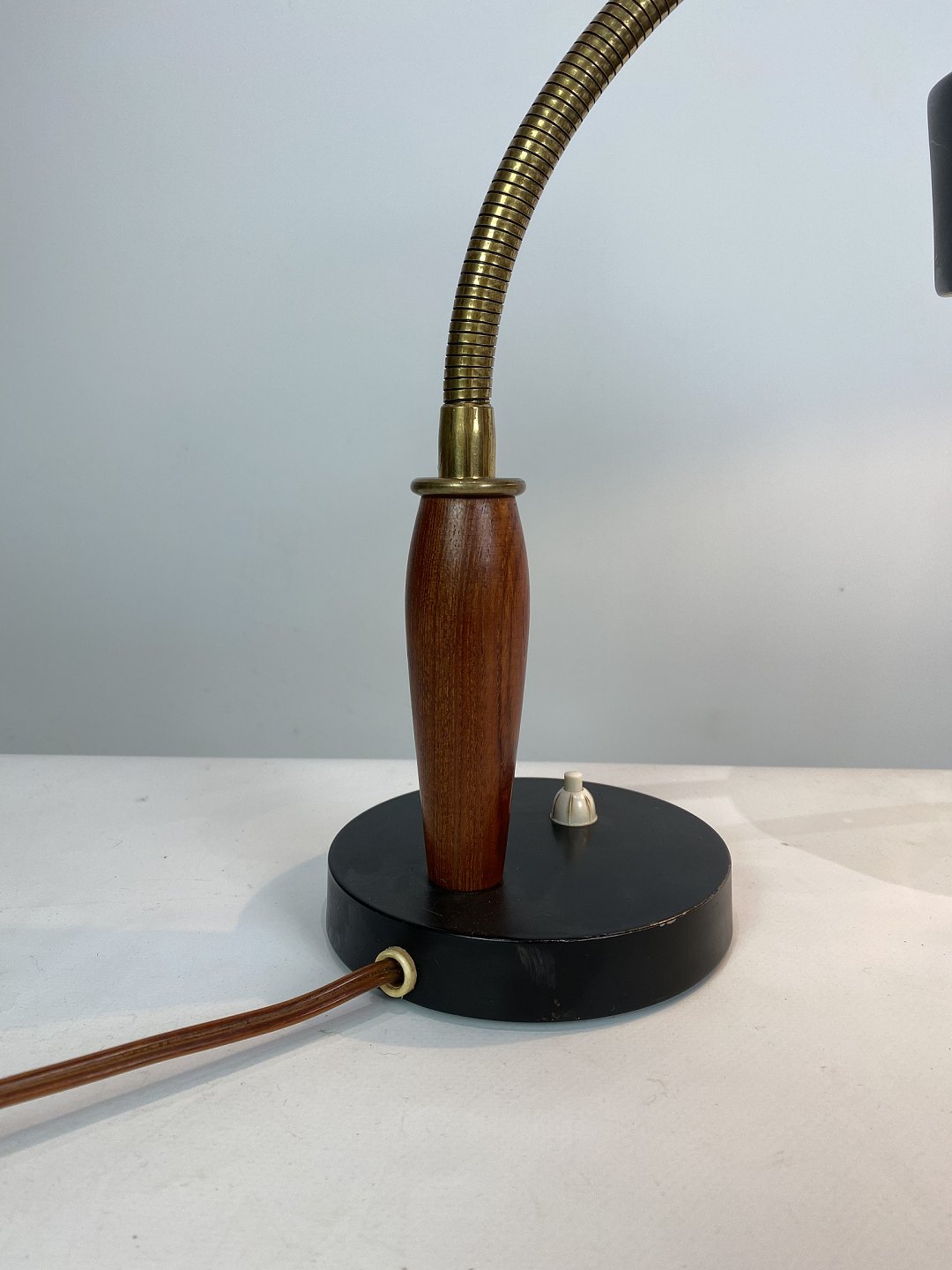 Table lamp of black metal and teak of Danish design from the 1960s. The lamp is in great vintage condition.