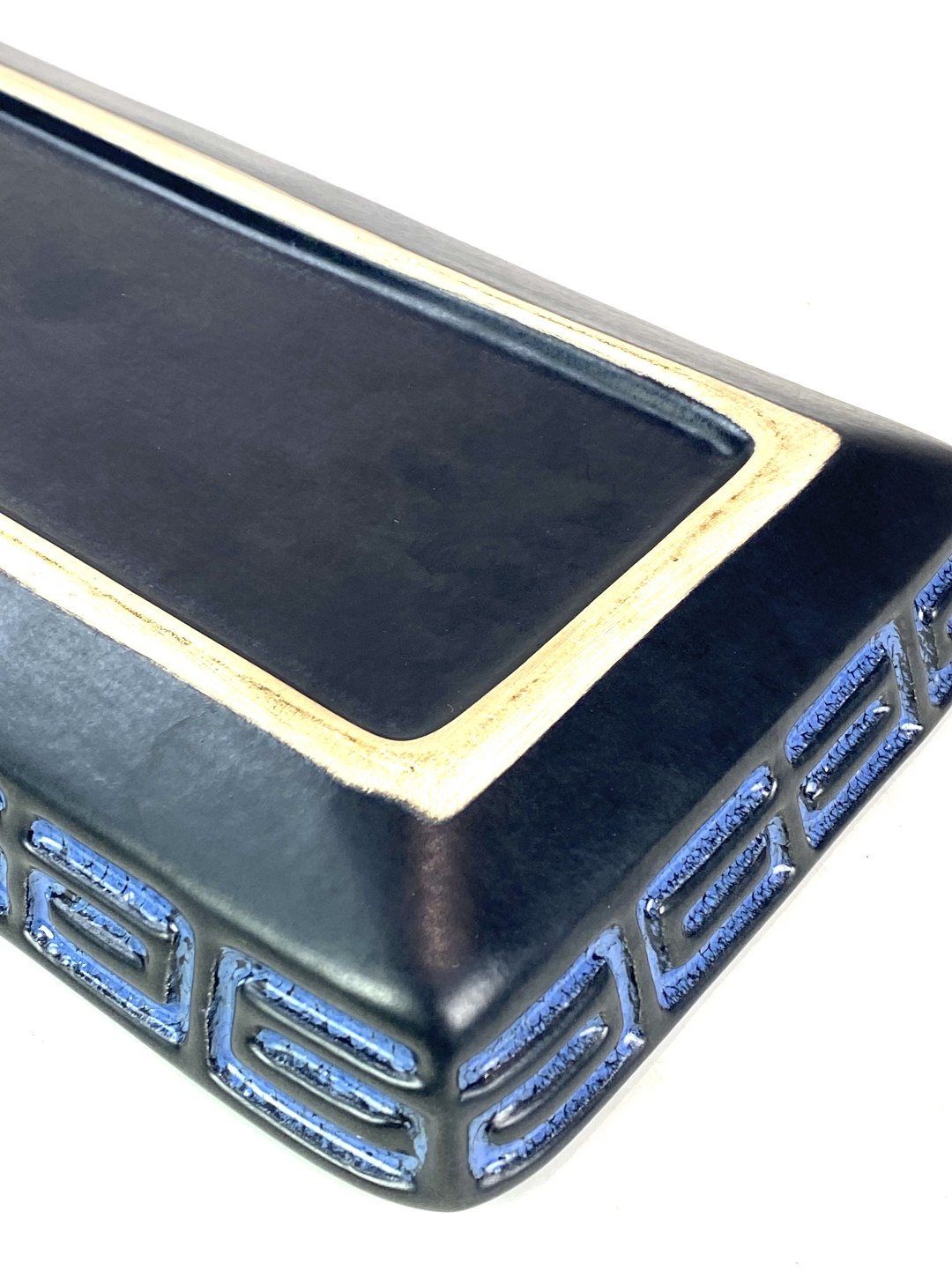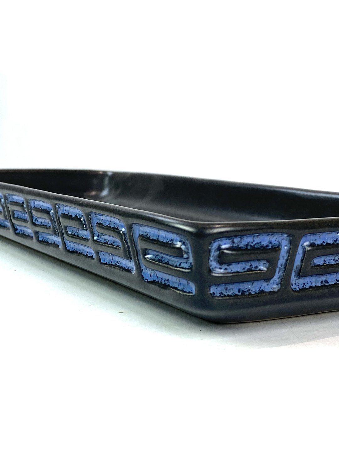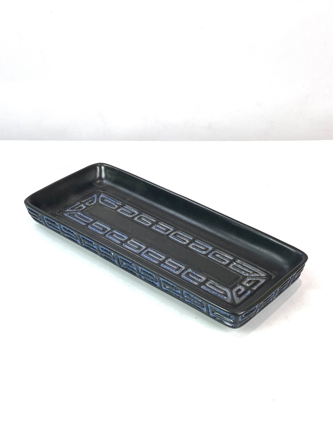 Aflangt keramik fad med blå glasur fra omkring 1950erne.