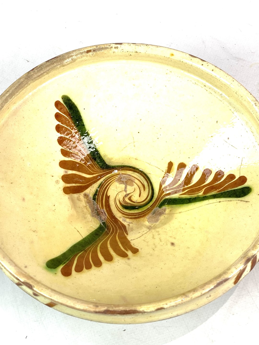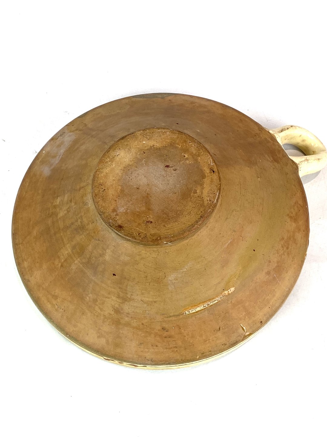 Fad eller øreskål af ler med lys glasur dekoreret med mønster fra 1910erne. Fadet er i flot brugt stand.