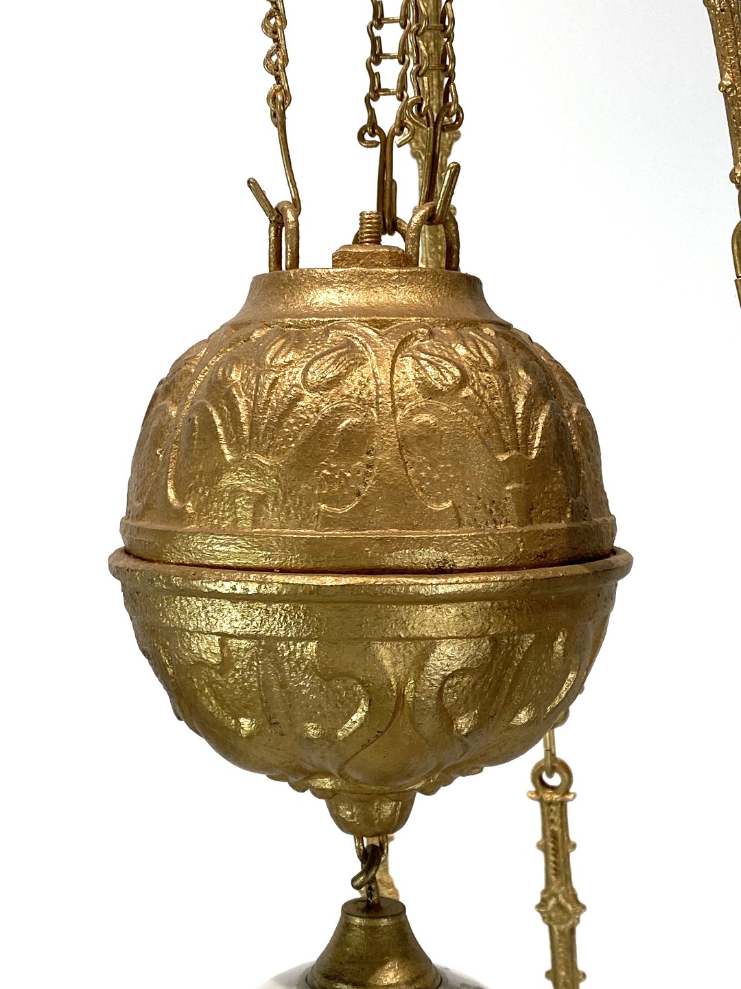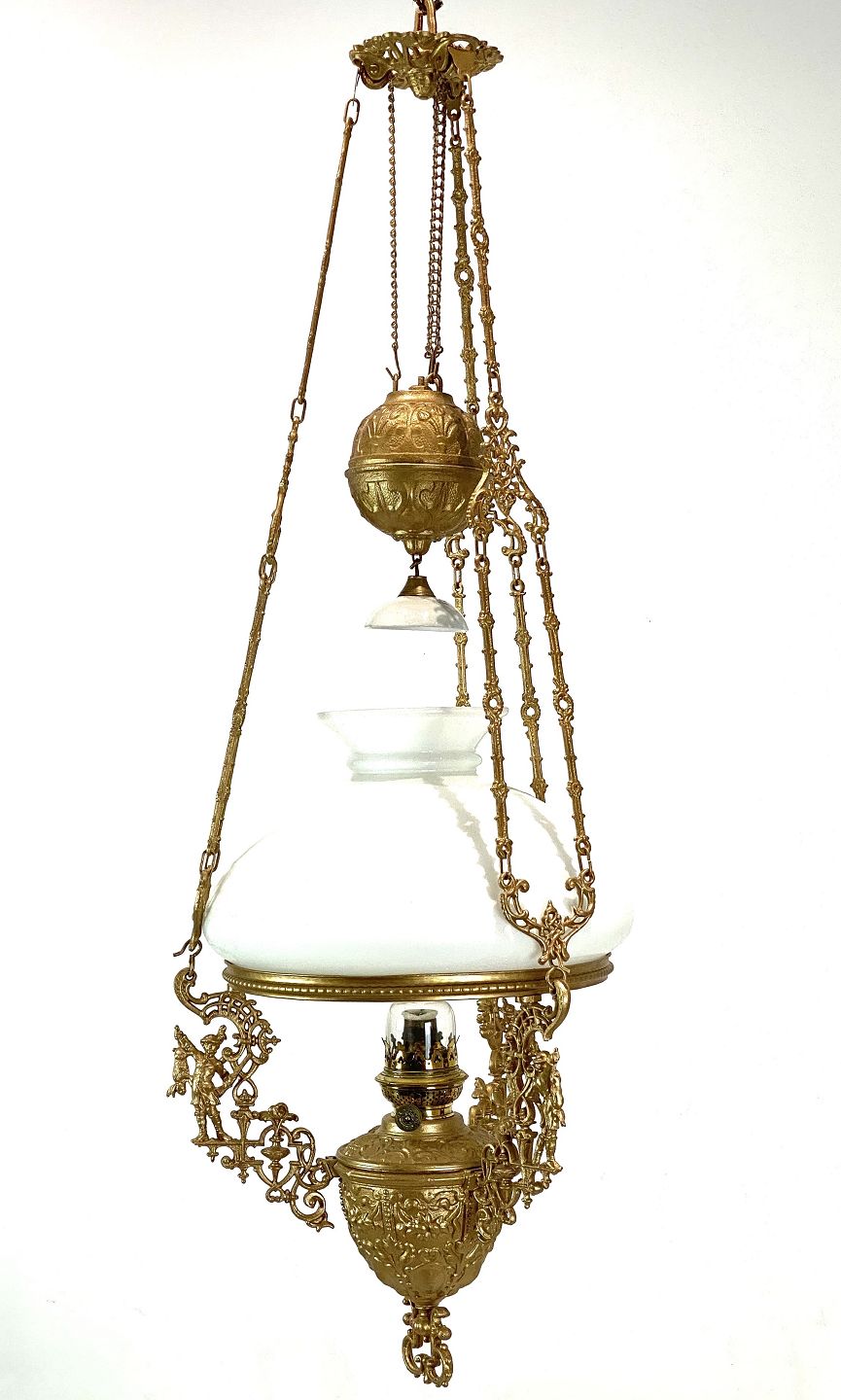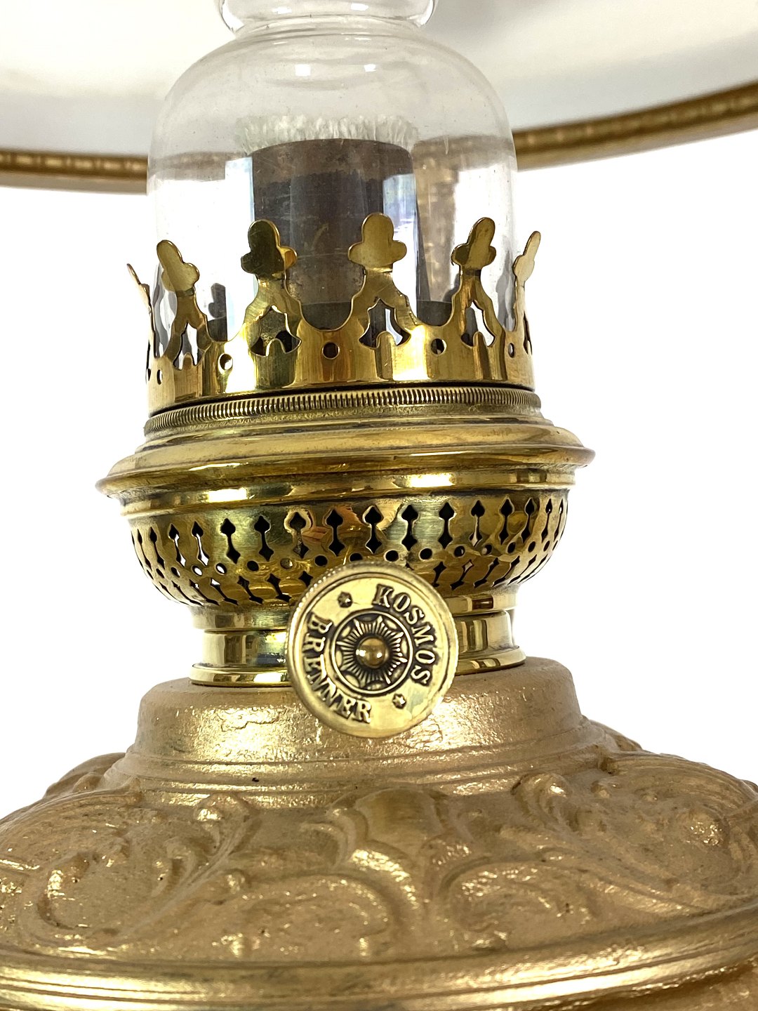 Large kerosene lamp of patinated brass and shade of white opaline glass from around the 1880s. The lamp is in great antique condition.