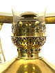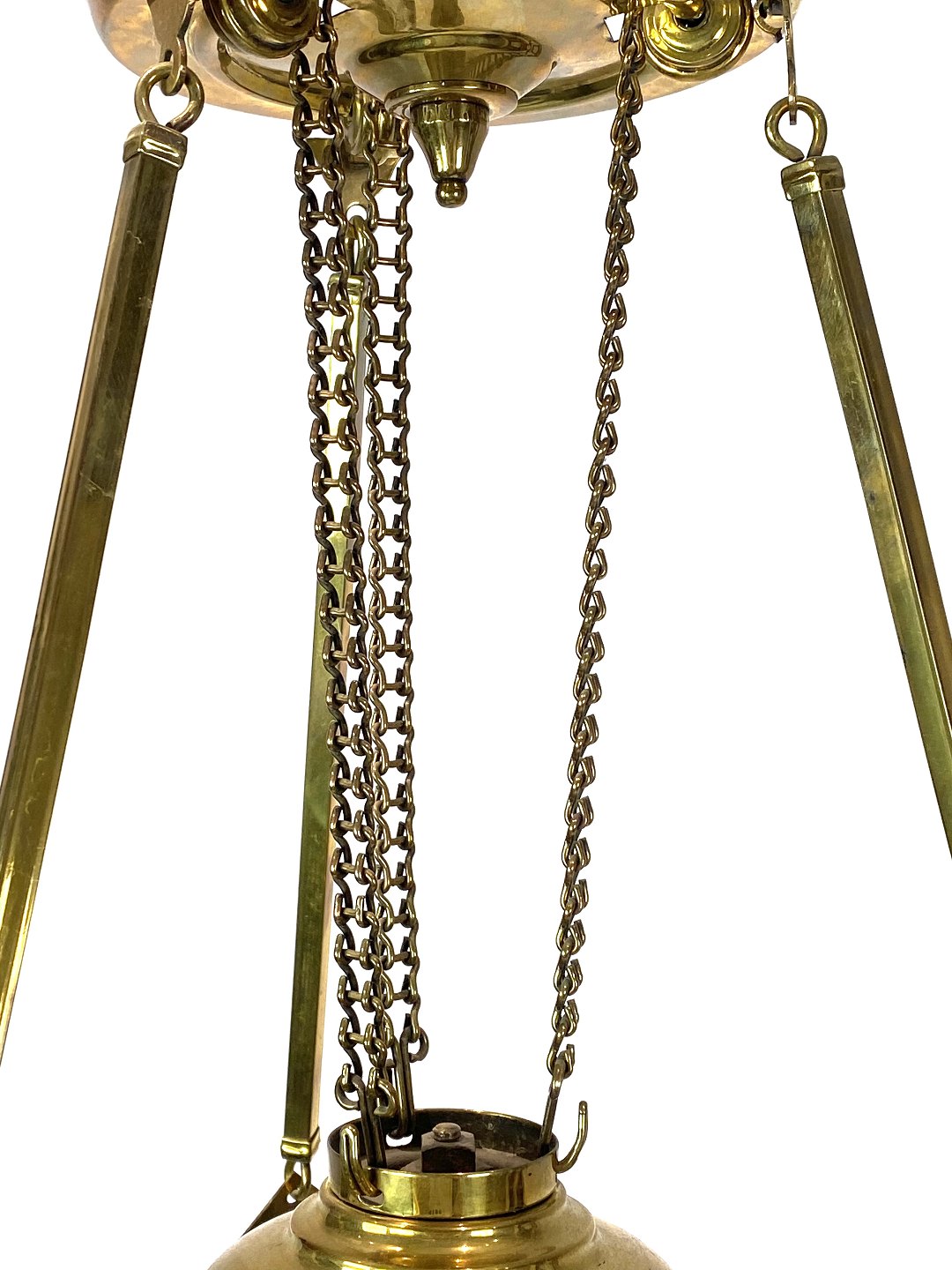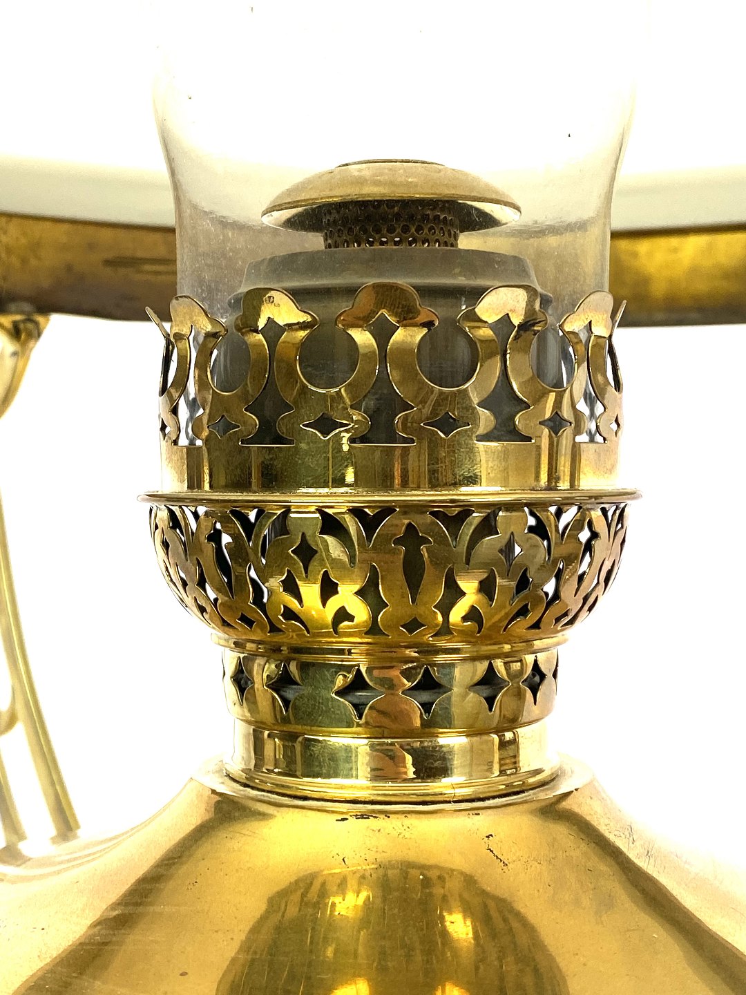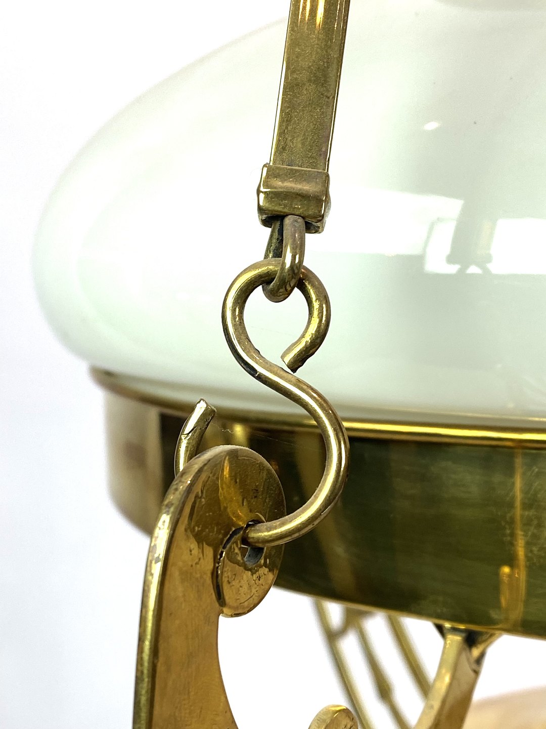 SolgtHængelampe til petroleum i messing og med skærm af opal glas af Jugend stil fra omkring 1920erne. Lampen er i flot antik stand.