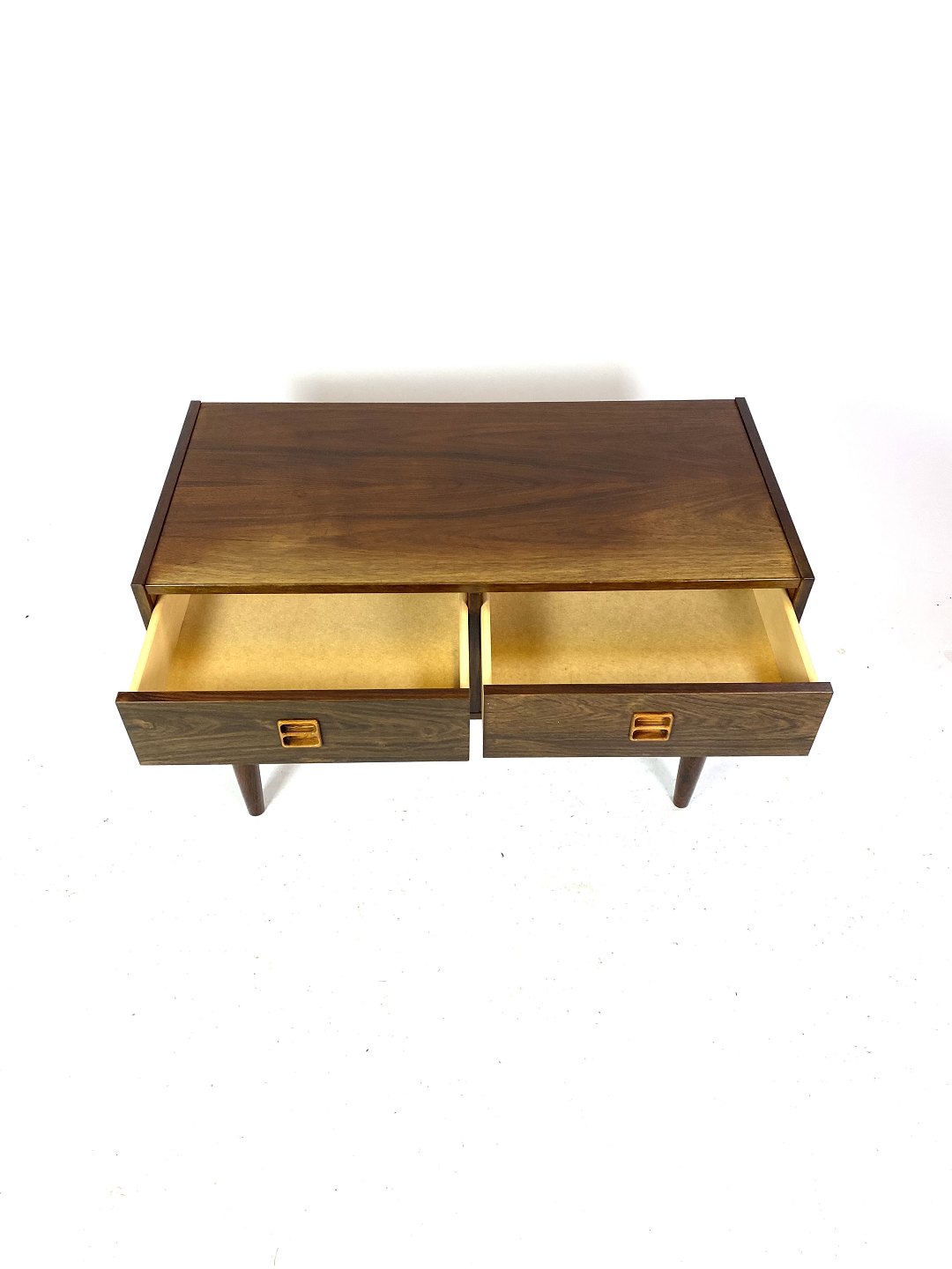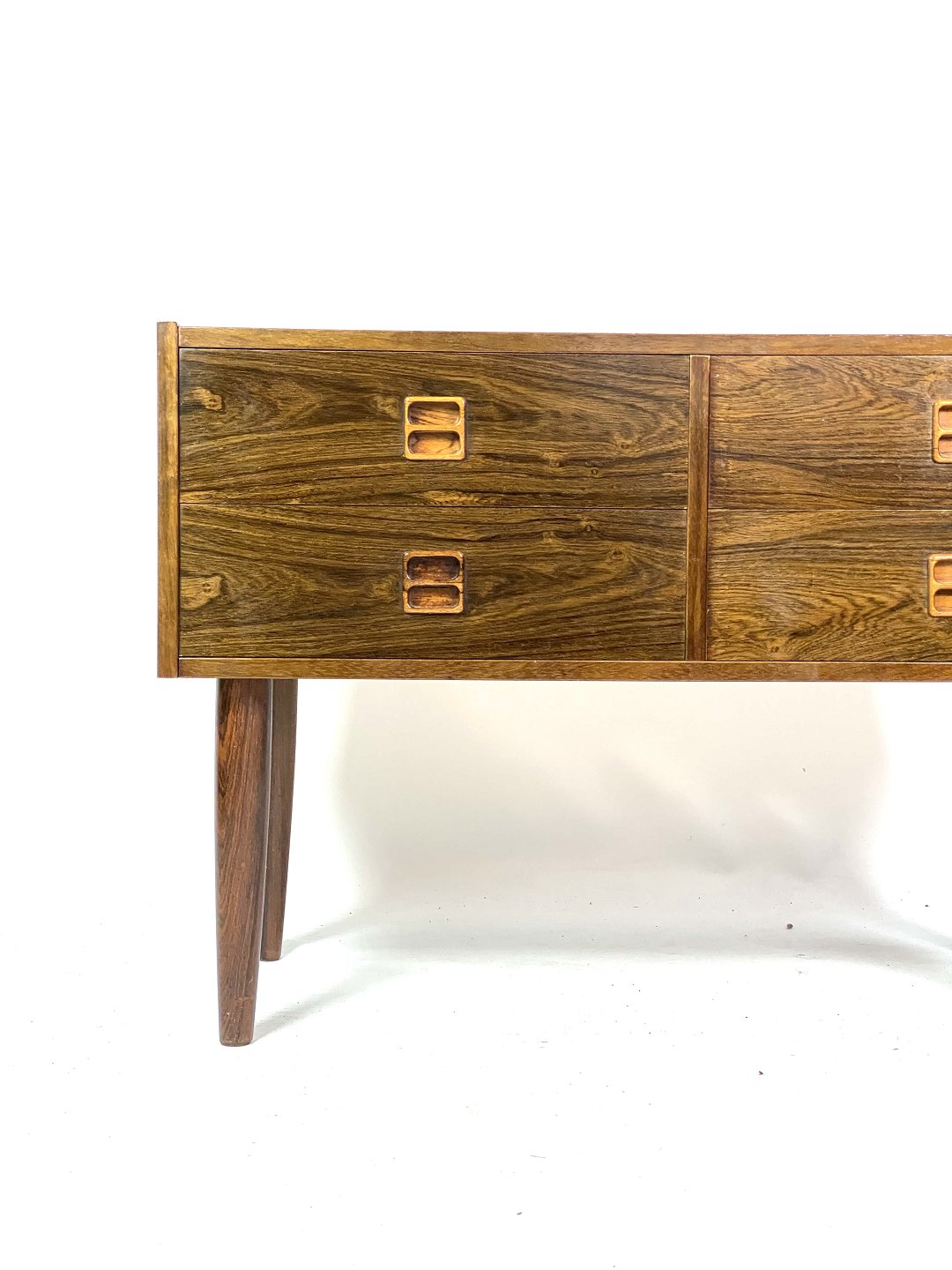 Get a timeless piece of Danish design history with this beautiful chest of drawers in rosewood from the 1960s. The rosewood not only adds warmth to the room, but it also highlights the fine quality and craftsmanship characteristic of Danish furniture design at the time.