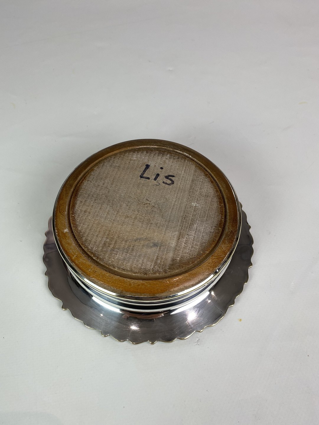 Forsølvet vinbakke med bund af træ, i flot antik stand.