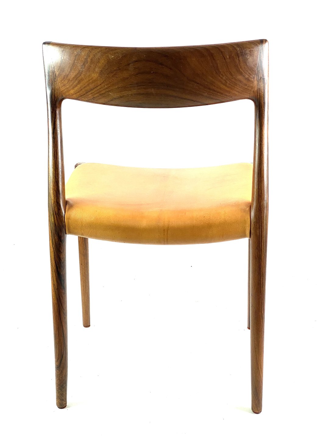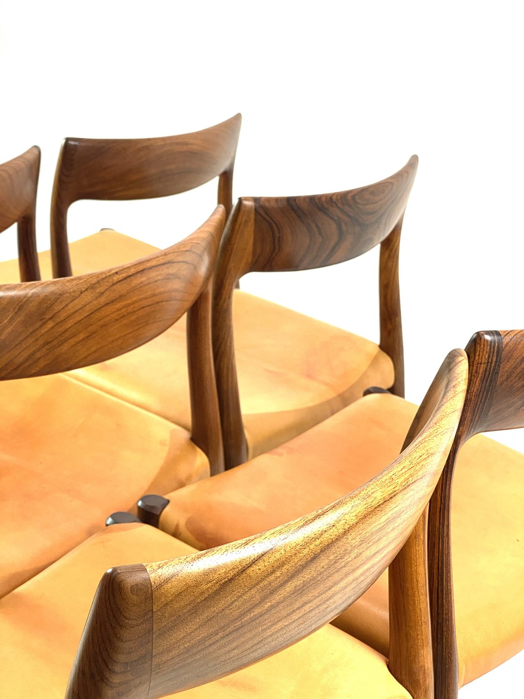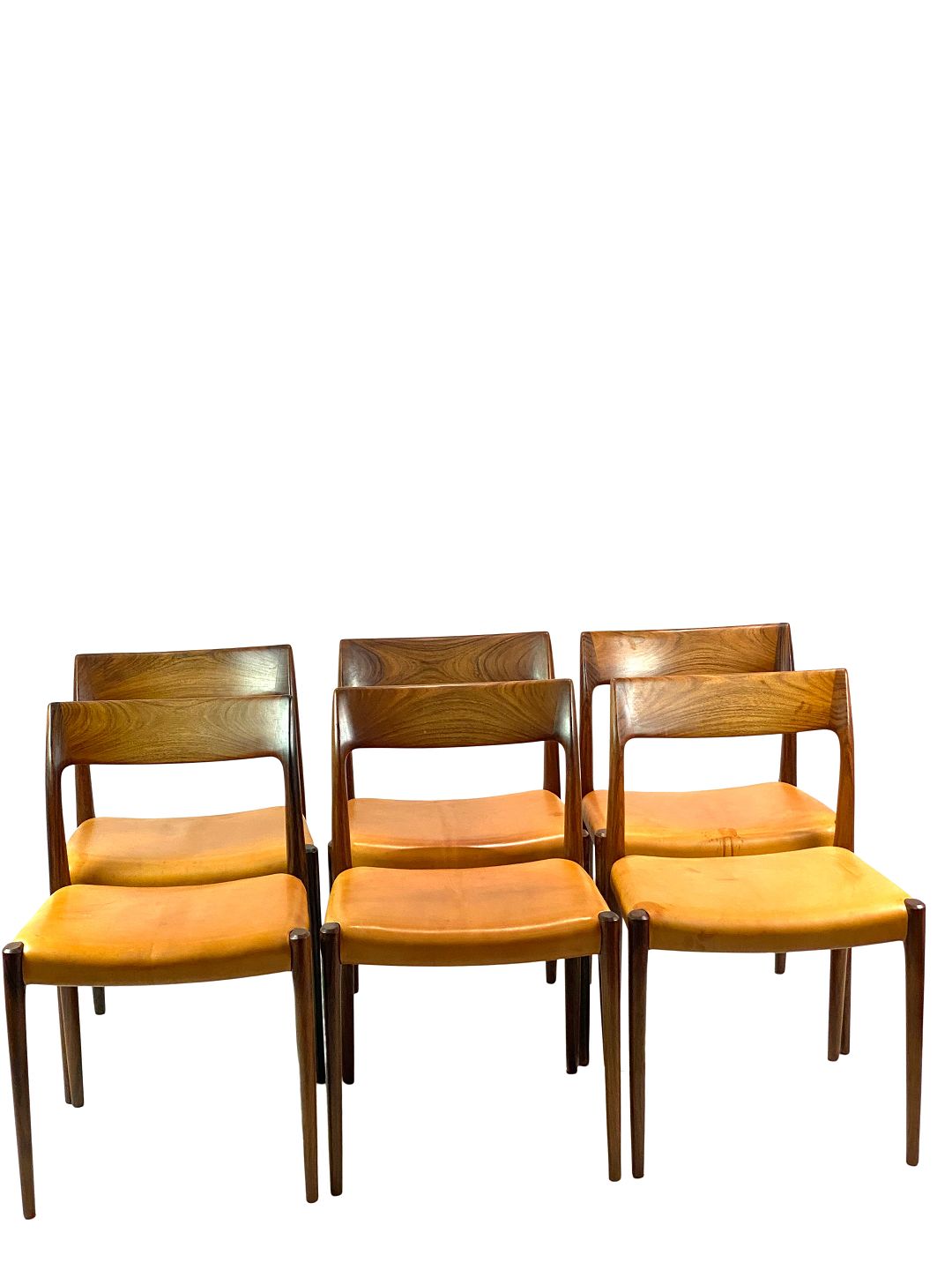 Et sæt af seks spisestuestole, model 75, i palisander og patineret naturlæder designet af N.O. Møller fra 1960erne.