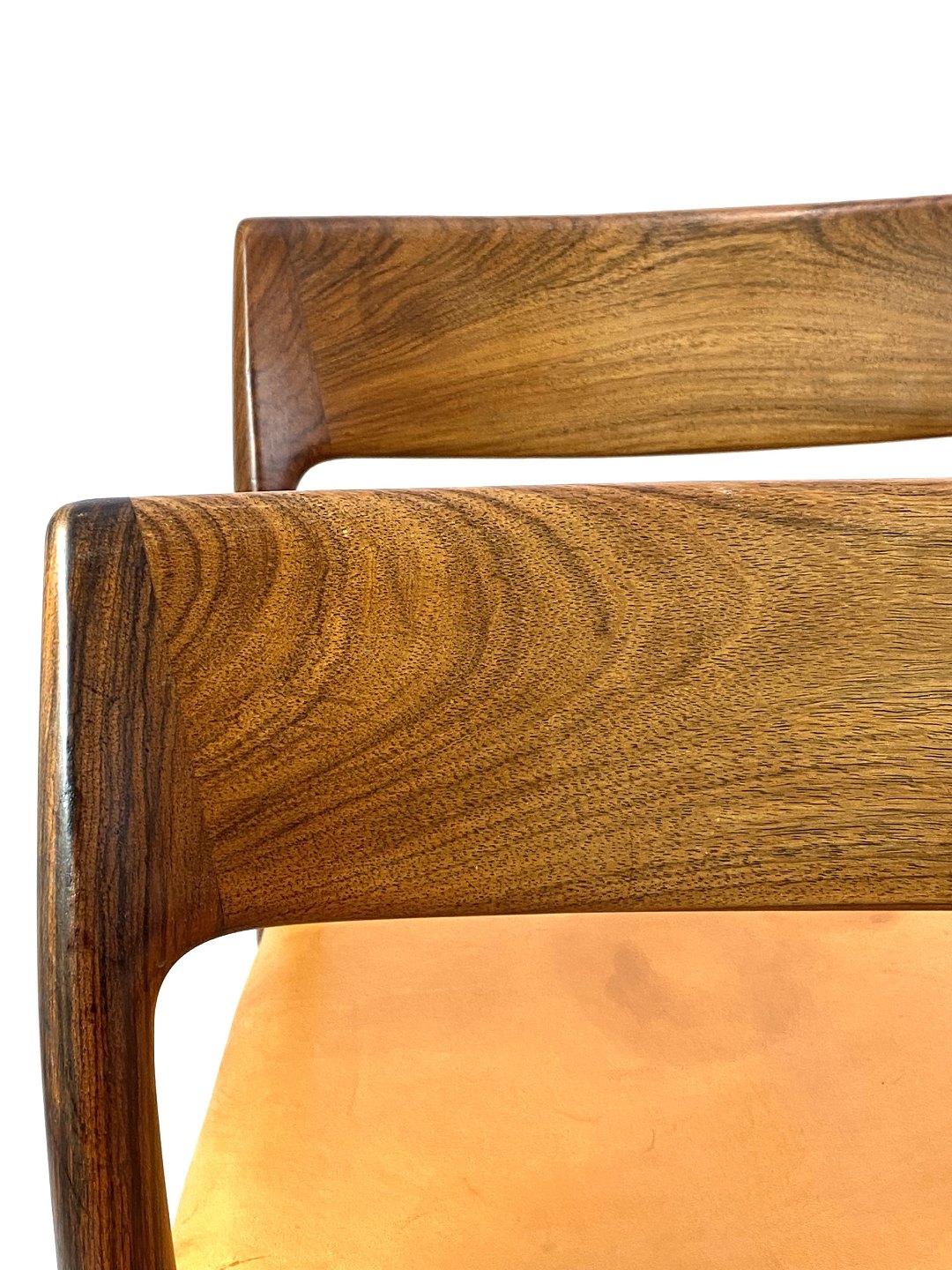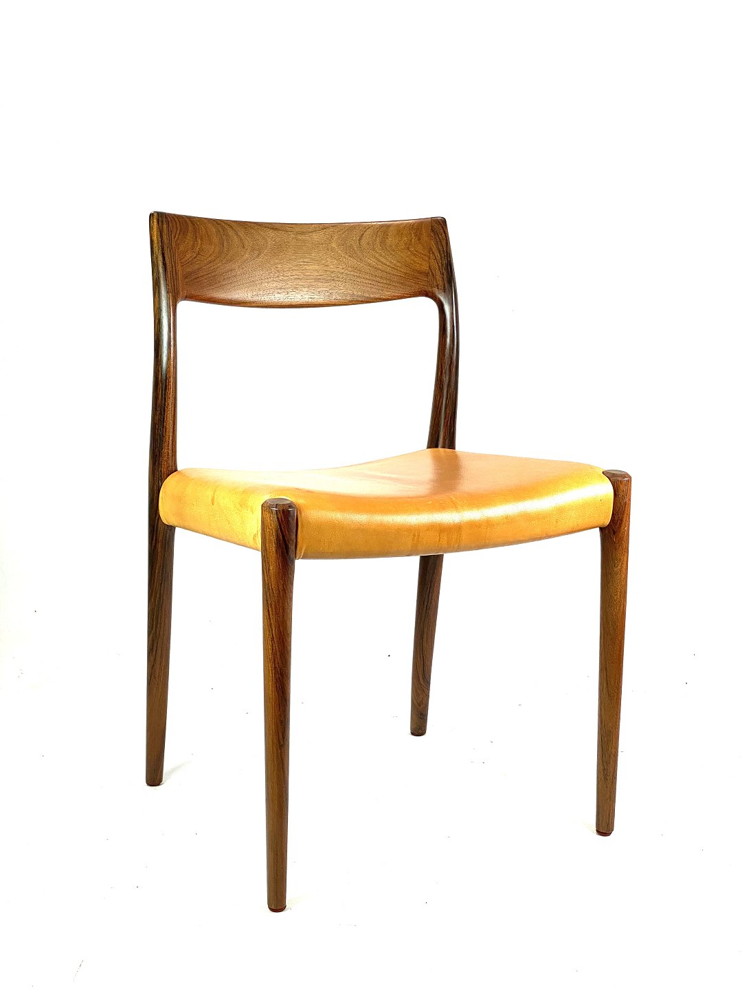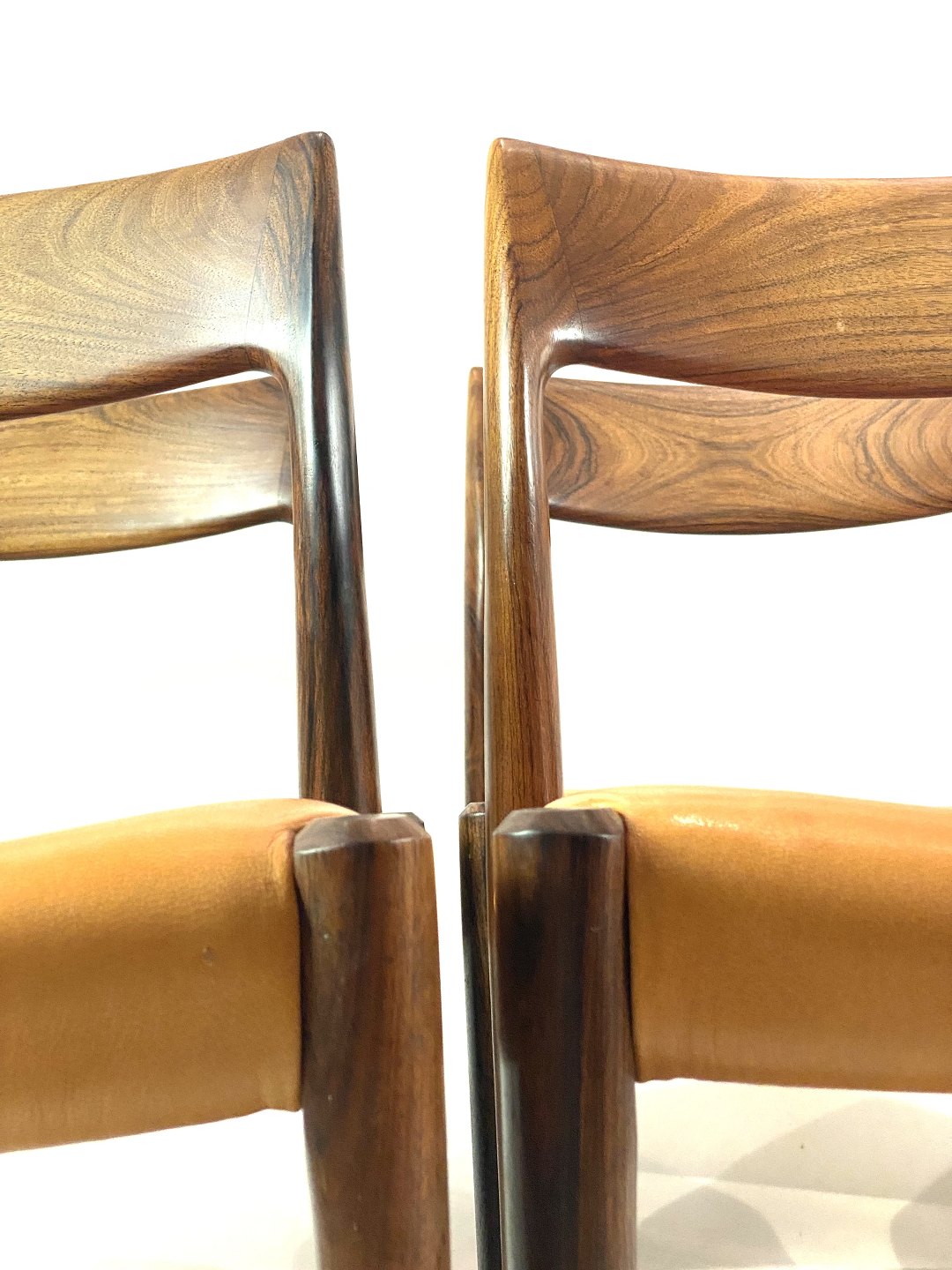 Et sæt af seks spisestuestole, model 75, i palisander og patineret naturlæder designet af N.O. Møller fra 1960erne.