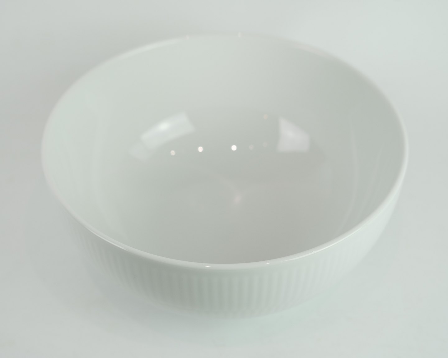 SolgtRoyal Copenhagen hvid riflet skål, designet af Arnold krog. Denne serveringsskål er Ø21 og står i meget fin brugt stand.
