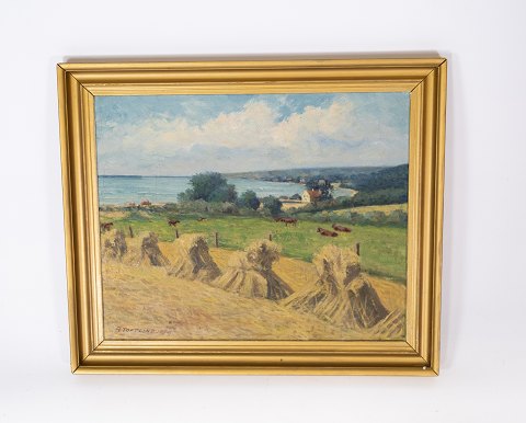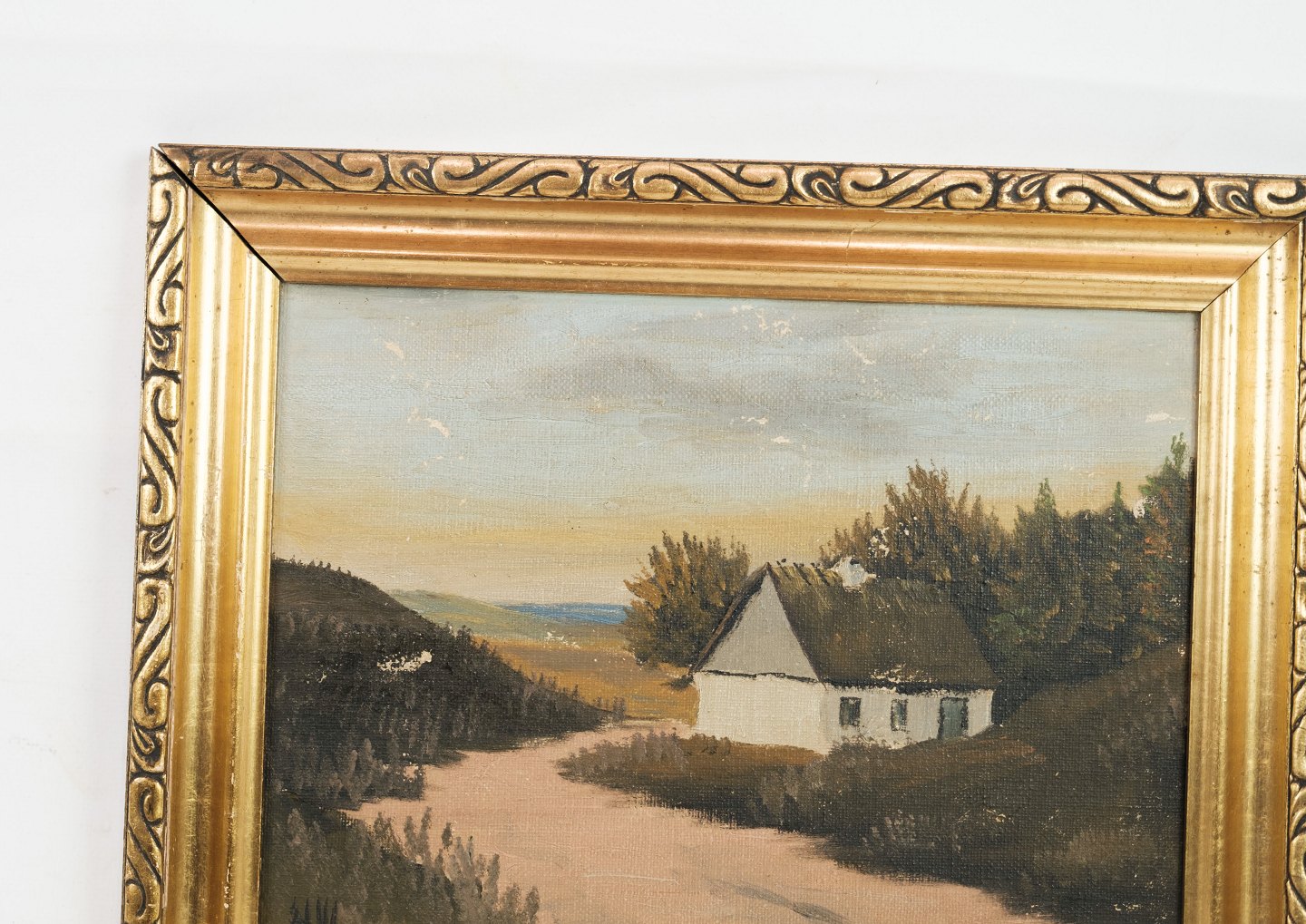 Oliemaleri af et lille bondehus og grusvej malet på træplade med guld ramme fra omkring år 1940'erne. Står i meget fin brugt stand.