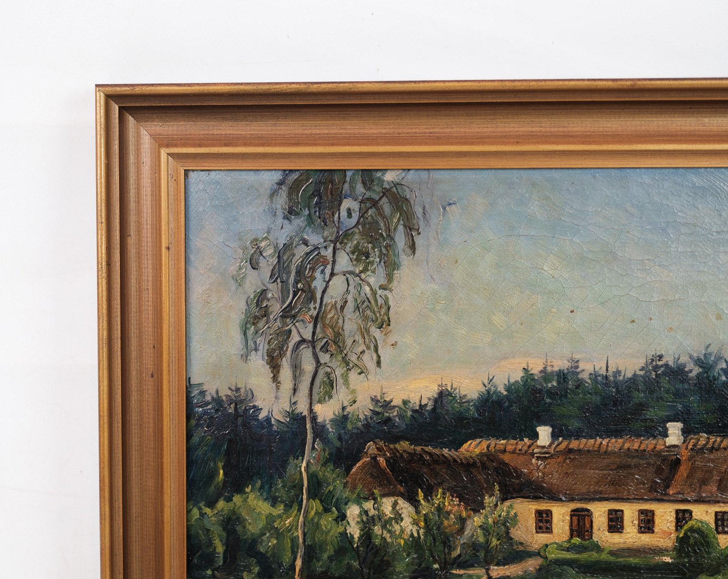 Oil painting with farmhouse and gold frame from around 1926. Signed Holger M. Brandholt. Stands in very nice condition.