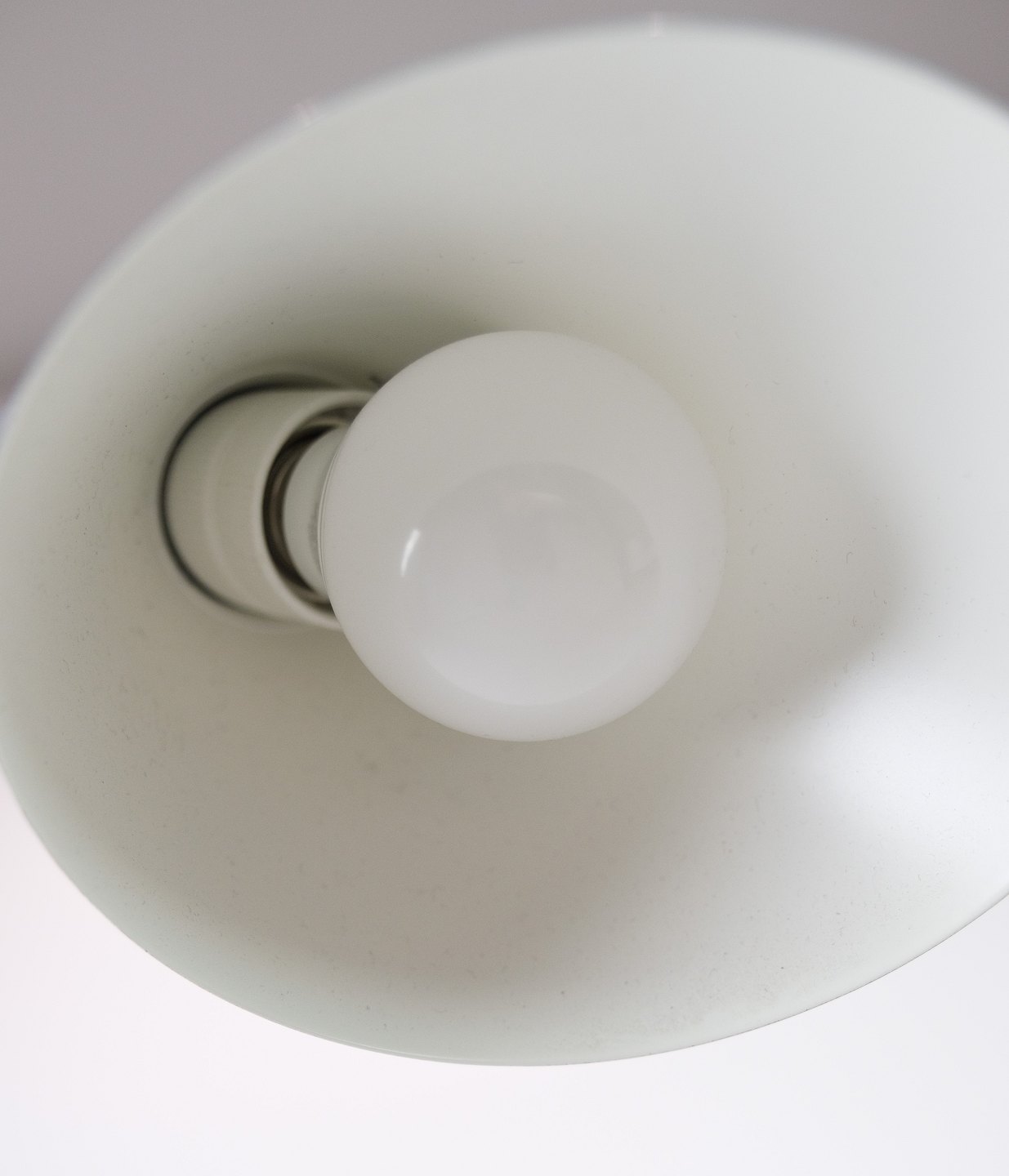 Designet til at udsende direkte og retningsbestemt lys har lampens indre overflade en hvidlakering, der sikrer optimal lysfordeling og en blød, skærme-fri belysning. Dens strømlinede silhuet og minimalistiske æstetik passer perfekt ind i forskellige indretninger og gør den til et alsidigt og tidløst tilbehør til ethvert rum.