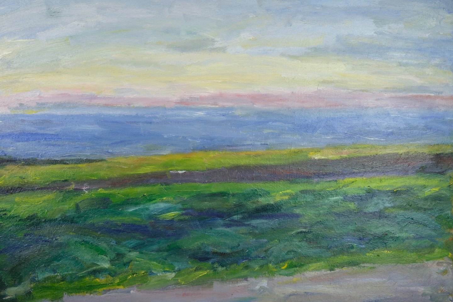 SolgtOliemaleri på lærredet med grønne og blå farve nuancer malet af Sixten Wiklund (1907-1986) fra år 1950'erne. Maleriet forstiller veddinge bakker om aften. Maleriet står i meget fin stand uden skader med original ramme.