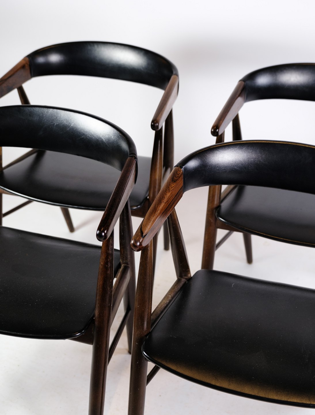 SolgtSæt af fire stole i palisander i sort læder tegnet af Aksel Bender og Ejnar Larsen formgivet i 1960'erne. De står alle i meget god vintage stand. Sælges kun som et sæt på fire