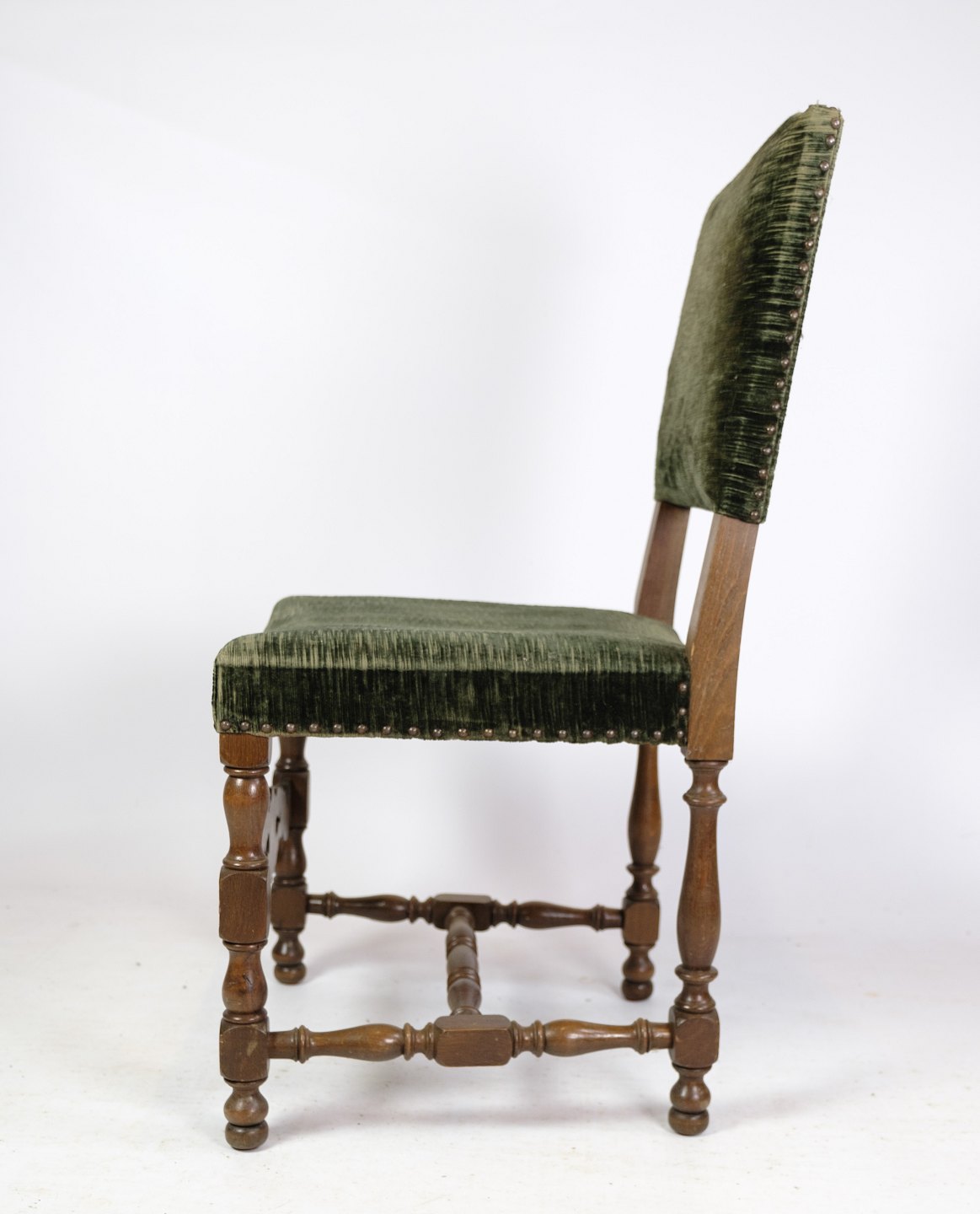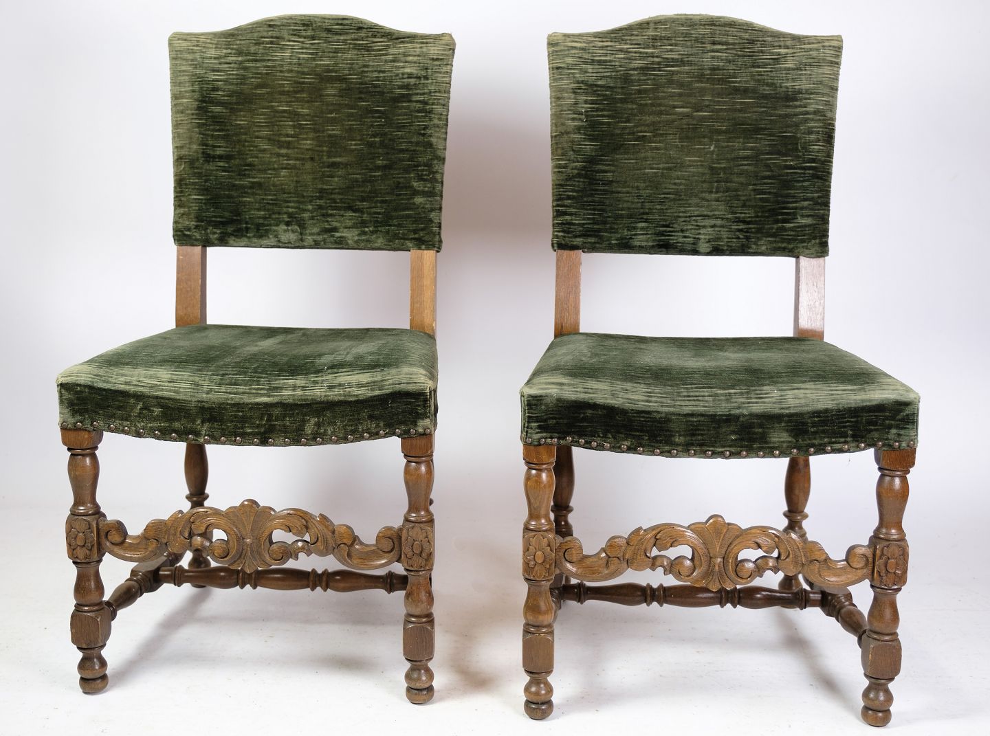 2 oak chairs in Renaissance style upholstered with green velor fabric from around the 1930s