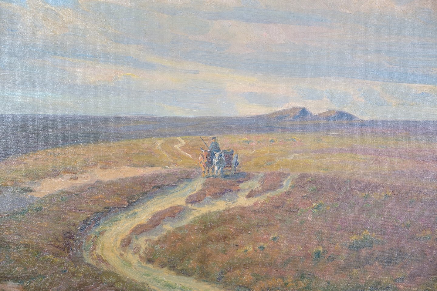 Oliemaleri på lærredet med motiv af landskab med sort ramme og bladguld fra omkring år 1930'erne.