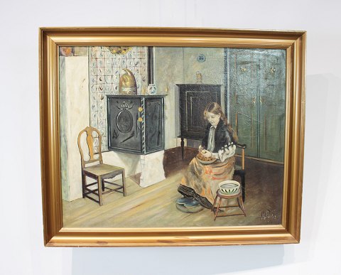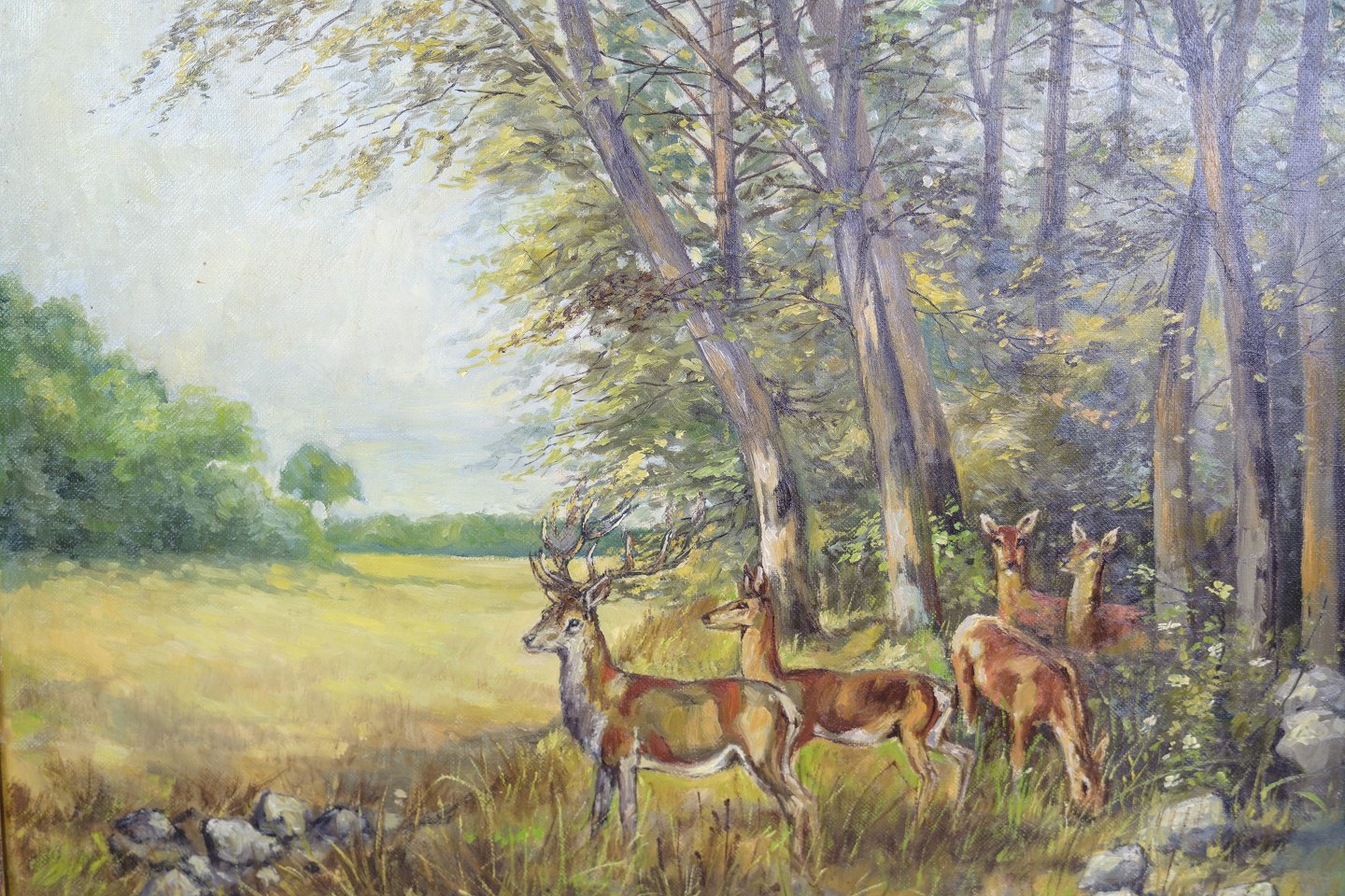 Oliemaleri på lærredet med motiv af dådyr med ramme af bladguld fra omkring 1940'erne. Signeret "Draabye" Lars.