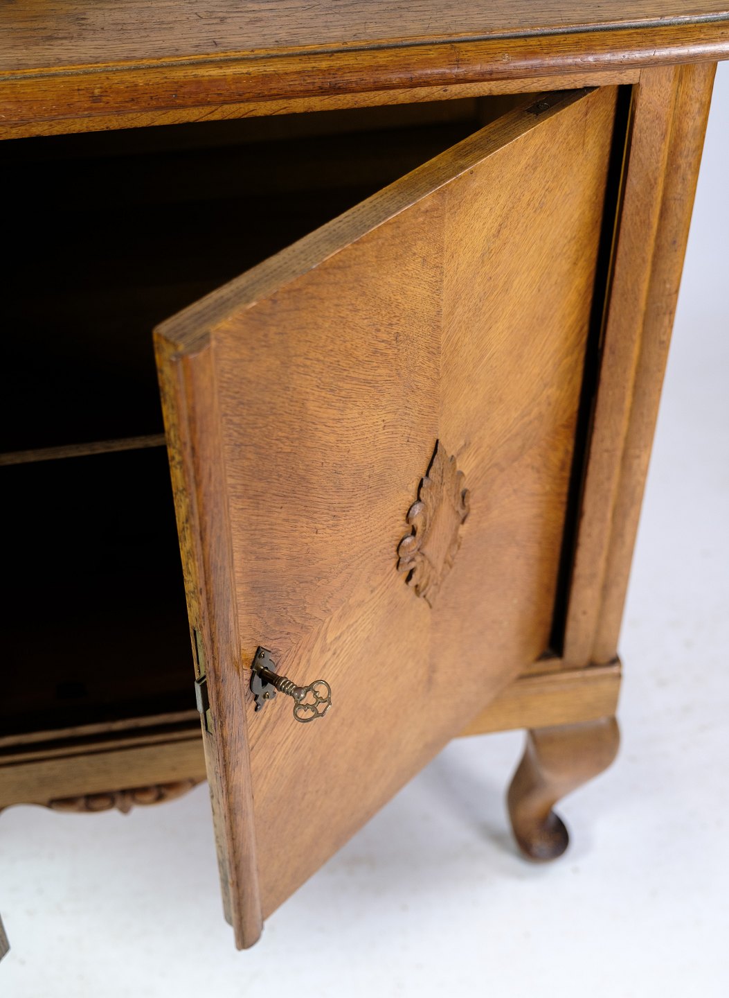 Lille skænk i egetræ med 2 låger og udskæringer fra omkring 1930’erne.