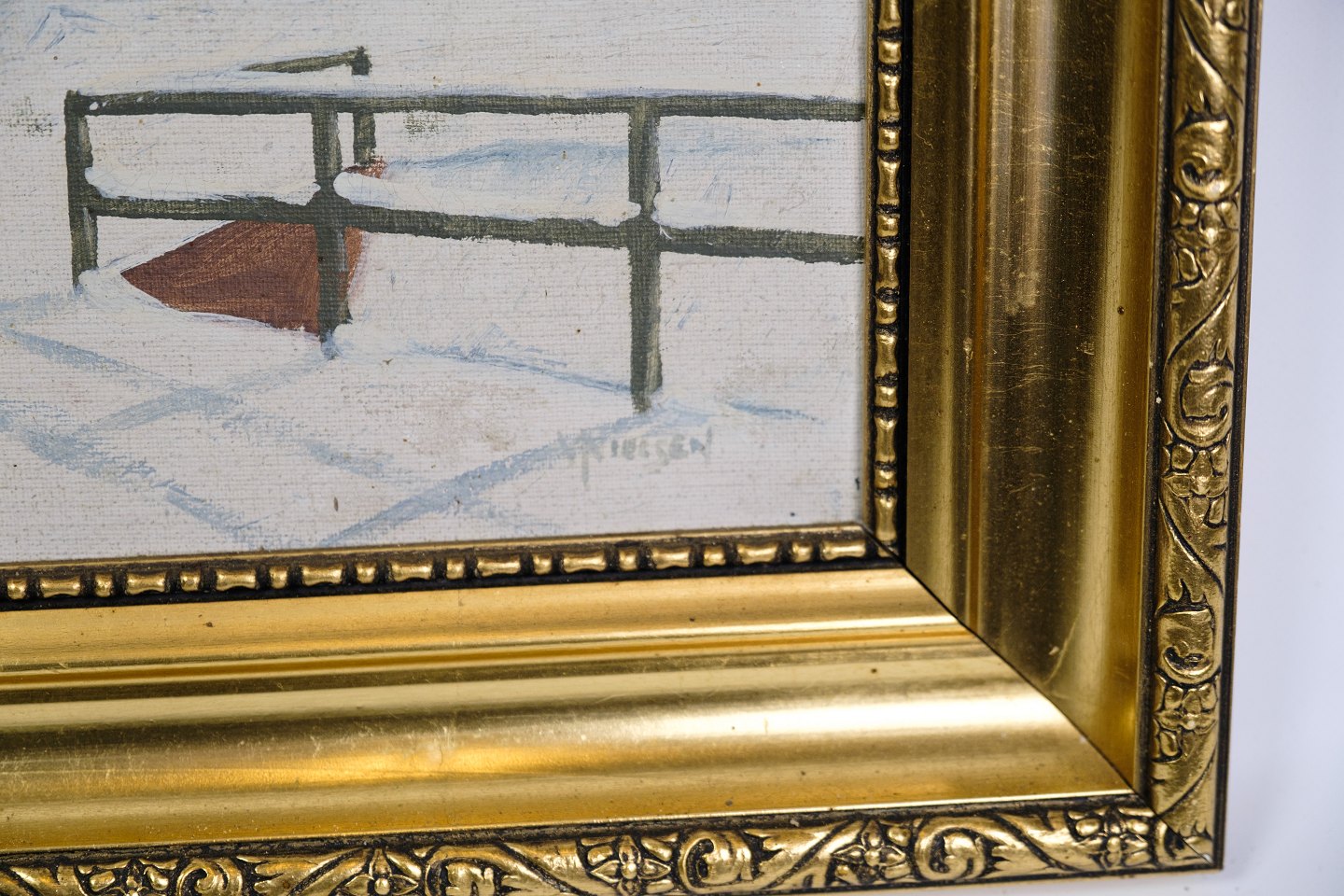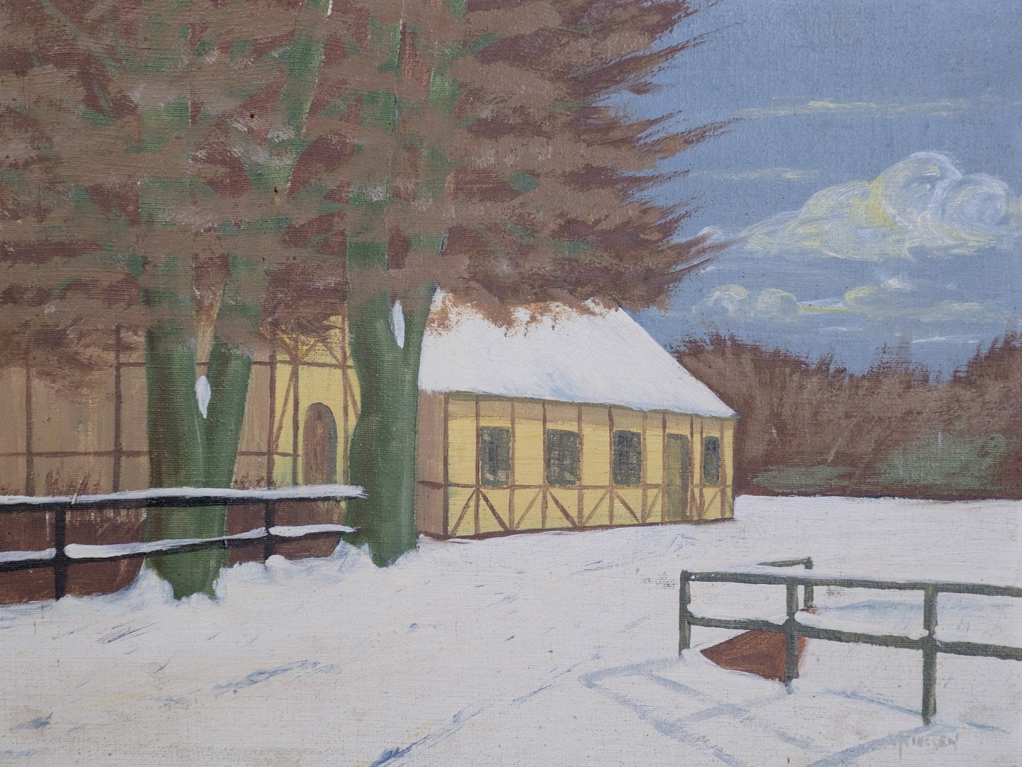 Oliemaleri på lærredet med motiv af et bondehus fra omkring 1930’erne