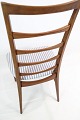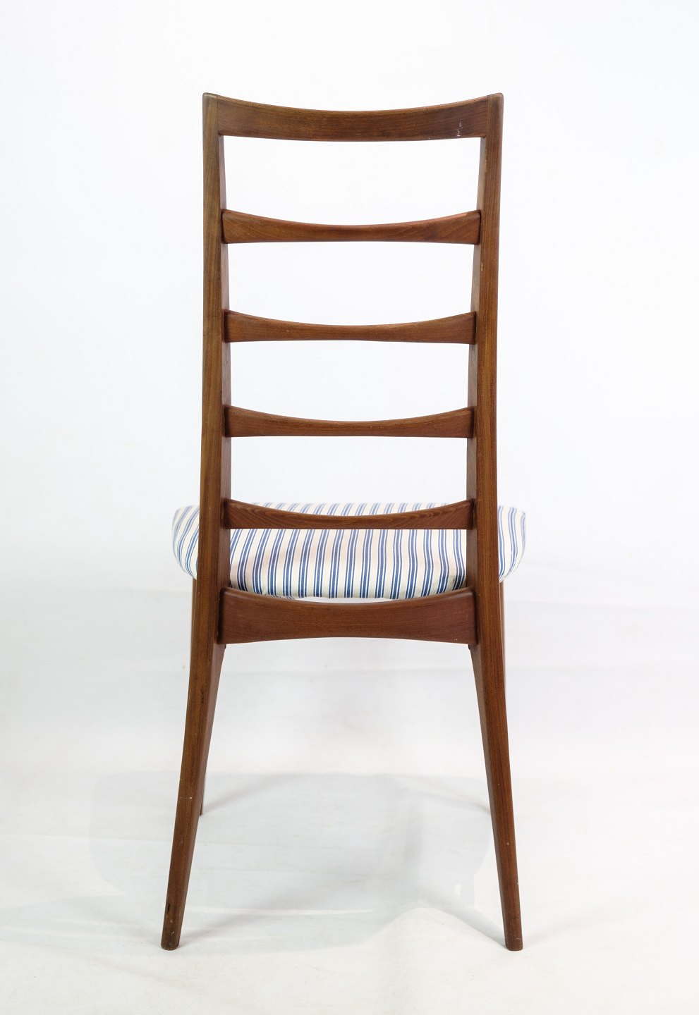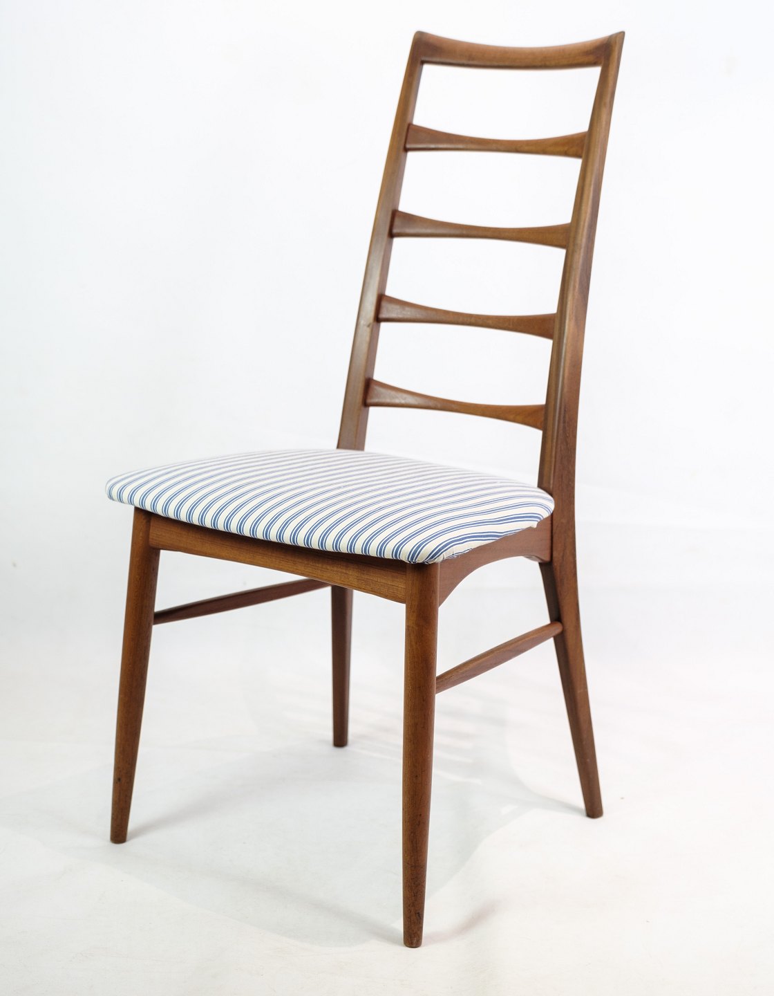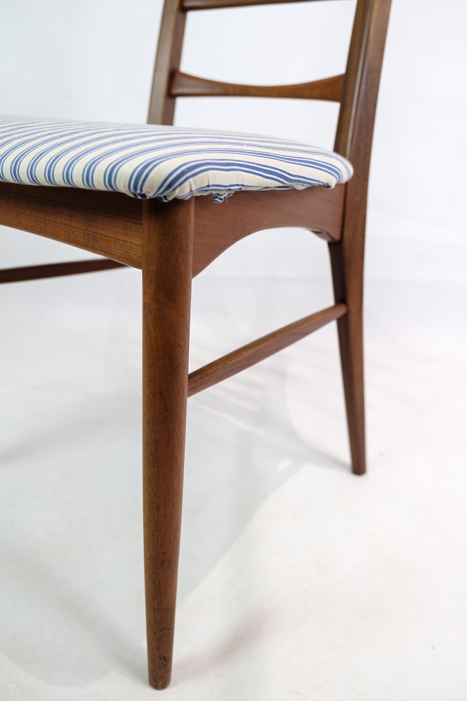 Sæt af fire stole, model "Lis", designet af Niels Koefoed i teak fra omkring 1960'erne. Stolene er polstret med flot stribet stof.