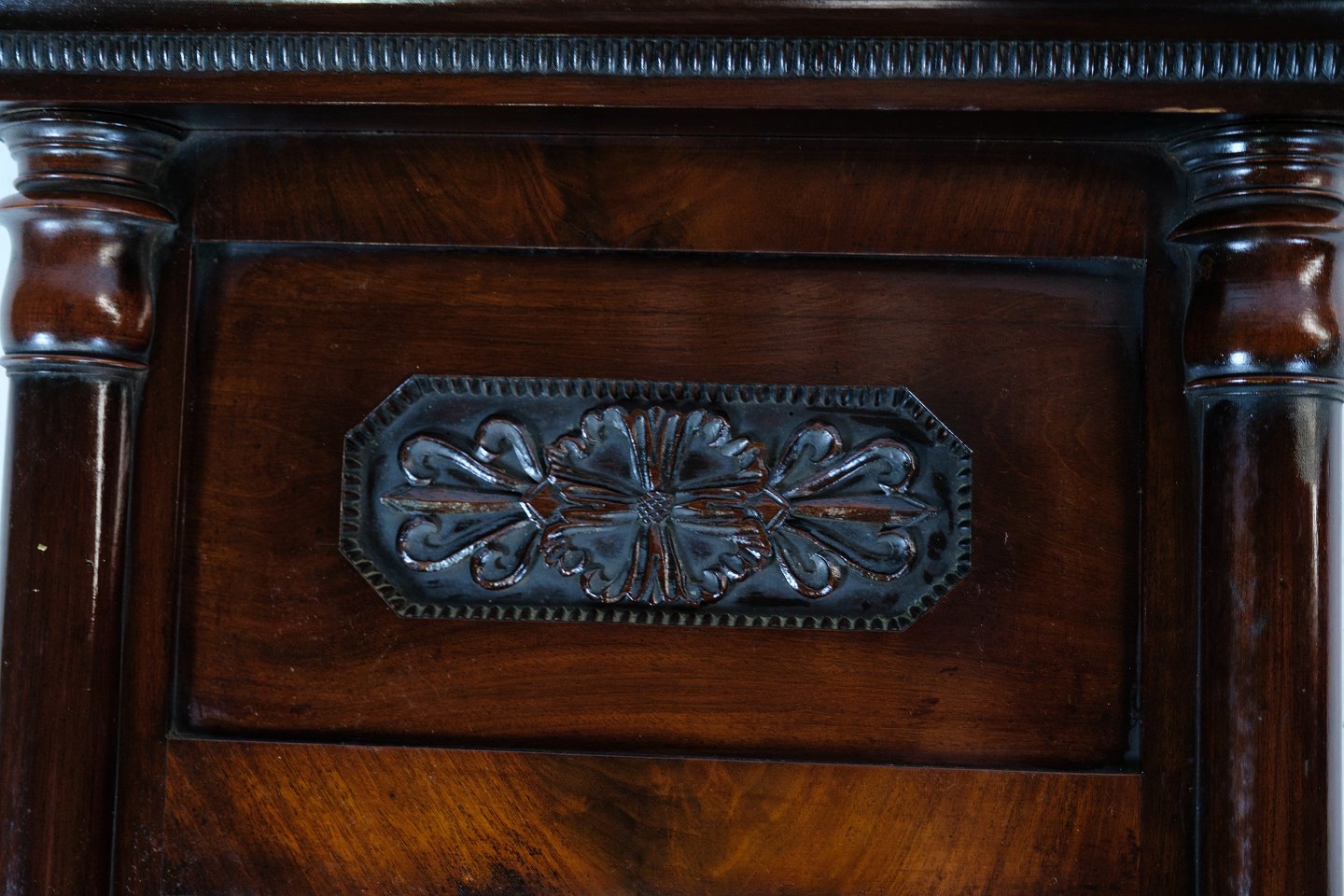 Antik spejl i træsorten mahogni fra perioden sen empire fra omkring år 1840'erne.