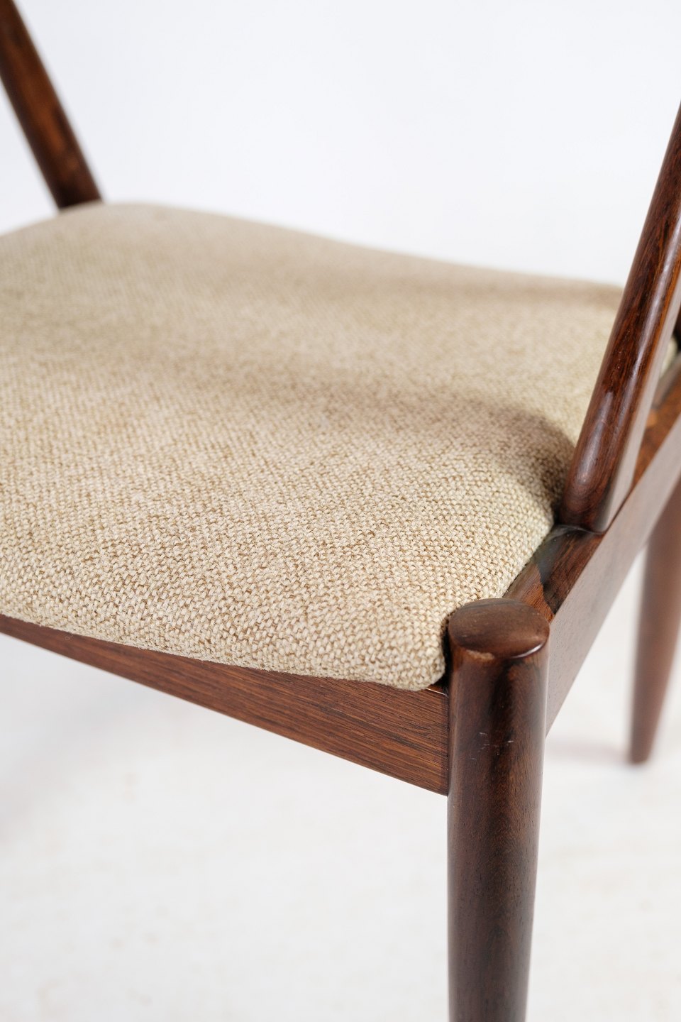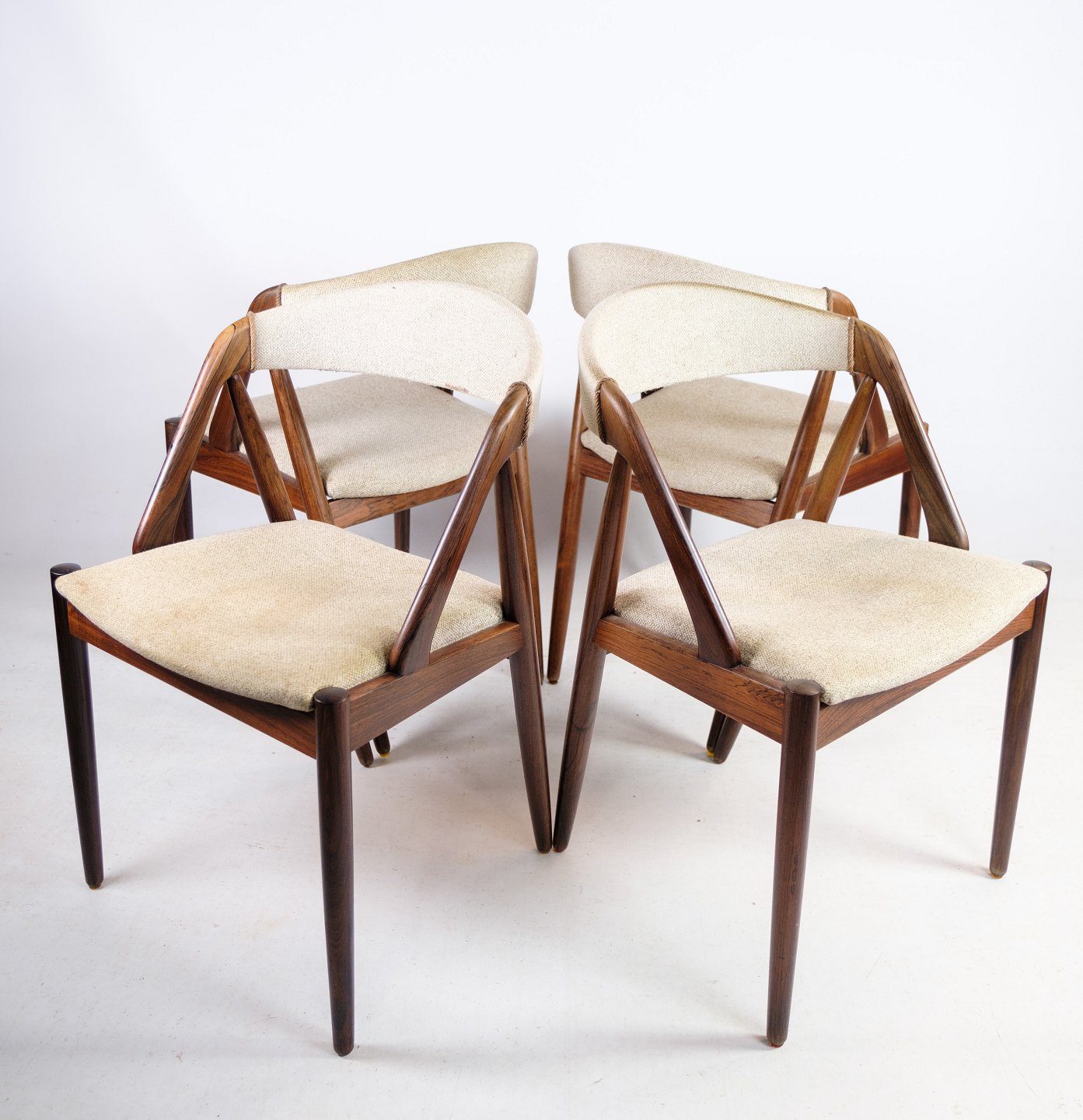 Set of 4, model 31, dining room chairs designed by Kai Kristiansen from around the 1960s. The chairs are made by Schou Andersen with rosewood frames in very fine condition. The fabric needs reupholstering, which we also do in our own workshop. Write a message so we can talk about which fabric you want to wear for an additional price.