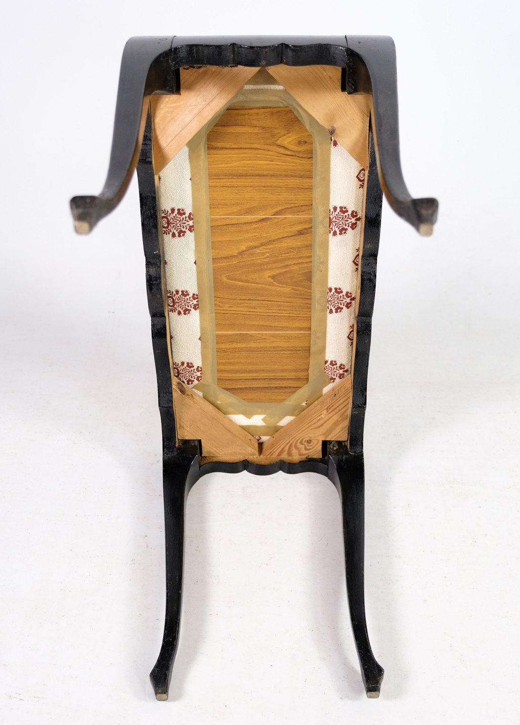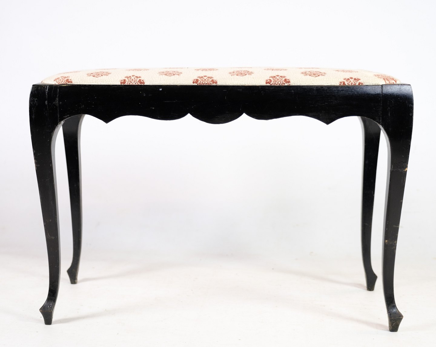 SolgtKlaverbænk i mørkt mahogni med lyst uldstof fra år 1930'erne.