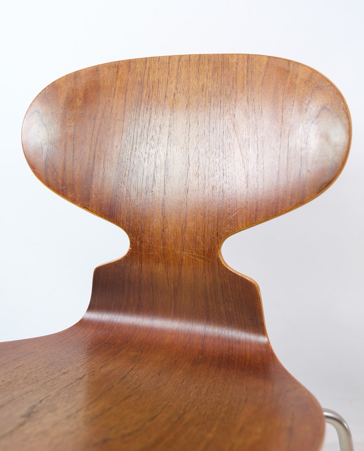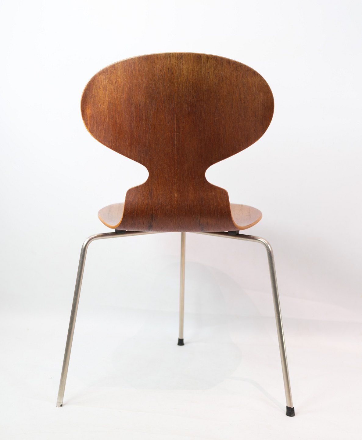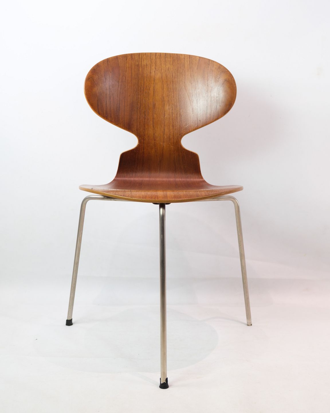 SolgtMyren, model 3100, designet af Arne Jacobsen i træsorten teaktræ fremstillet hos Fritz Hansen fra omkring 1950'erne. Denne stol er med tre ben af metal og er en meget tidlig model, grundet metalbeslag i bunden. Fremstår i meget fin brugt stand.