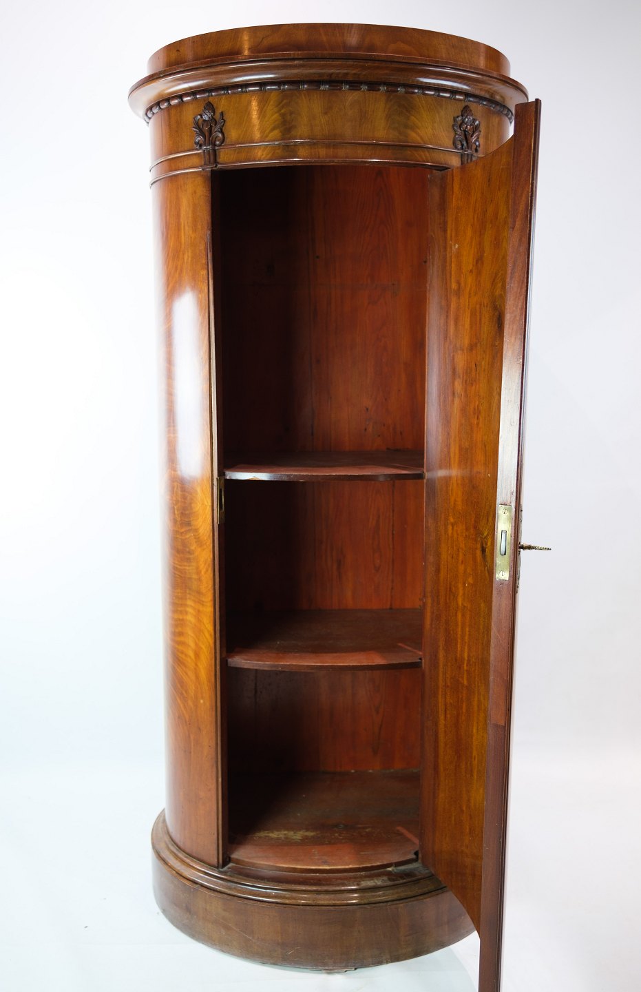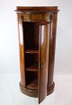 Antikt ovalt piedestalskab i mahogni med udskæringer og smuk struktur i træet fra omkring år 1840'erne.