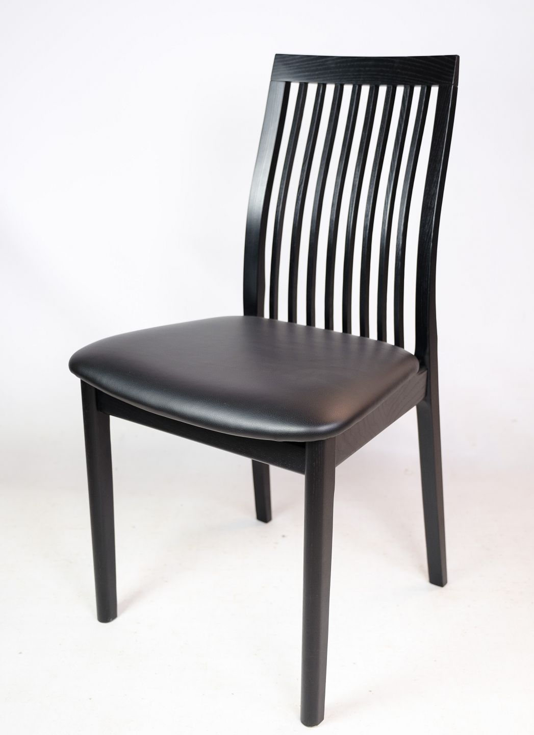 SolgtSæt af 4 spisestuestole, model 712, i sort bejdset ask fremstillet af K. Høffer Larsen A/S. Mellemhøj spisestuestol, med lodrette pinde i ryggen, der giver god siddekomfort.