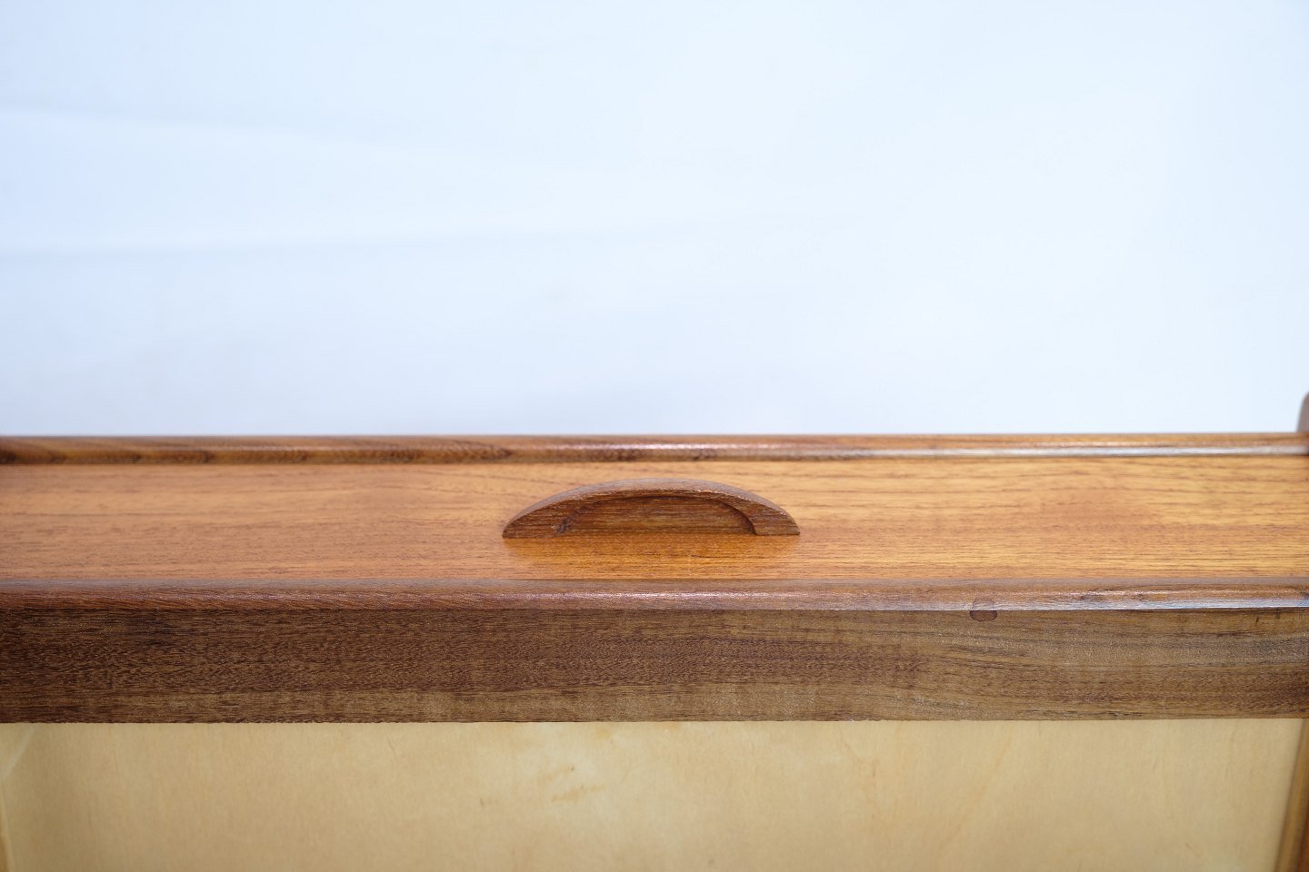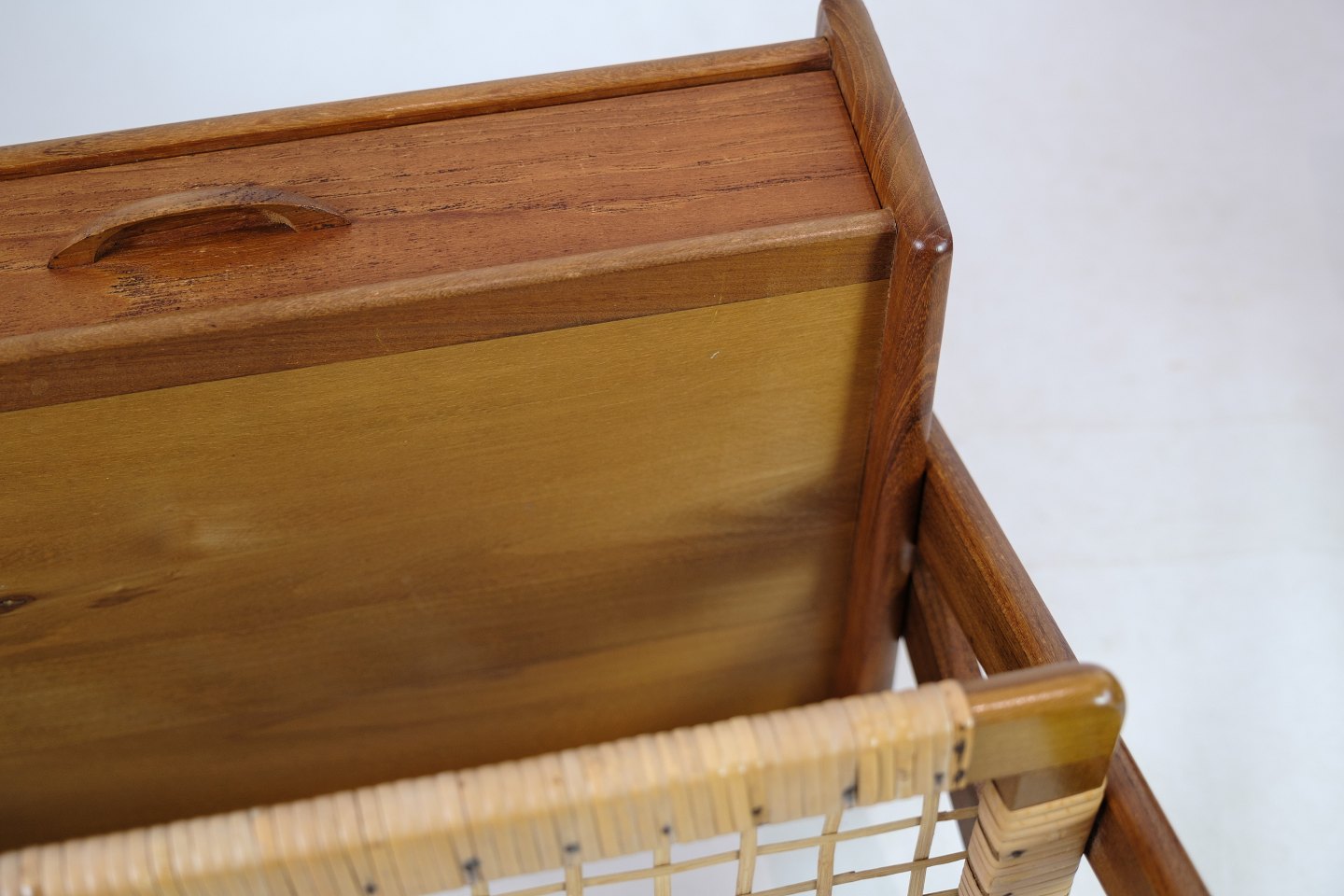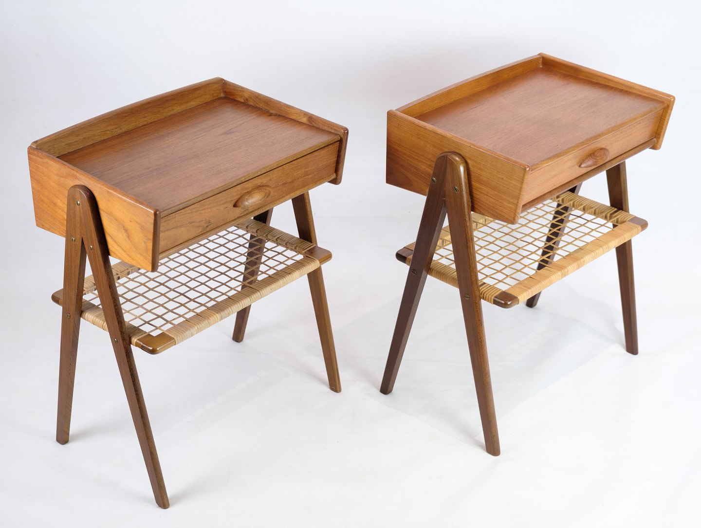 A pair of bedside tables / bedside tables, designed by Søren Rasmussen in teak wood with drawer and wicker lid from around the 1960s.