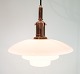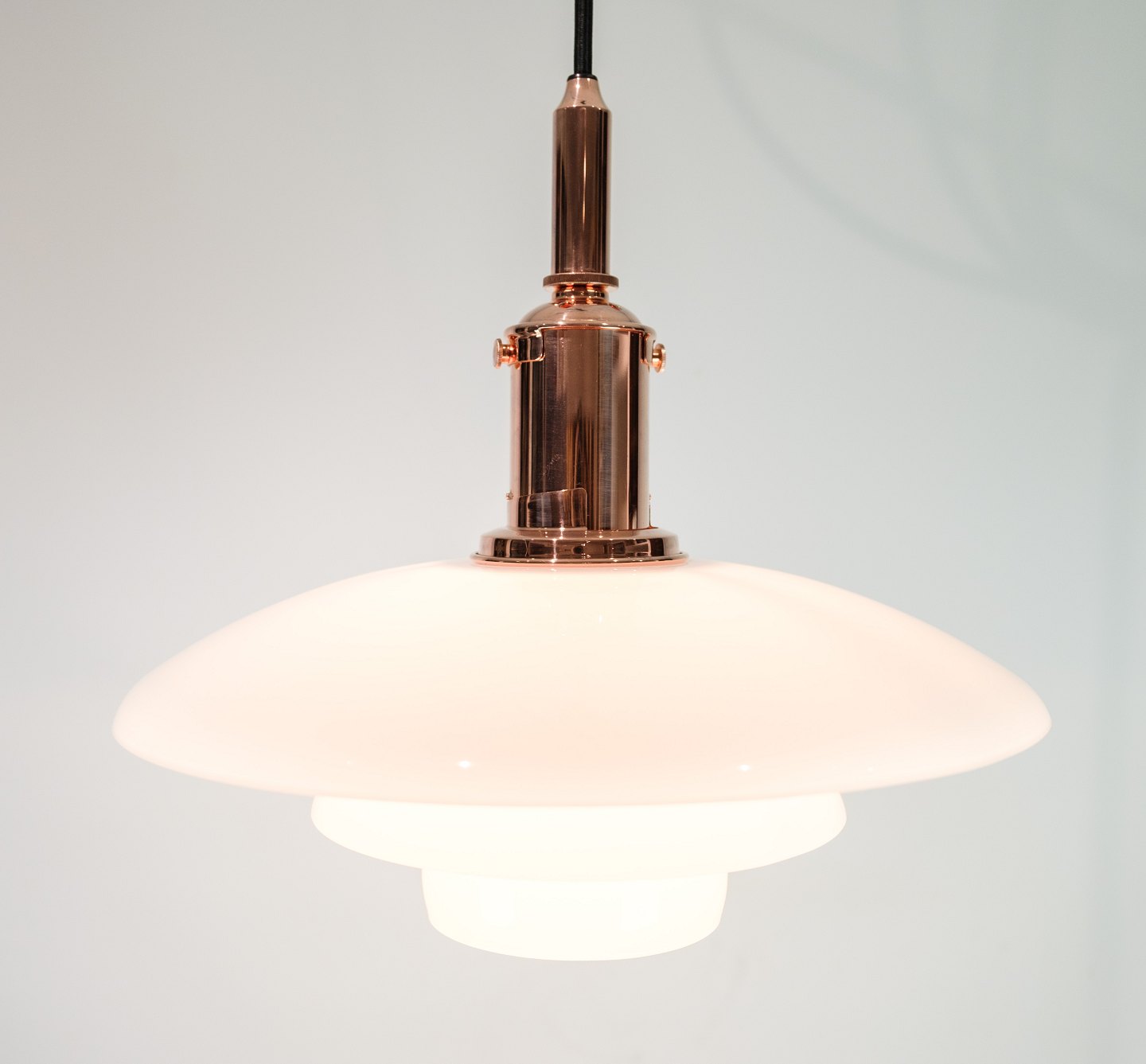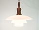 PH pendant, model 3½-3, limited edition in copper, designed by Poul Henningsen and produced by Louis Poulsen. On the occasion of Poul Henningsen's 120th birthday. Was only produced between 1 March 2014 to 30 May 2014. The lamp is made of copper with two lower shades of white opal glass. An upper scade in white opal glass is also included in the price