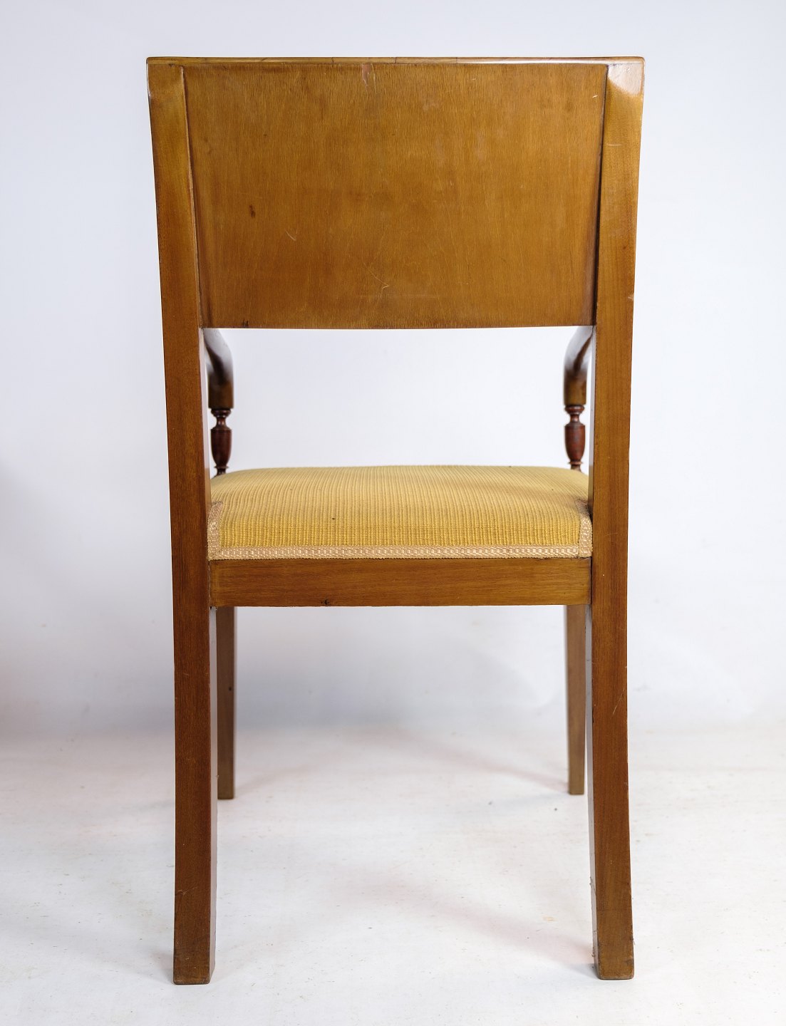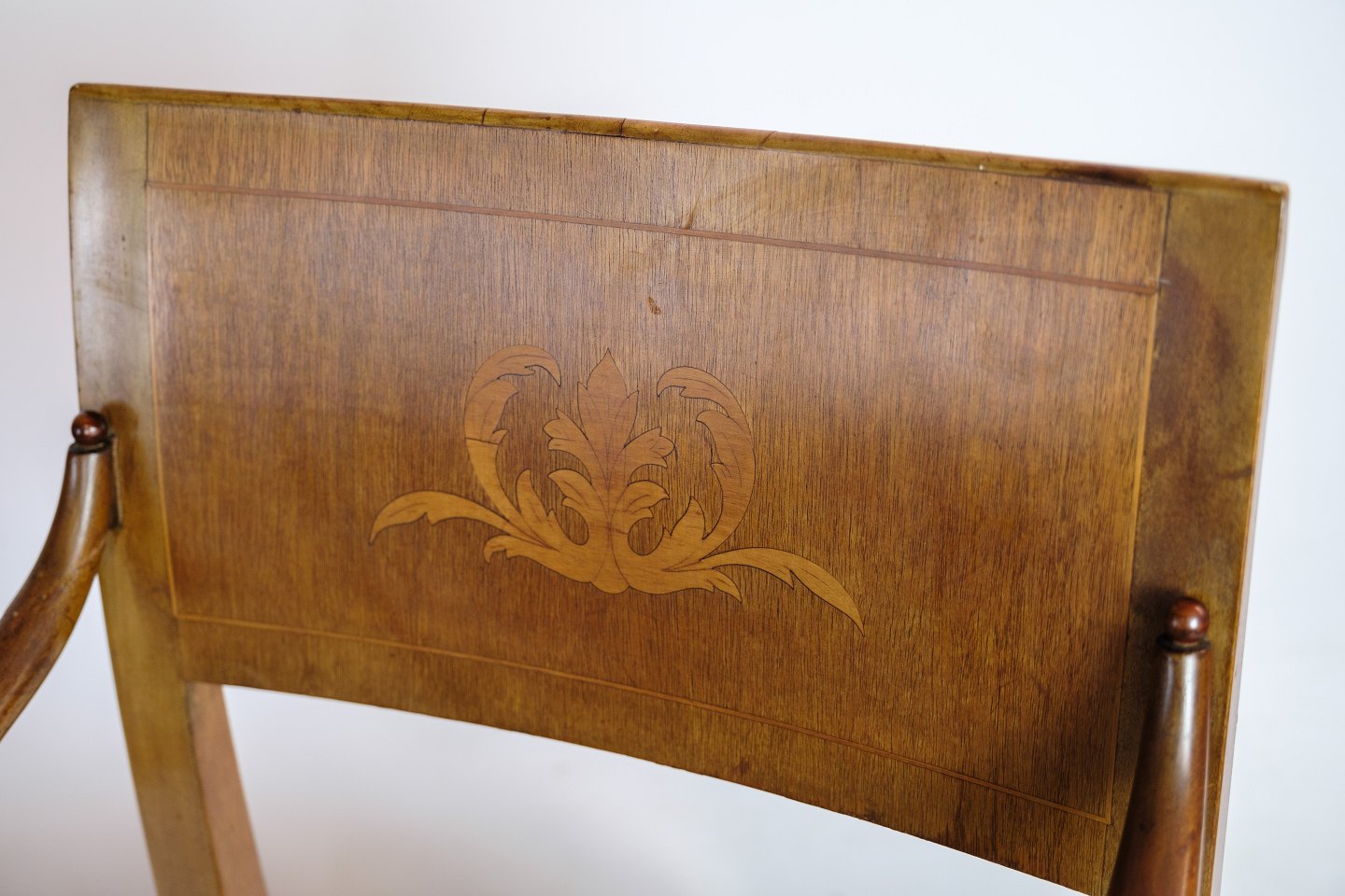 Et par armstole i håndpoleret mahogni af dansk empire stil med intarsia i ryggen af stolen fra omkring 1920'erne.