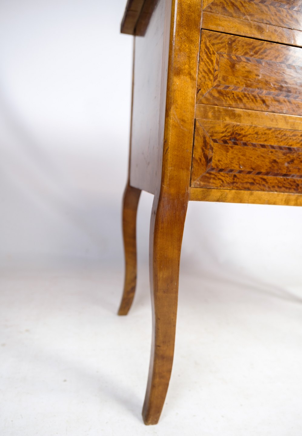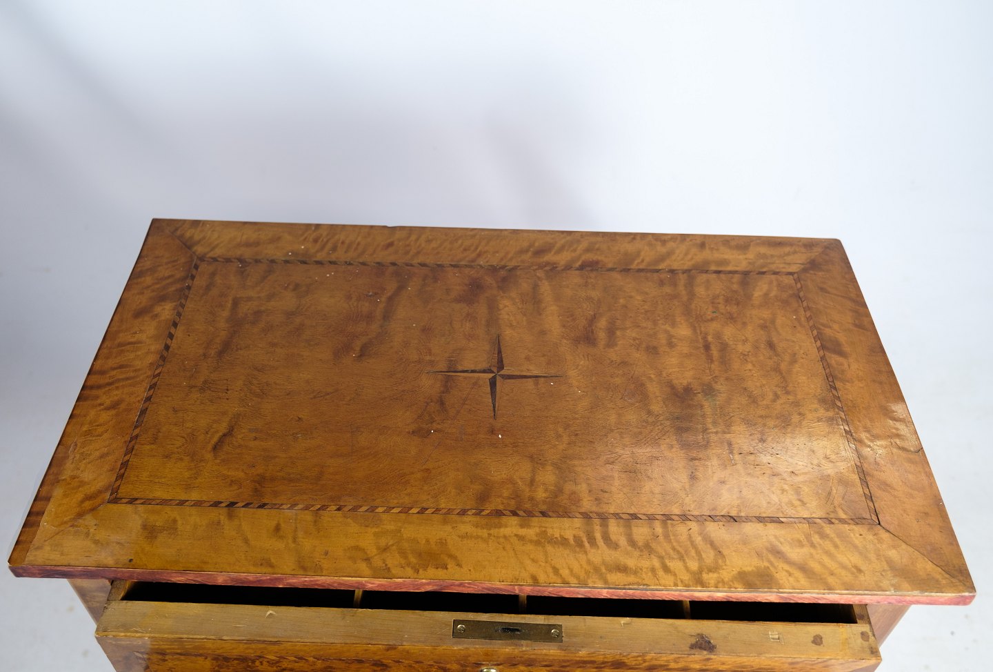 SoldAntique chest of drawers in walnut with marquetry and brass keyholes from around the 1920s. Key included.