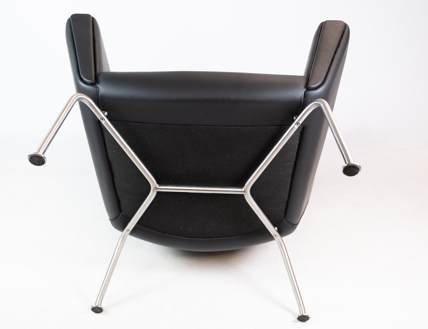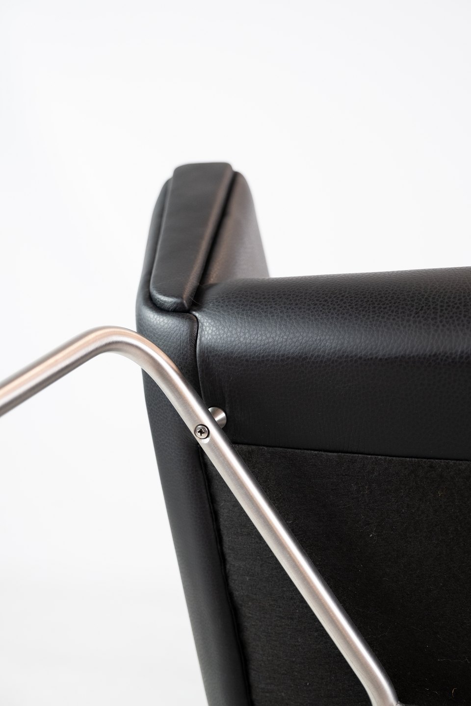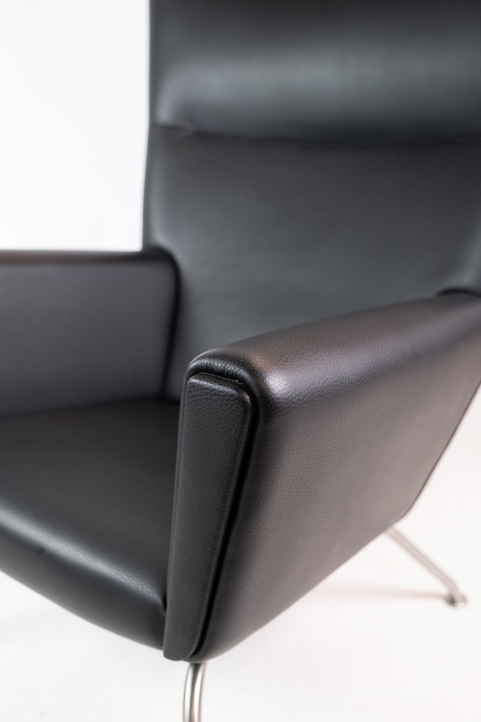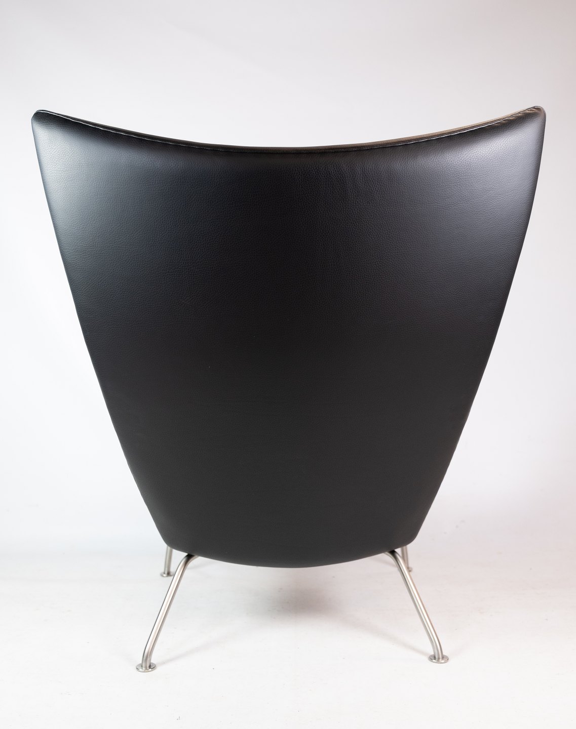 SoldWing chair armchair, model CH445, in brushed steel and black leather. Originally, the Wing Chair was only produced in a very limited number. Carl Hansen & Søn resumed production in 2006 based on the original 1:1 drawings by Hans J. Wegner.