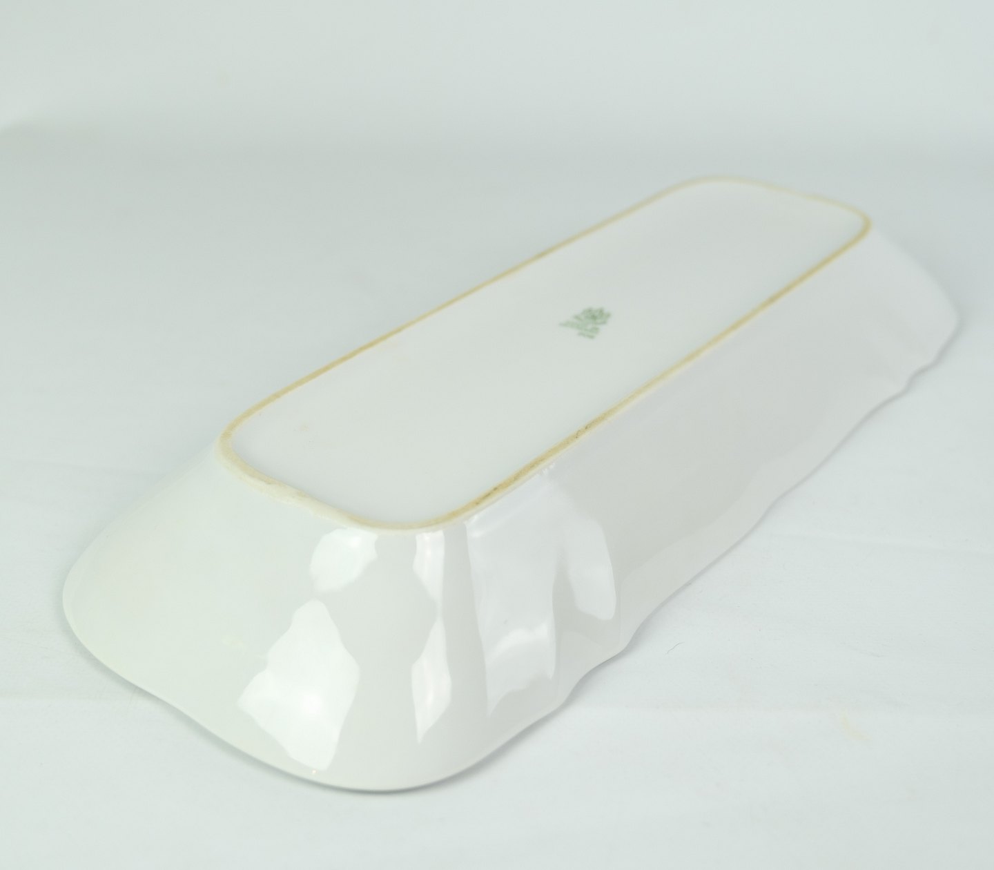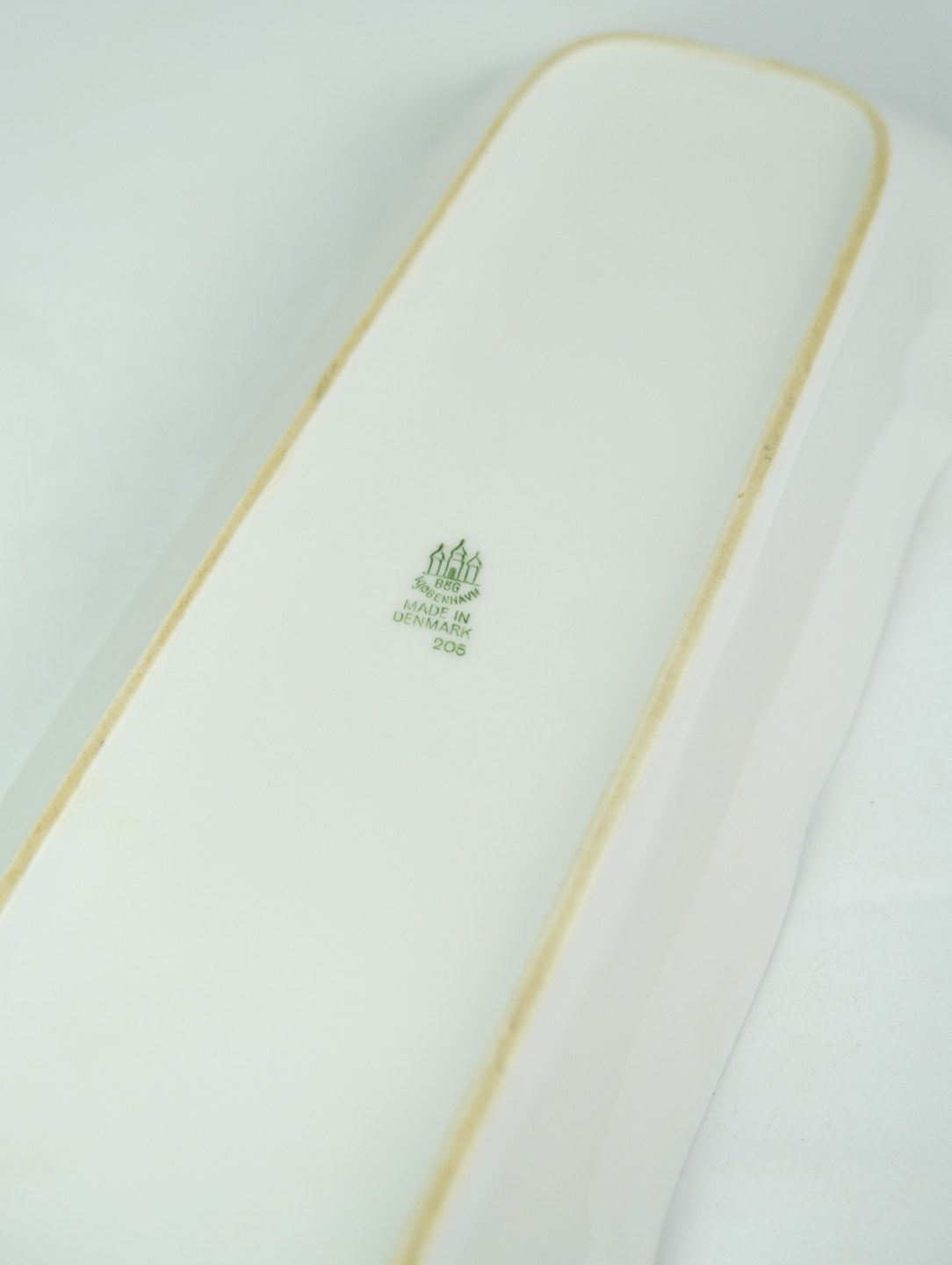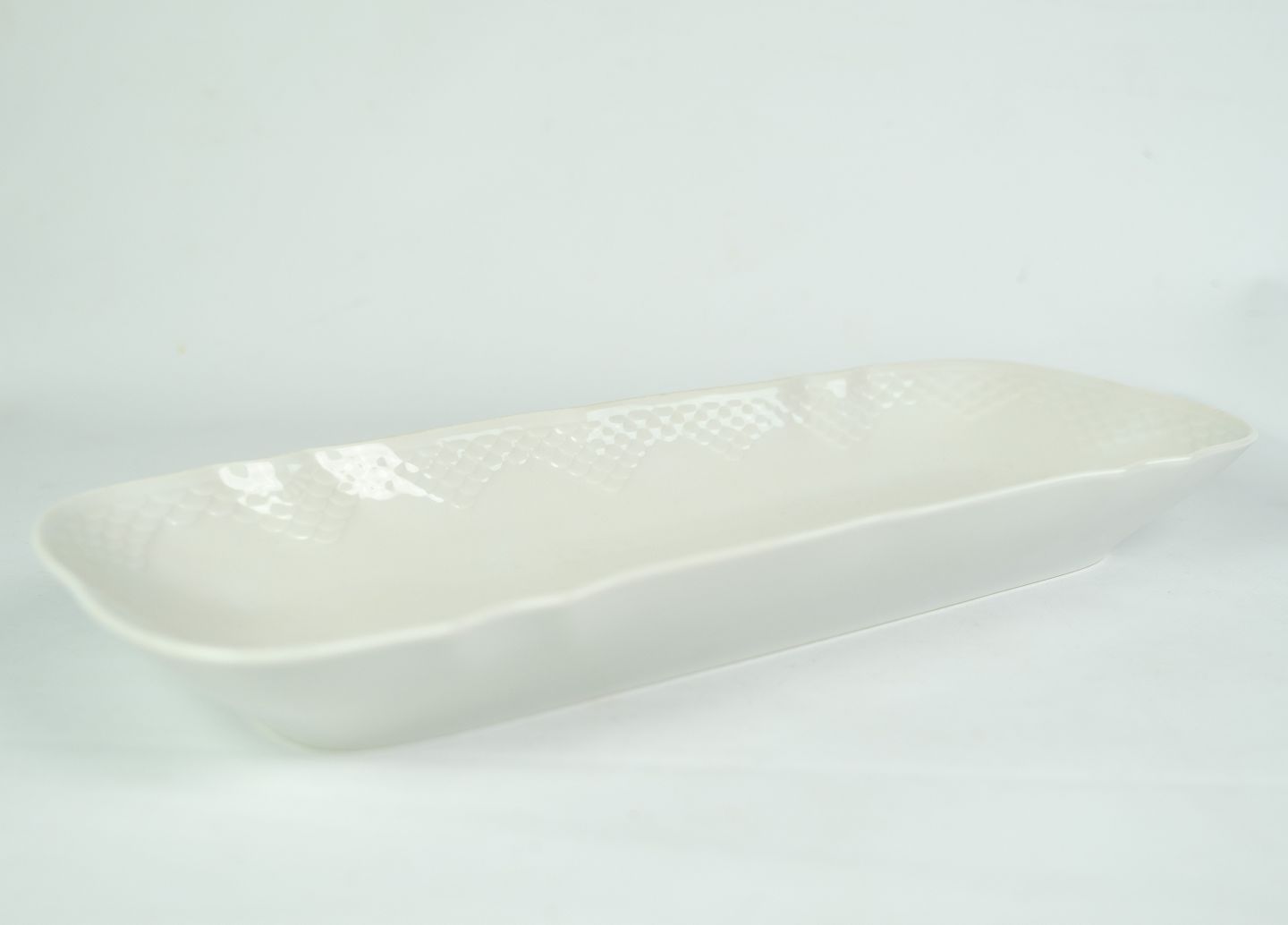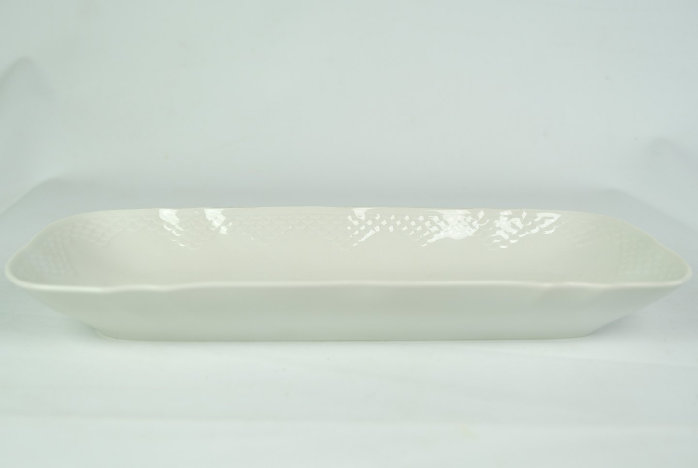 SolgtHvid riflet aflangt fad fra Bing & Grøndahl i porcelæn fra omkring år 1950'erne.