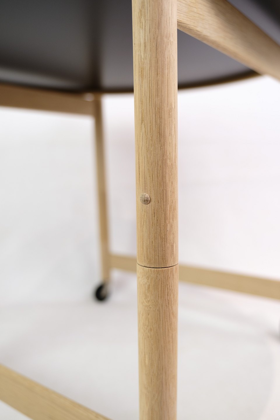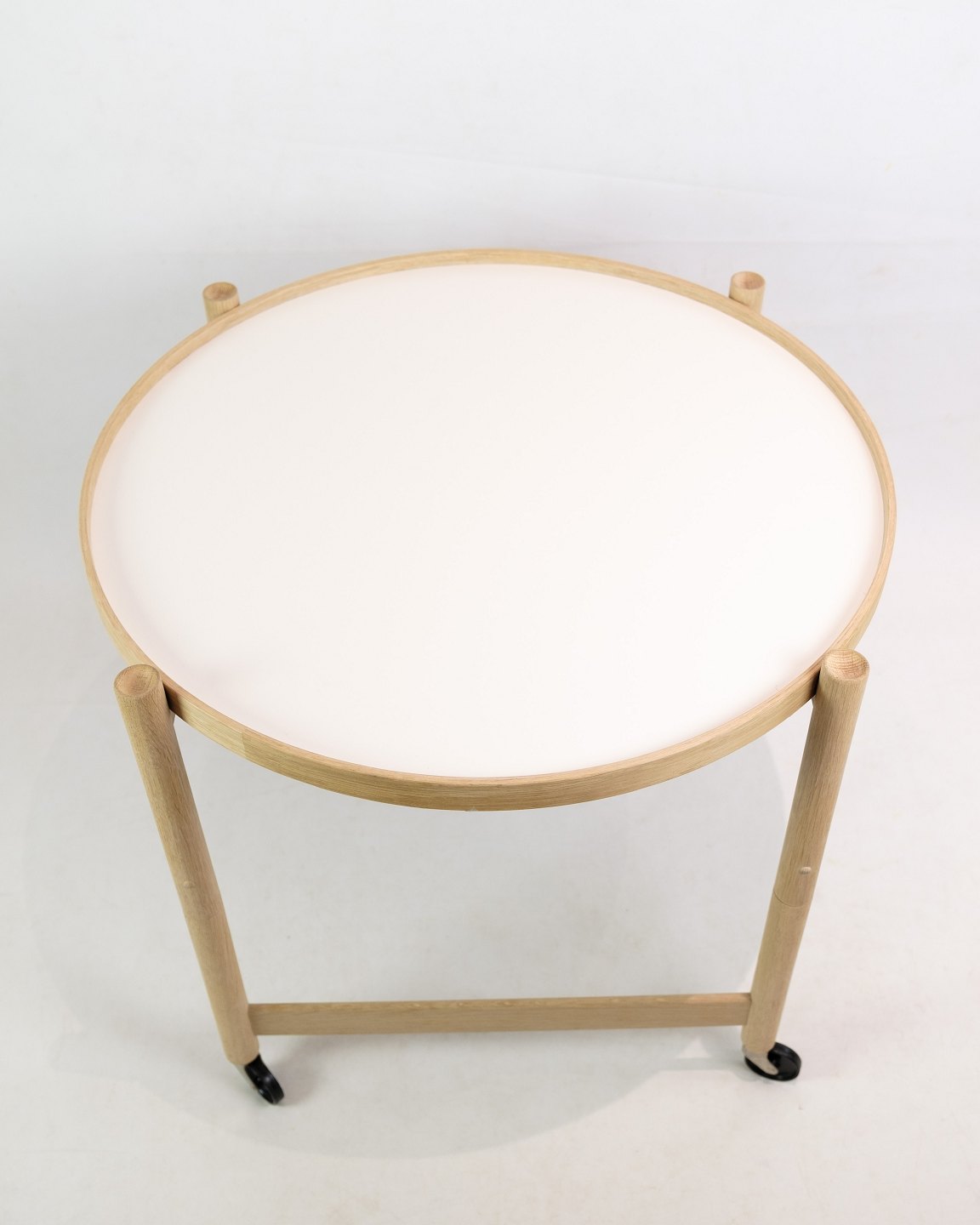 SolgtBakkebord, designet af Hans Bølling af træsorten egetræ med bakke af hvid laminat.