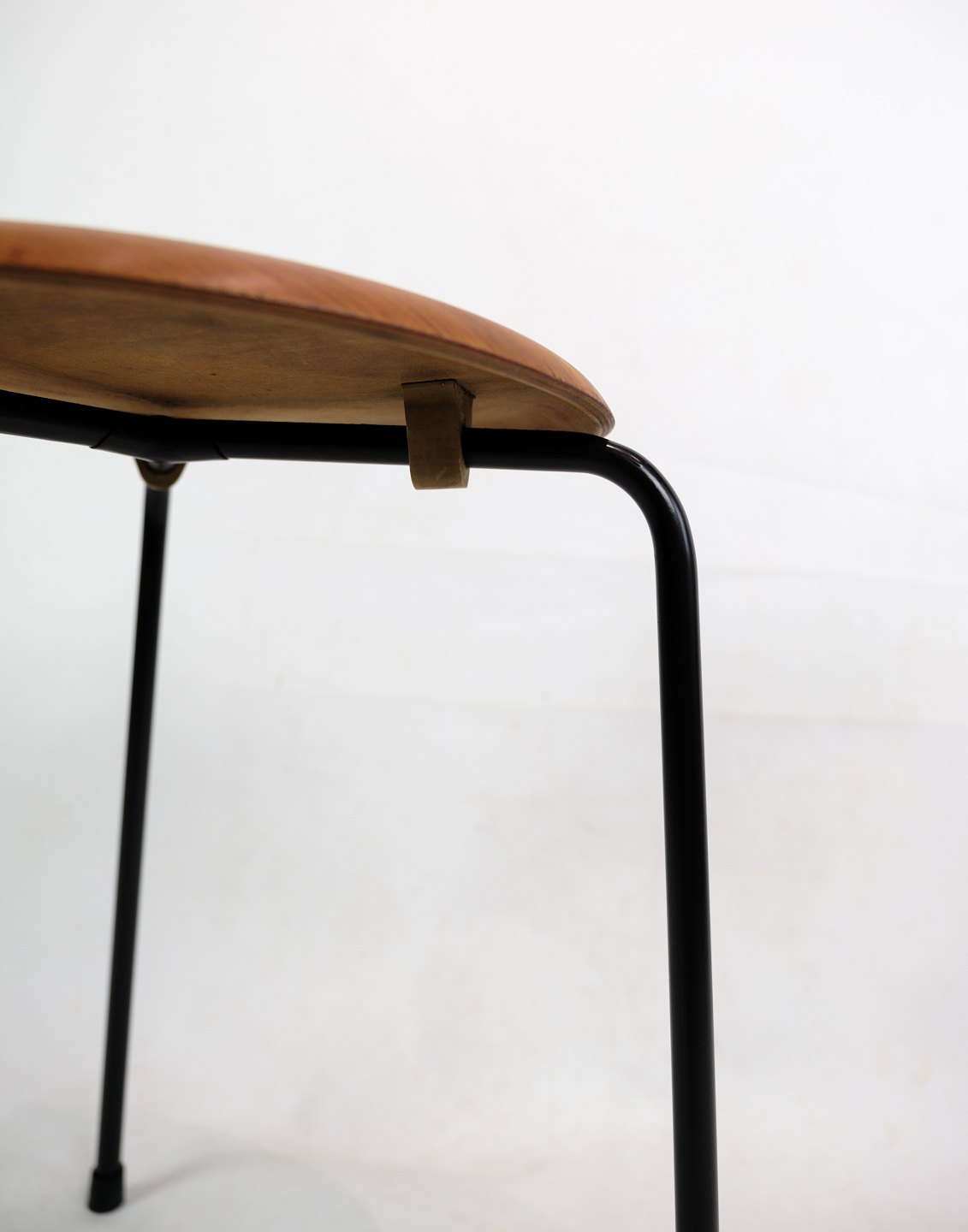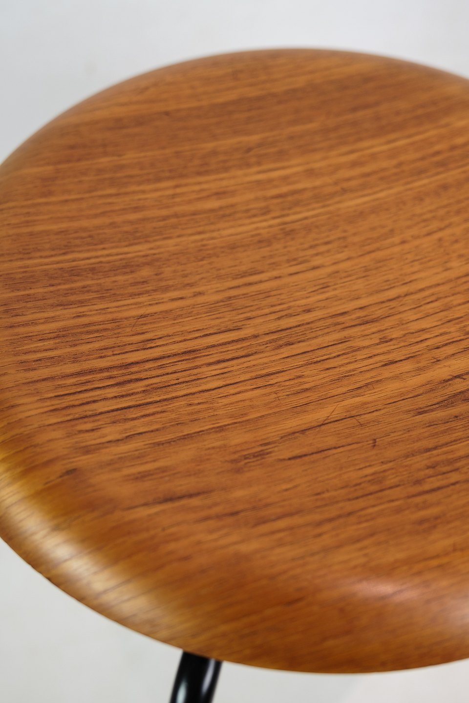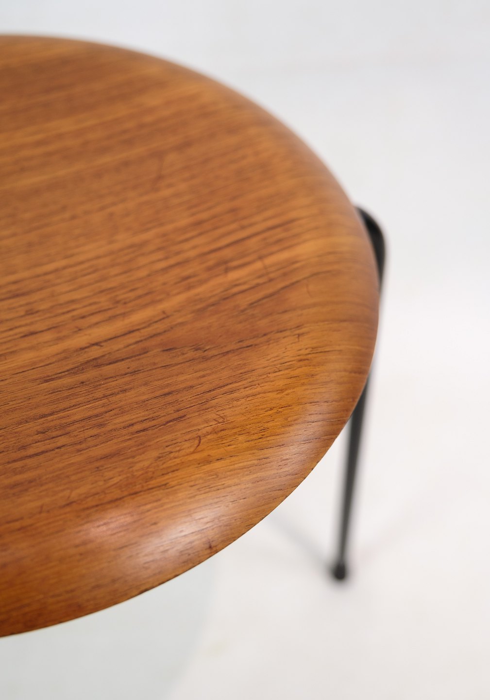 SoldA set of teak stools with a black frame, designed by Arne Jacobsen and manufactured by Fritz Hansen from around the 1950s.