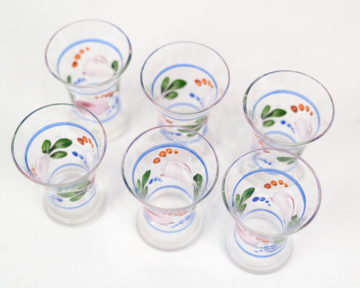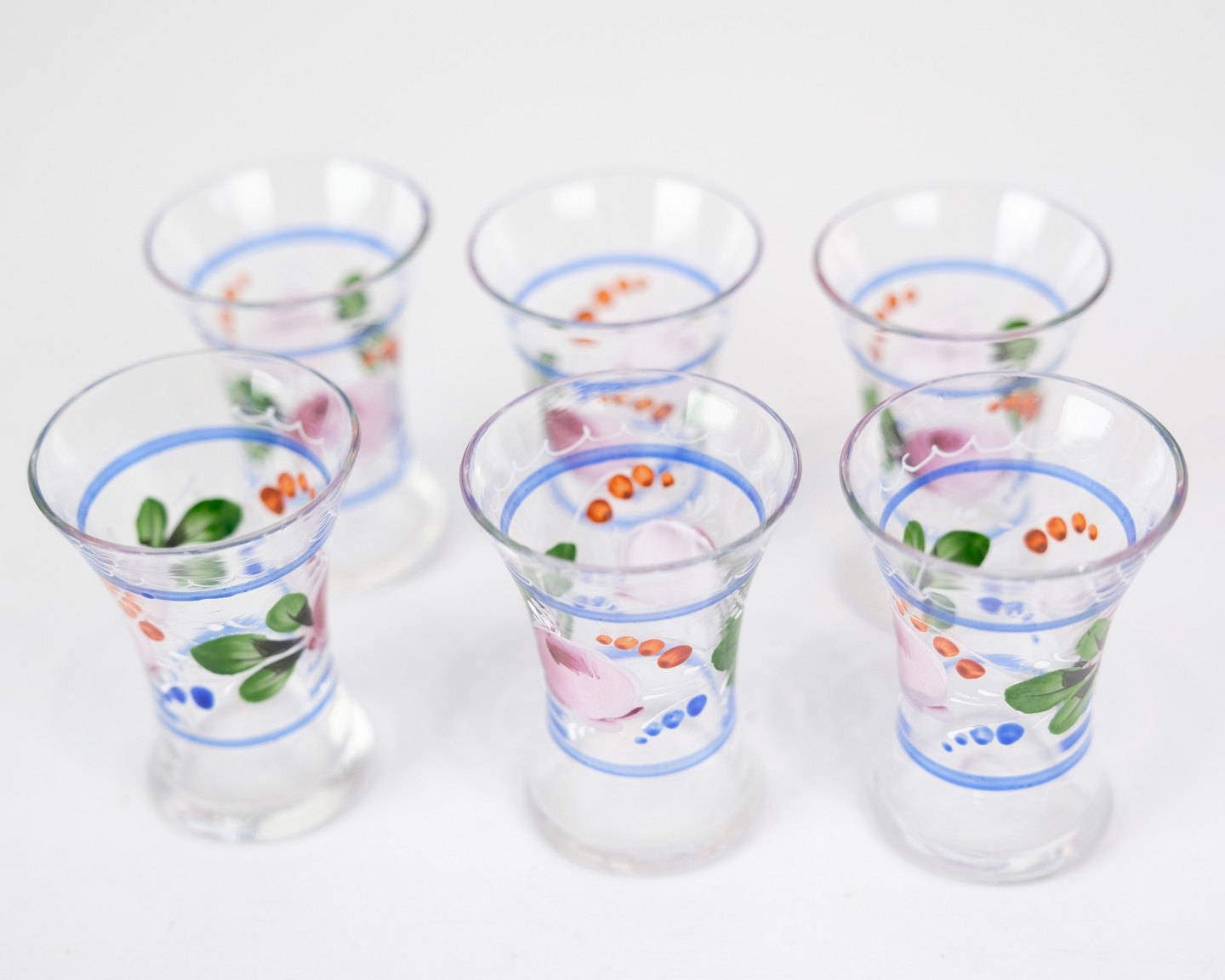 Sæt af 6 snapseglas med håndmalet blomster dekoration fra omkring 1930'erne. Sælges samlet for 600 for alle 6.