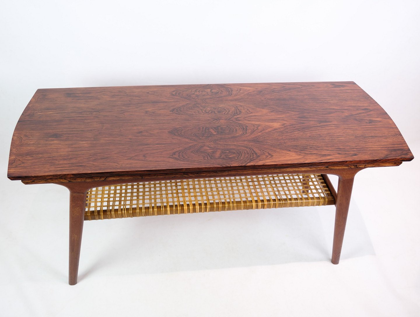 SolgtSofabord i palisander af Heltborg Møbler Danmark med underliggende flethylde fra omkring 1960'erne. Sofabordet har også udtræksplader i hver side, som gør det henholdsvis 47 cm og 87 cm bredt.