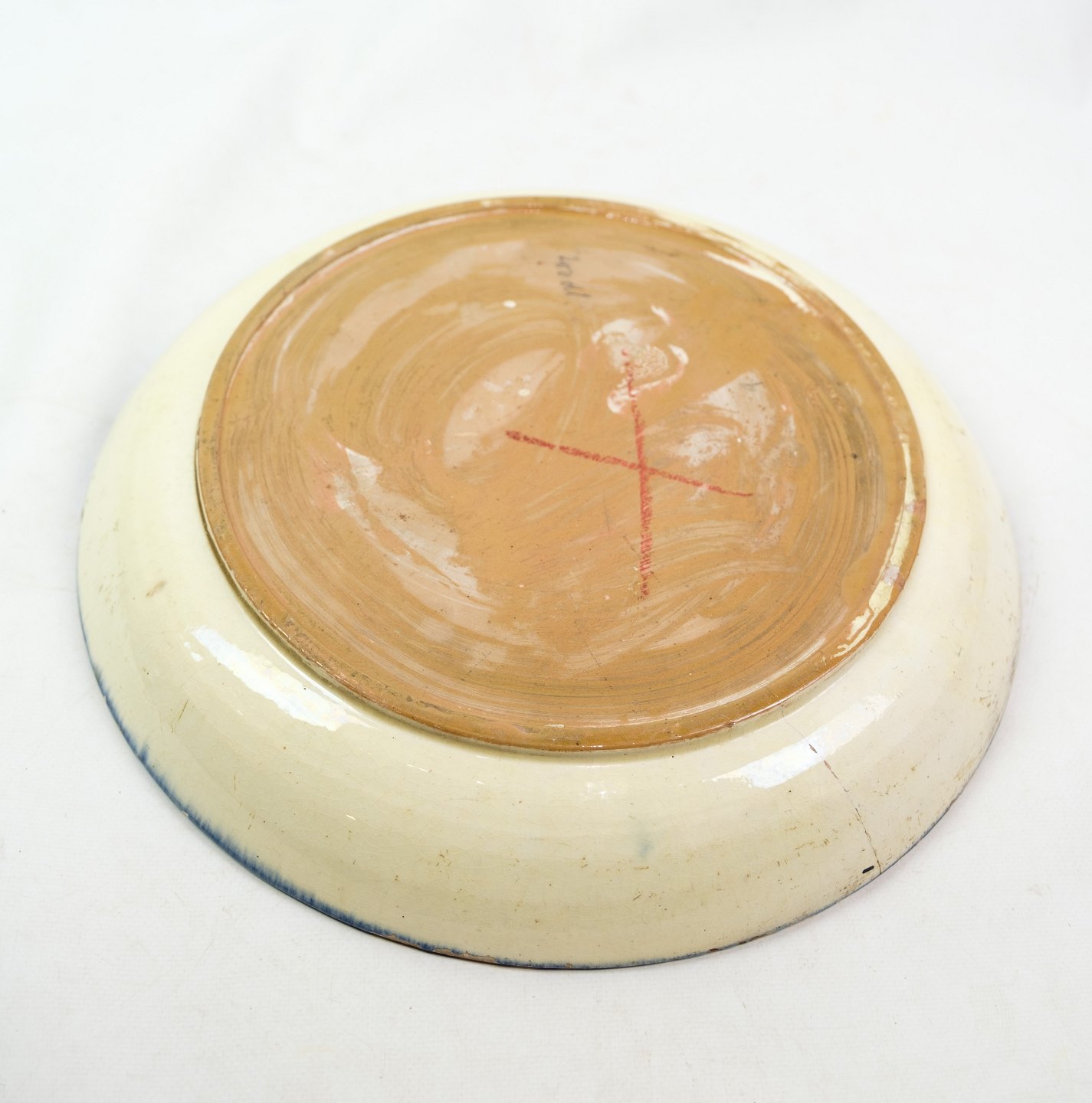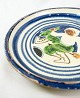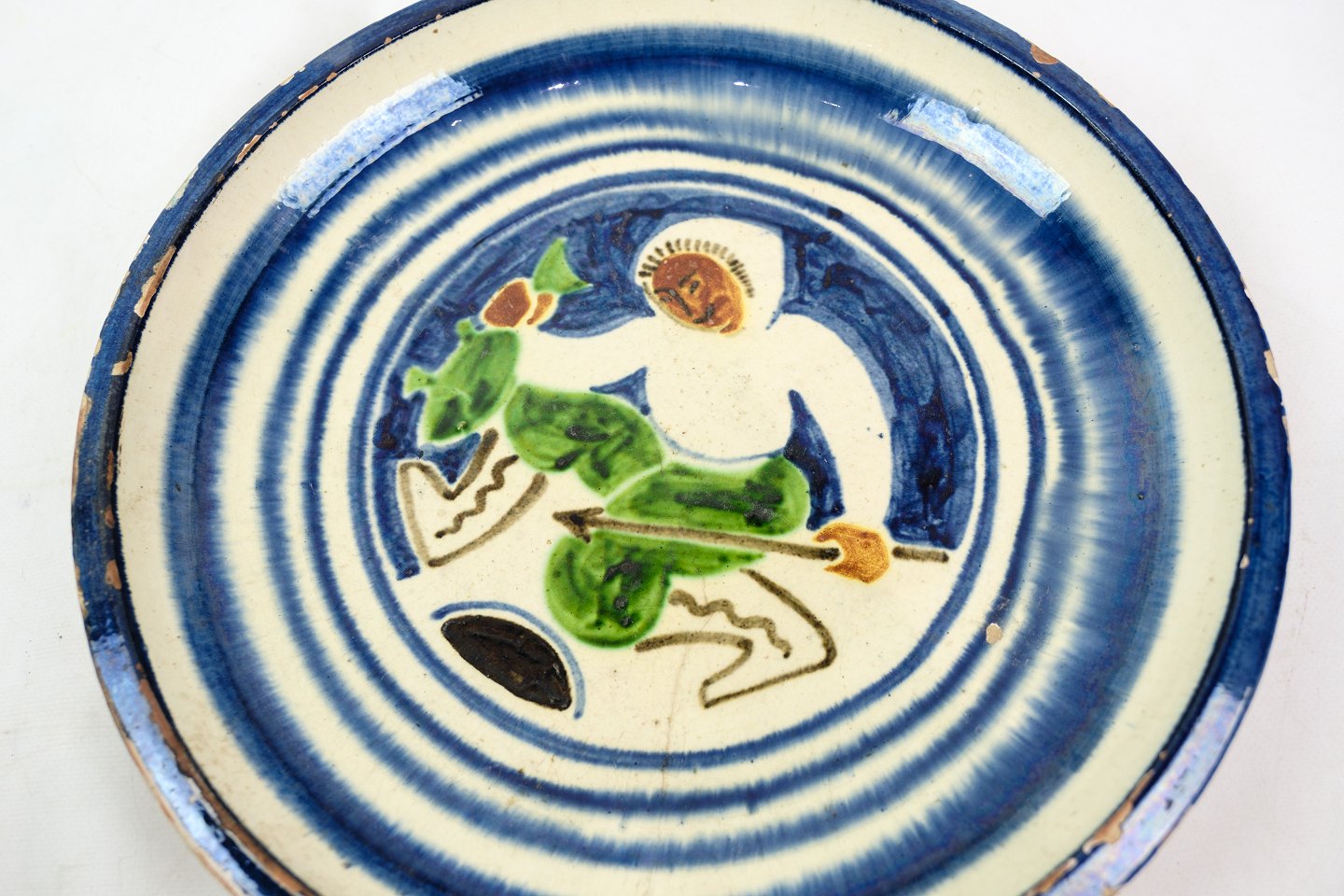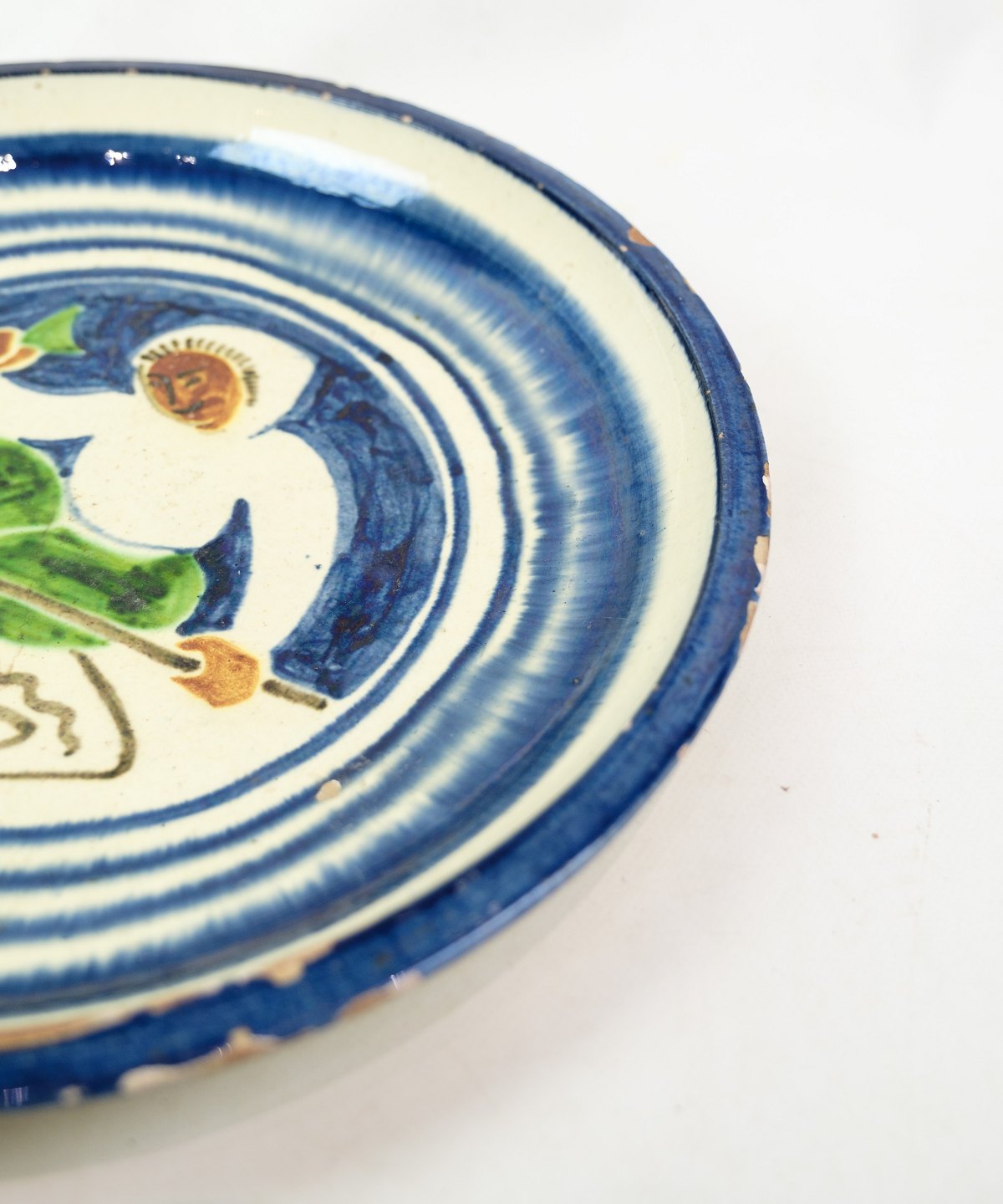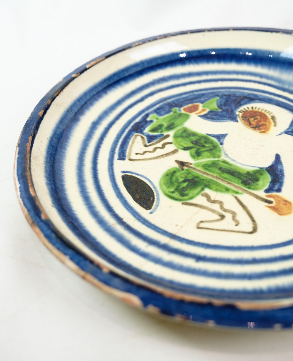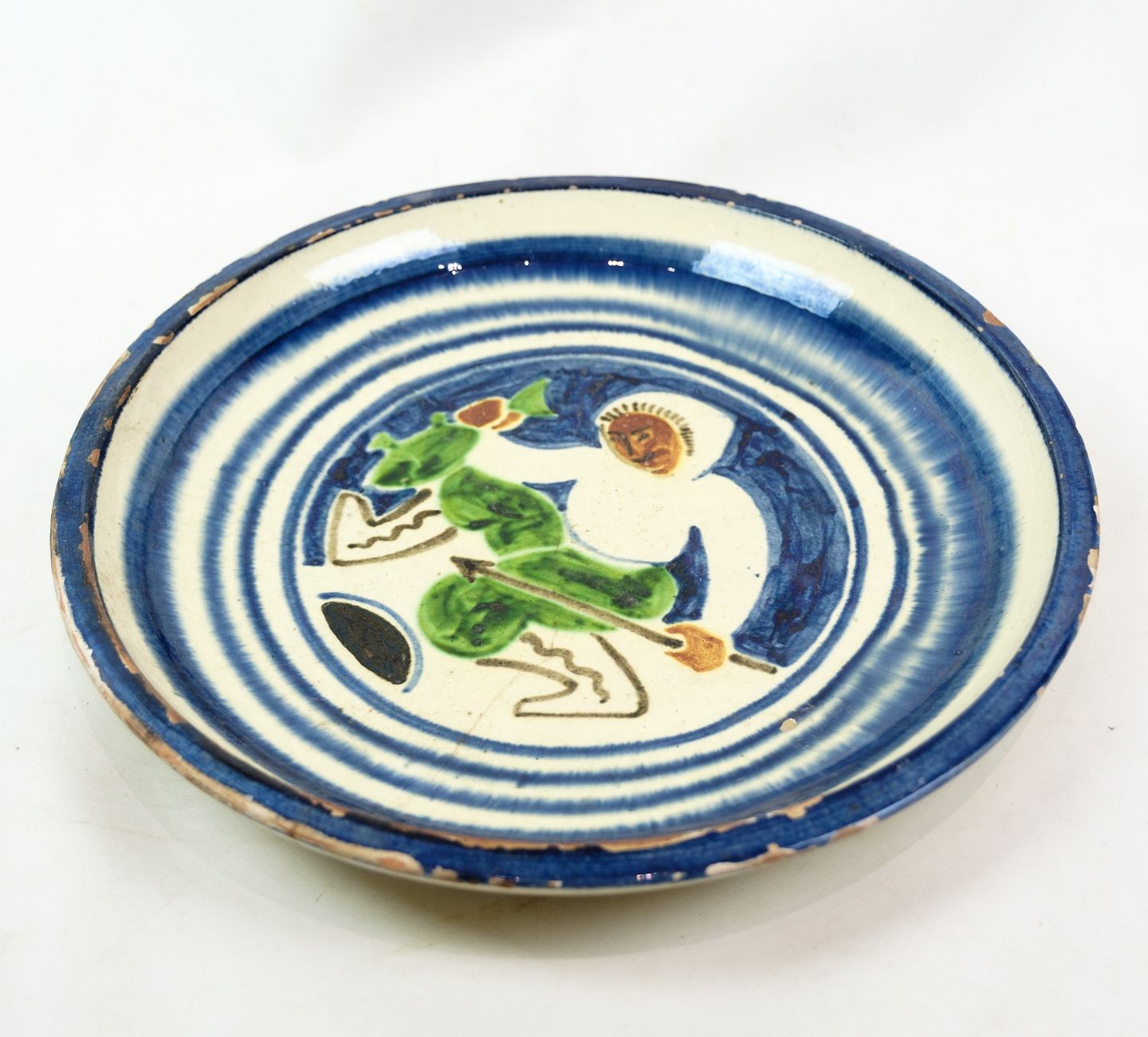 Rundt stort keramik fad i blå nuancer med motiv af en eskimo af Grimstrup keramik Næstved keramik nummeret 200.