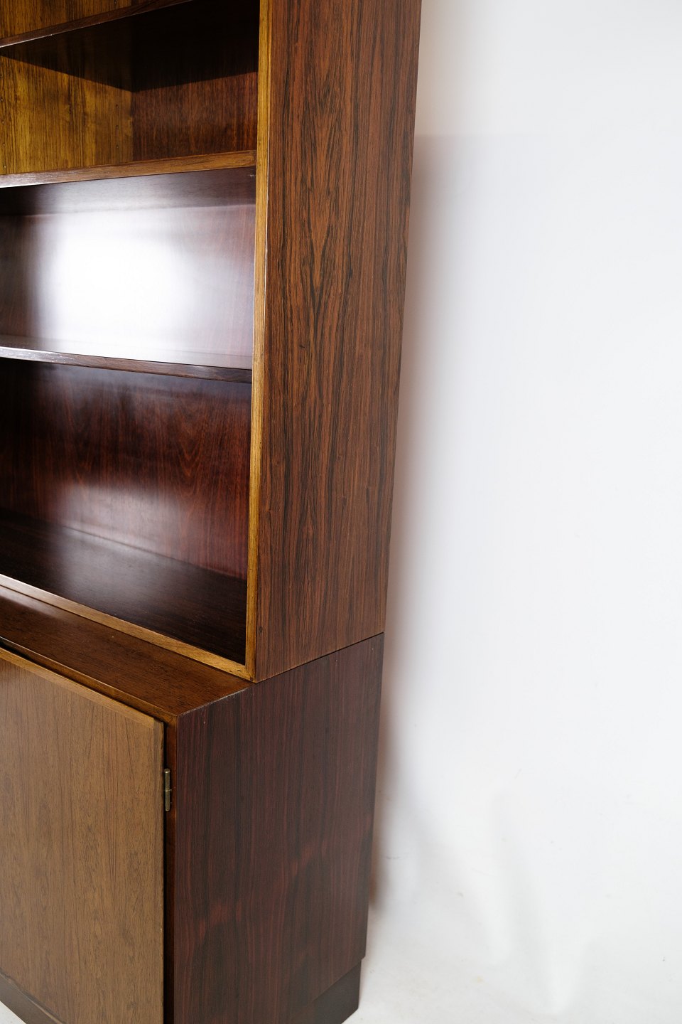 Fremstillet af palisander udstråler det varme og naturlige træ en unik skønhed og charme. Systemet består af en underdel med to låger og en vitrineoverdel med hylder, der tilbyder både funktionel opbevaring og smuk udstillingsplads.