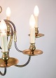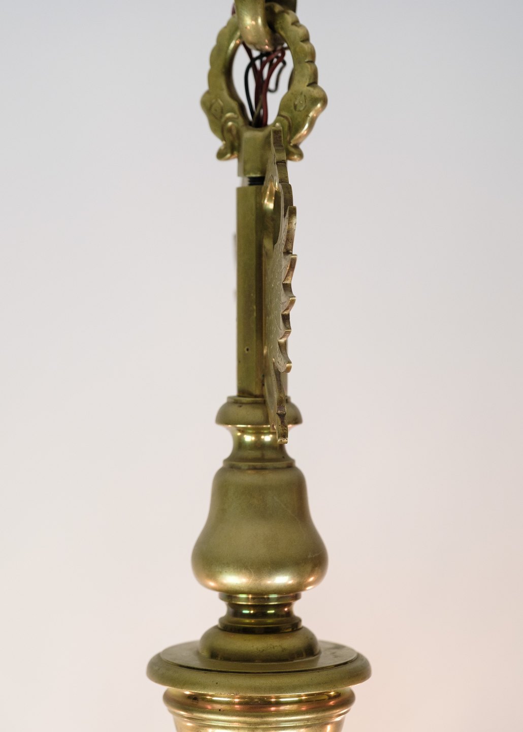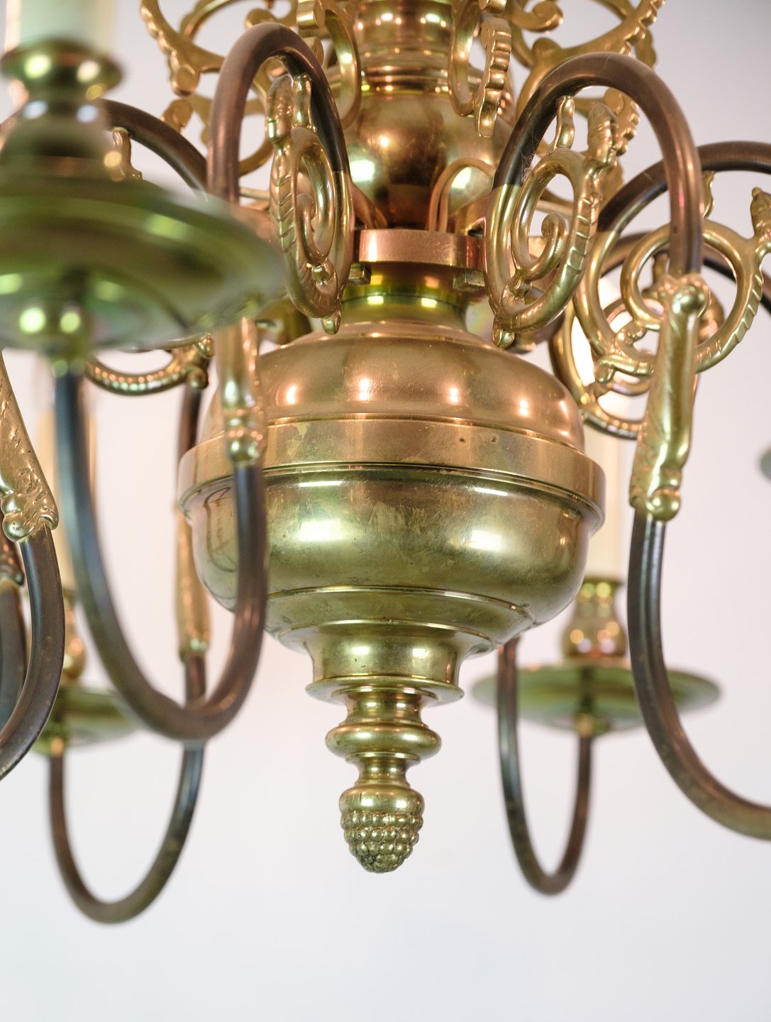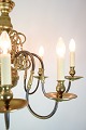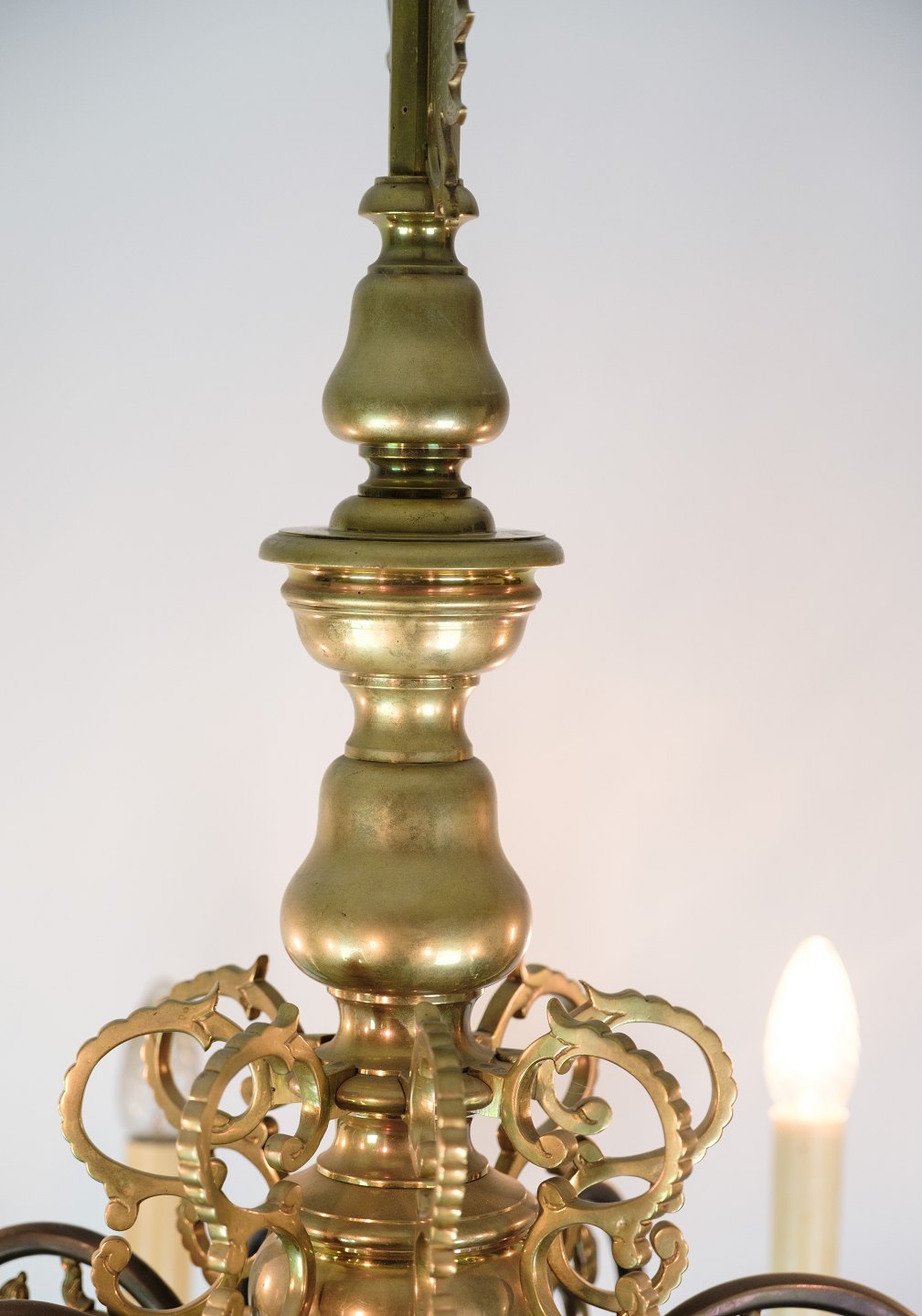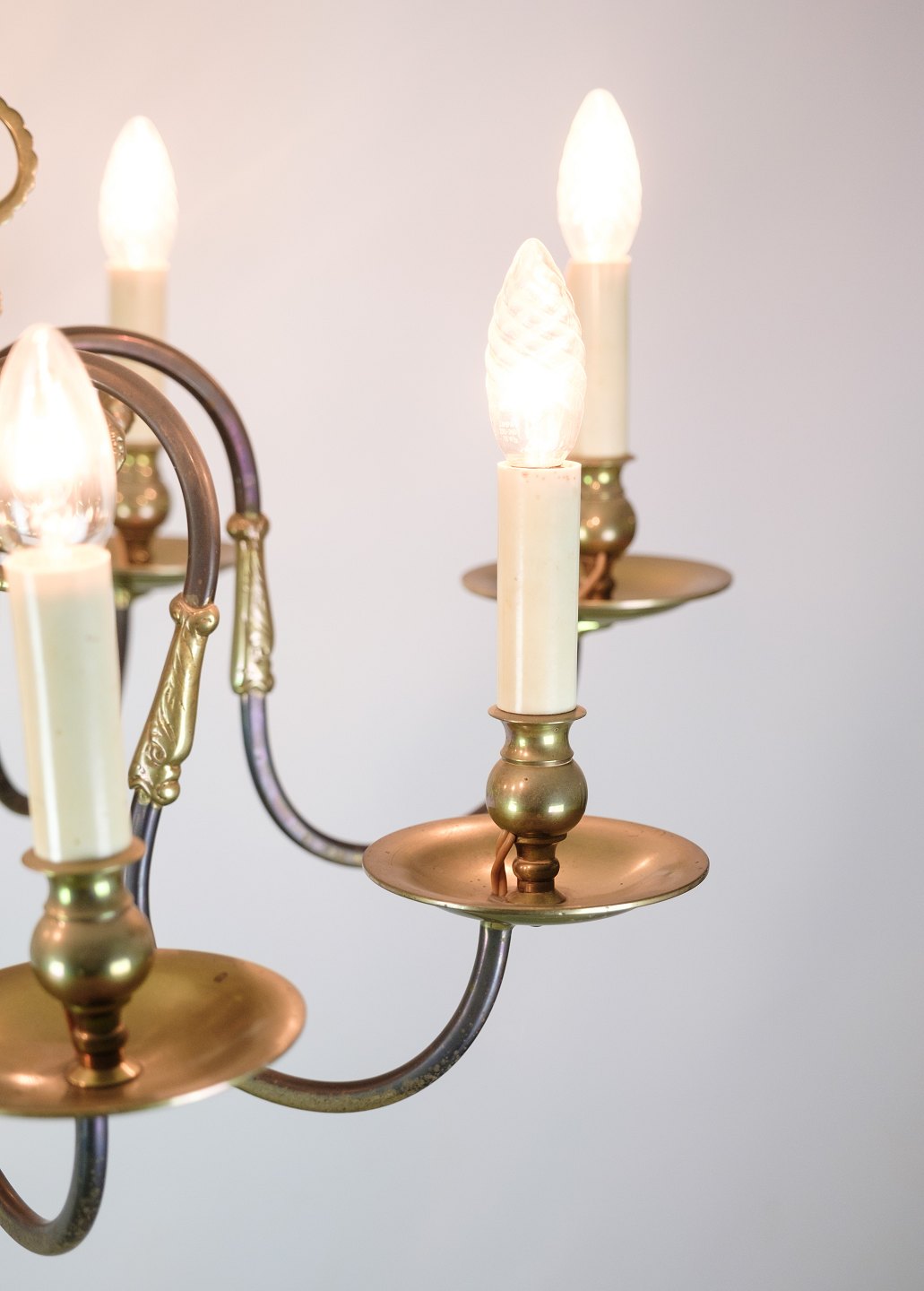Church chandelier with eight arms in a French style of brass from around the 1920s. The lamp can be connected to power.