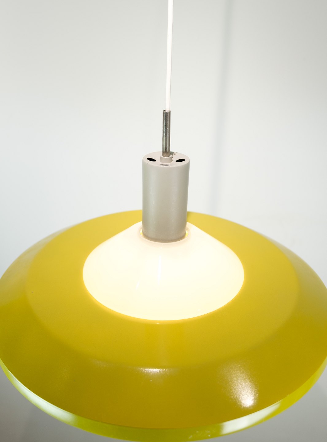 Stockholm pendant in yellow lacquered metal and opal glass by Louis Poulsen from the 1960s.