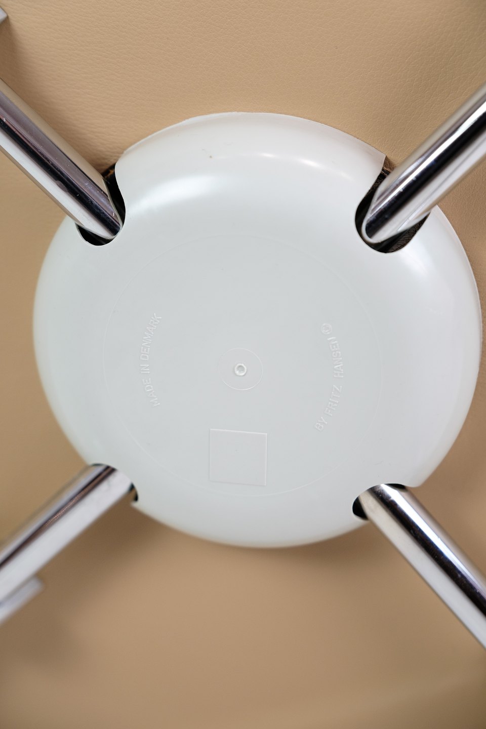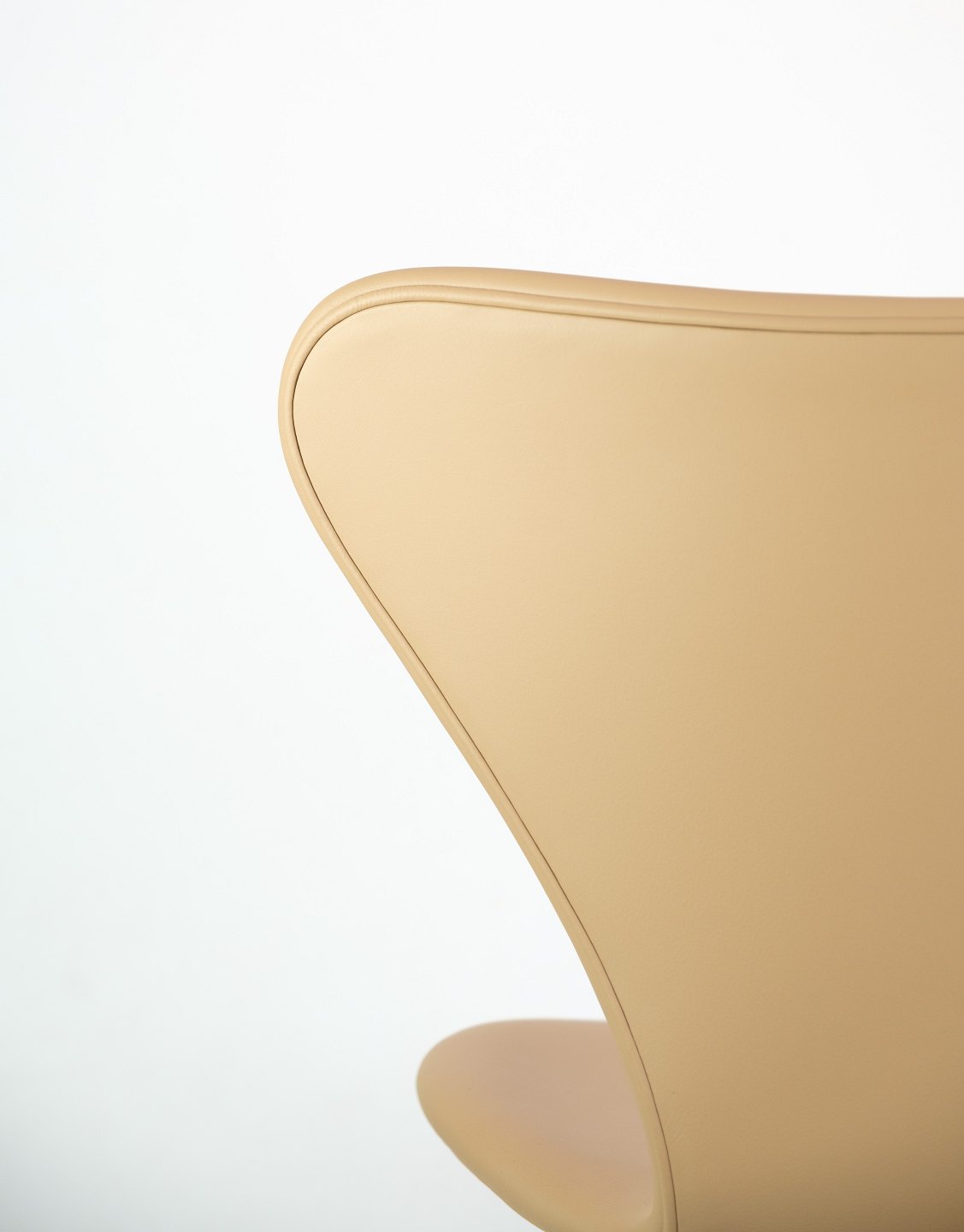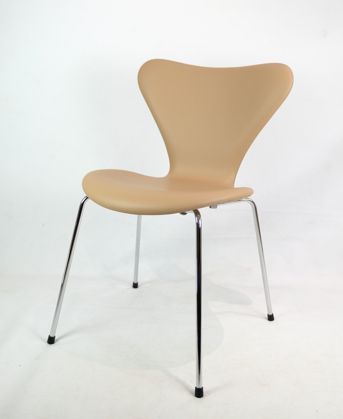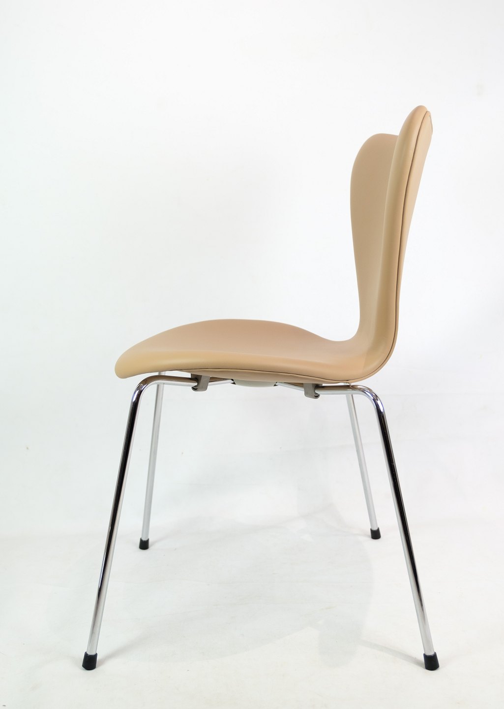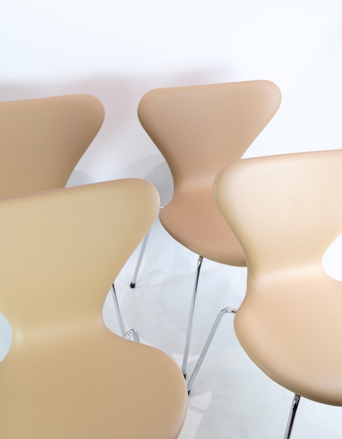Et sæt af 4 Syver stole, model 3107, designet af Arne Jacobsen og fremstillet hos Fritz Hansen. Stolene er polstret i cream farvet elegance læder og i rigtig flot brugt stand. Vi kan polstre flere efter ønske.