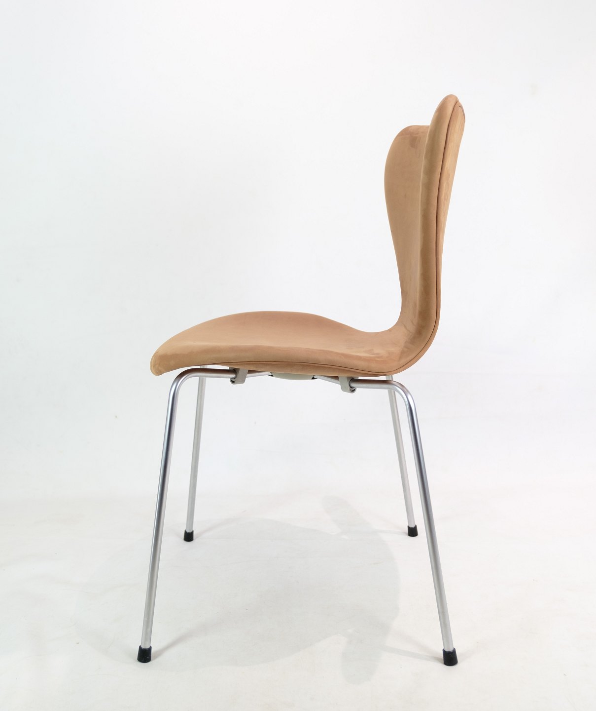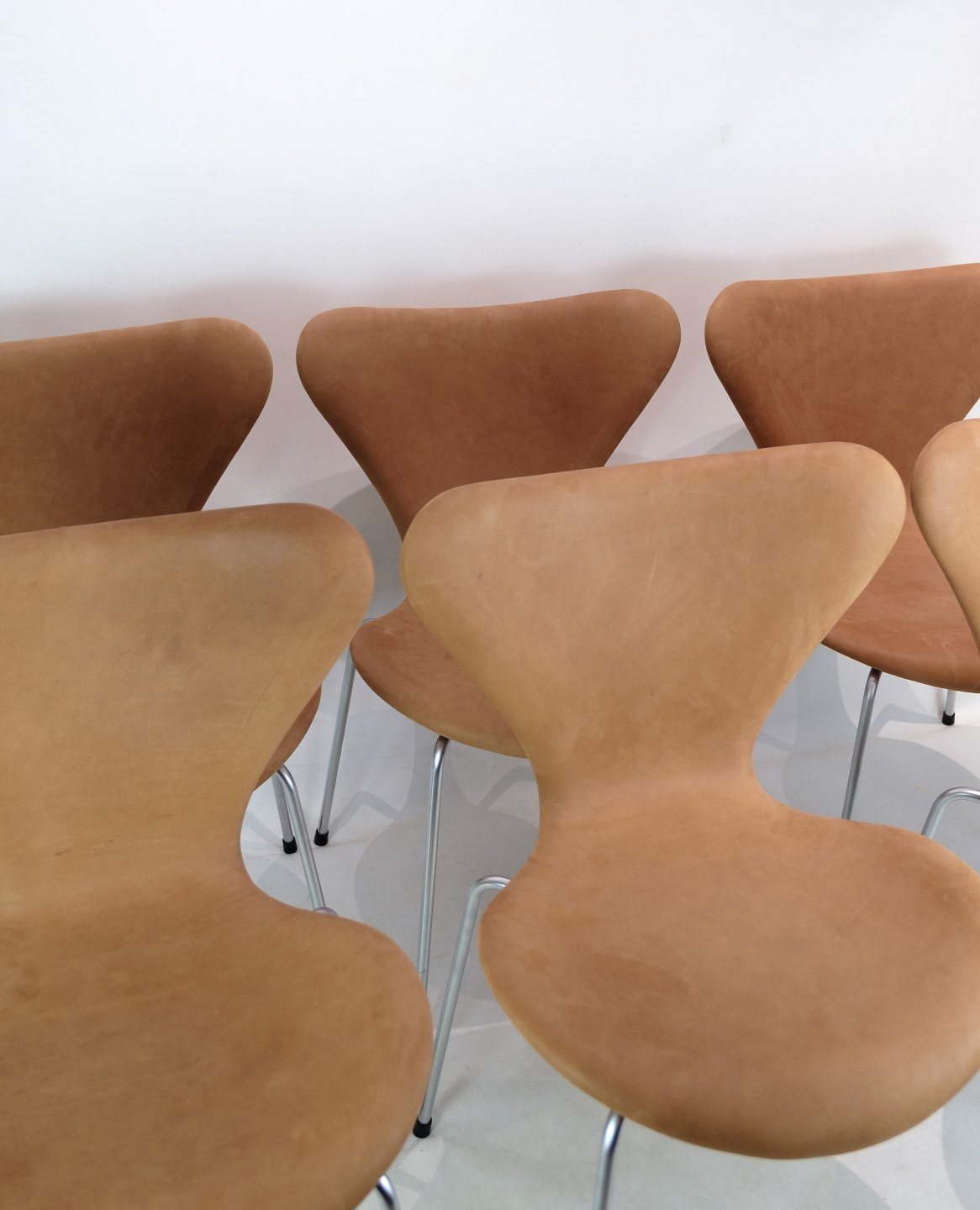 A set of 6 Seven chairs, model 3107, designed by Arne Jacobsen and manufactured by Fritz Hansen. The chairs are upholstered in light cognac elegance leather and in very nice used condition.