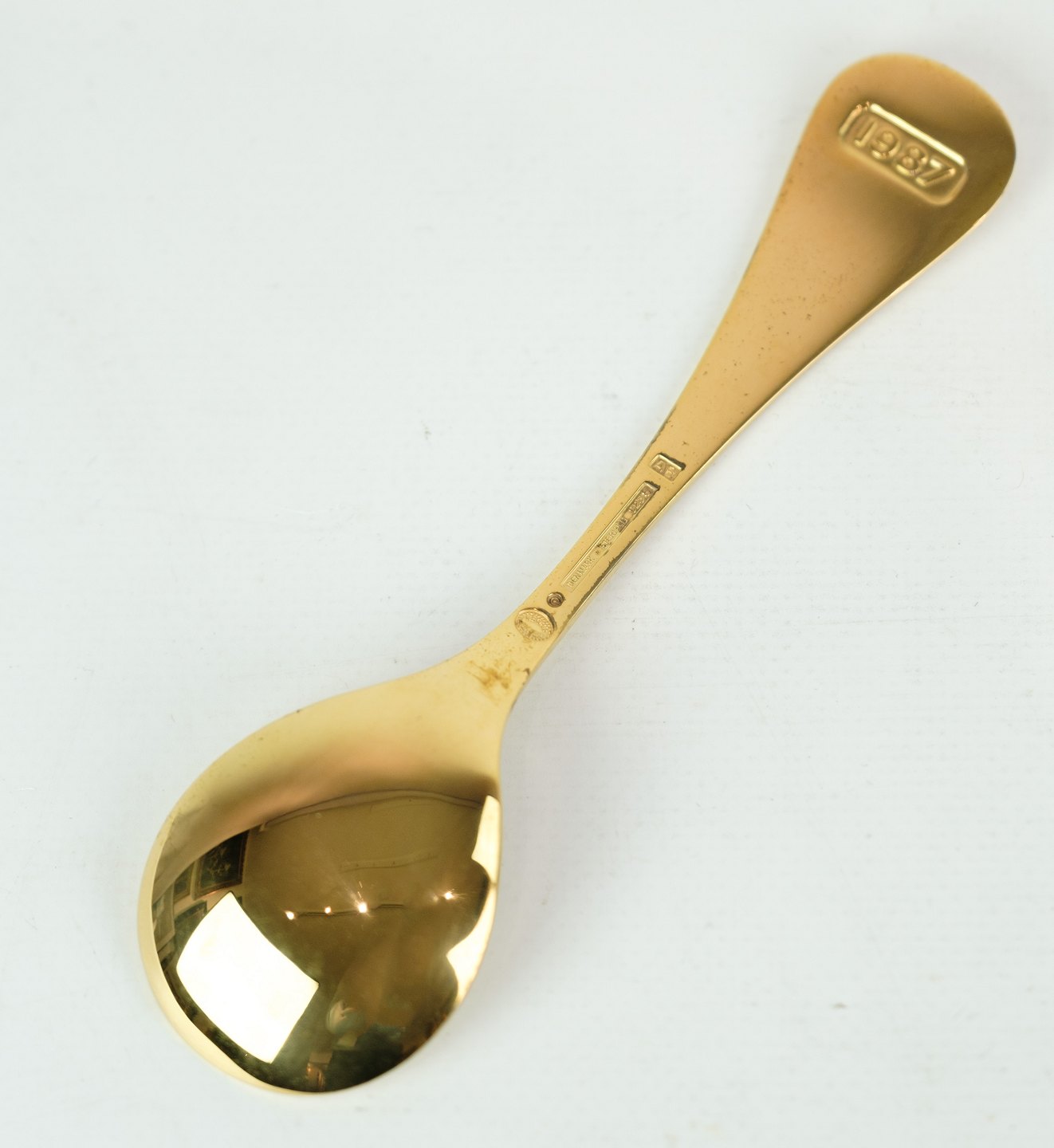 SoldGeorg Jensen year 1987 in white bull's eye in gold-plated sterling silver is a beautiful and elegant addition to your silver jewelery collection. The spoon is in good condition and appears with a smooth and shiny surface. The motif on the spoon is a beautiful floral pattern. With its timeless style and the quality of the gold-plated sterling silver, the spoon will be a treasured gift or personal purchase for many years to come