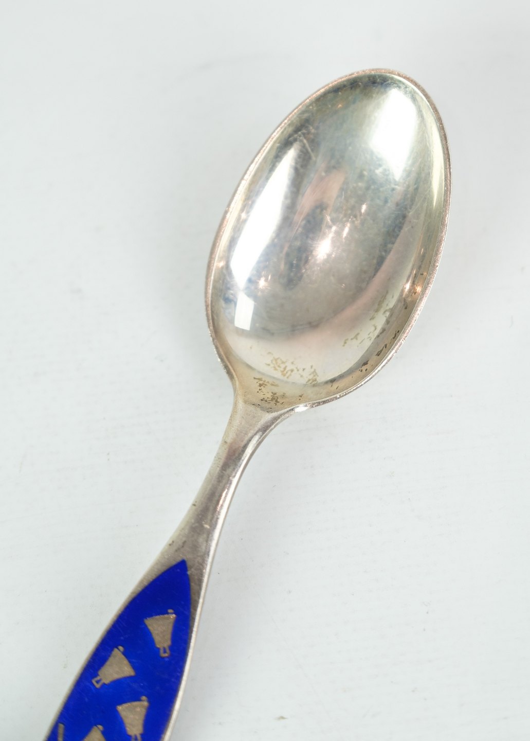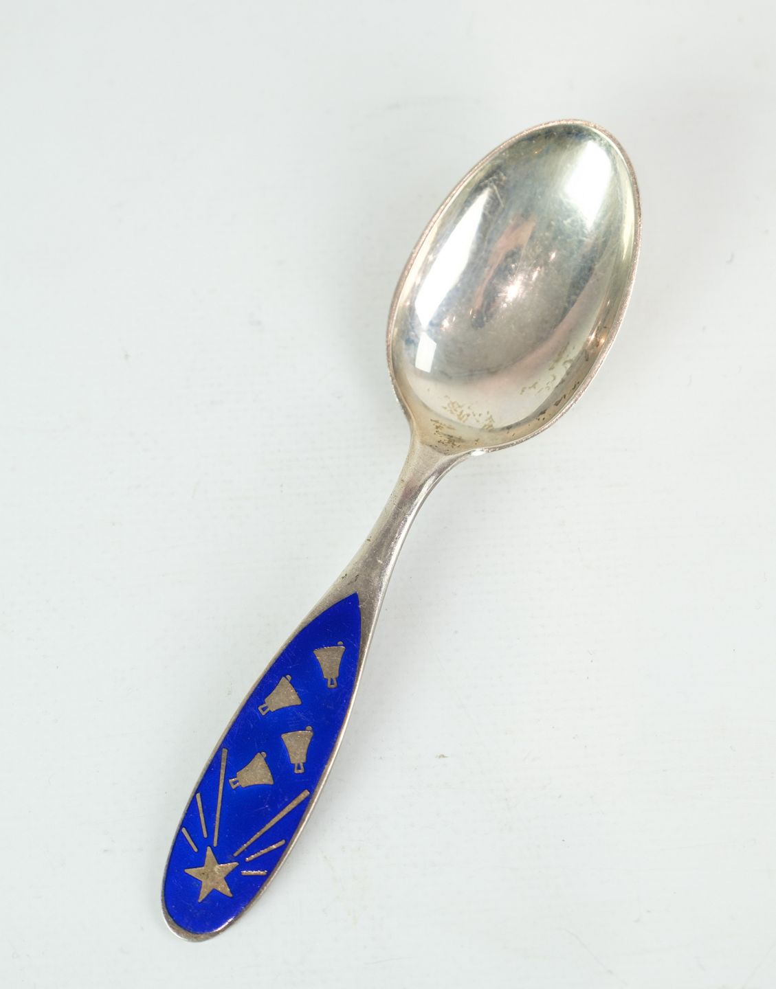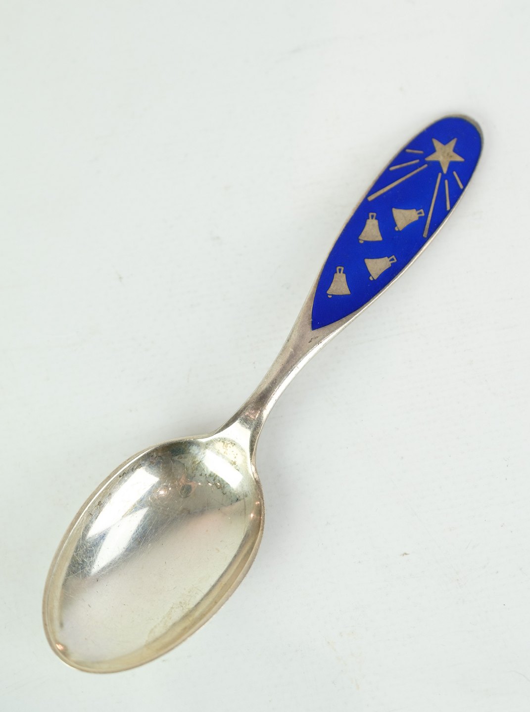 Juleske af P. Hertz i sterling sølv, Danmark med en blå emalje med juleklokker og stjerne på