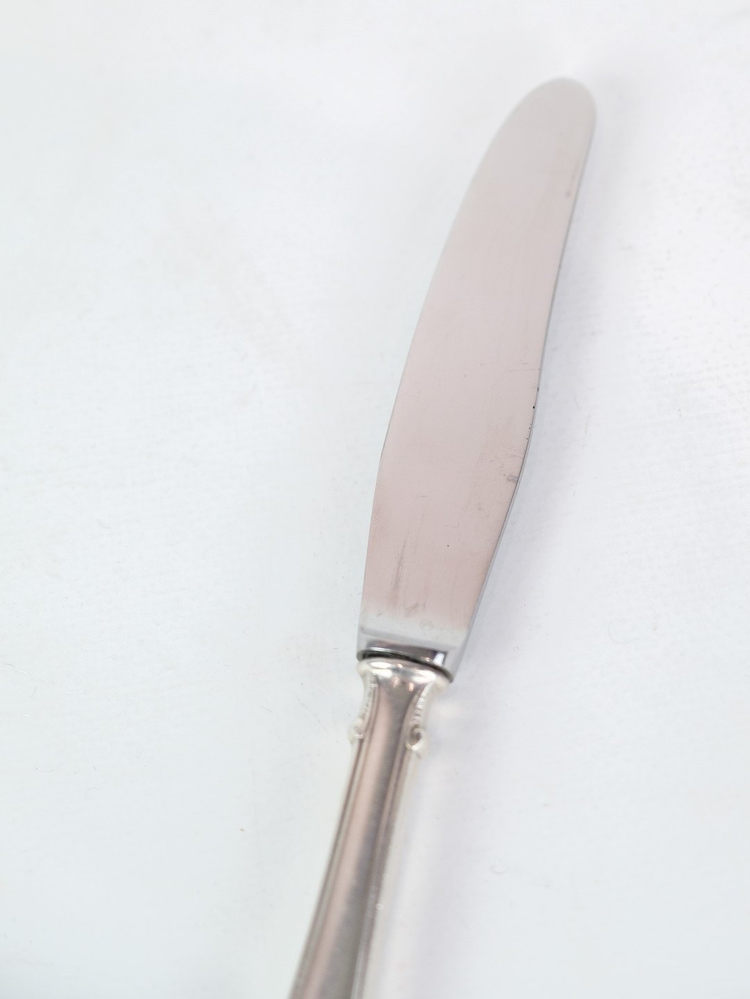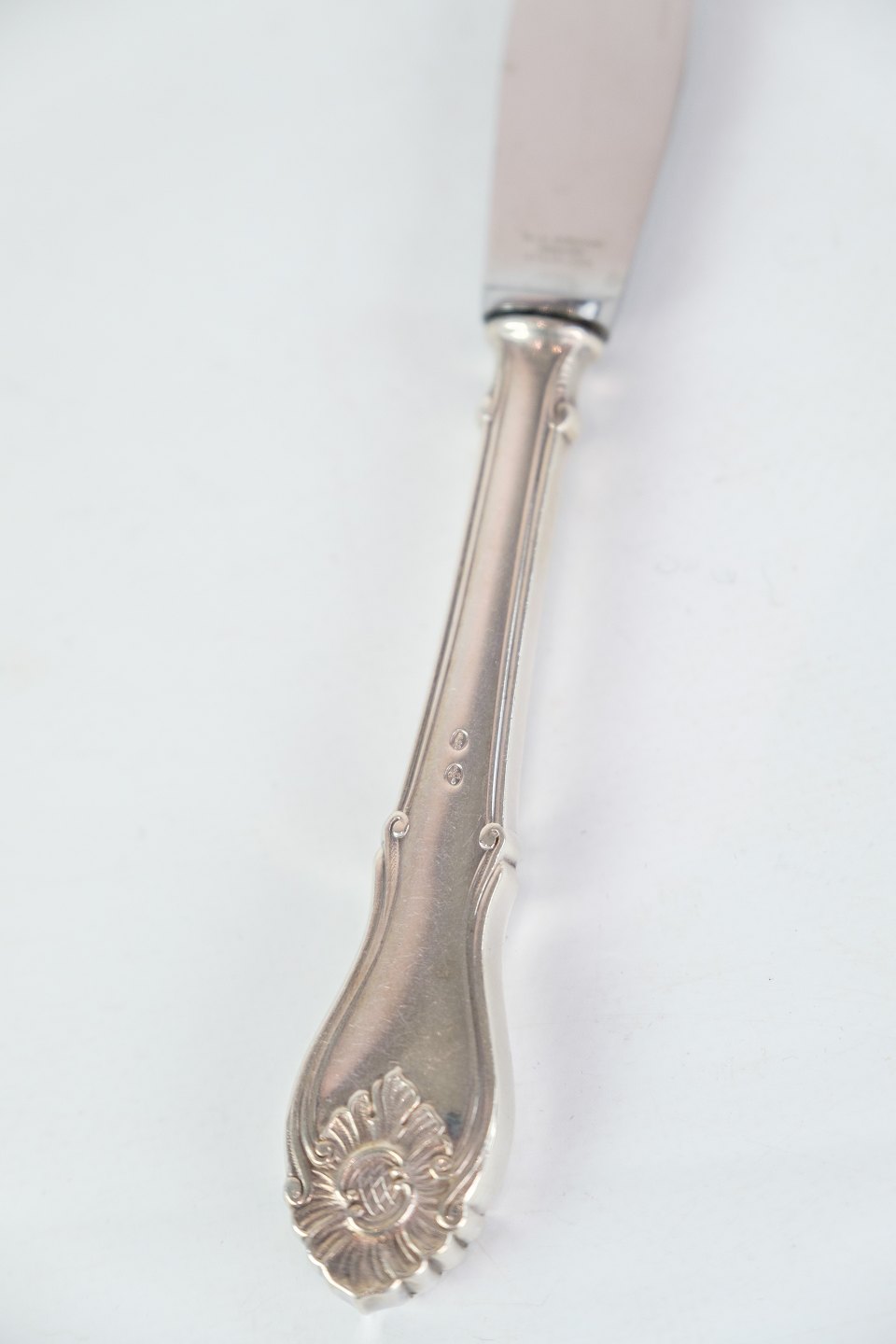 Rococo dinner knife of Danish silver cutlery in the three tower 830s manufactured at Horsens silverware factory.